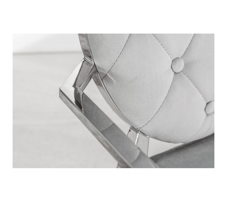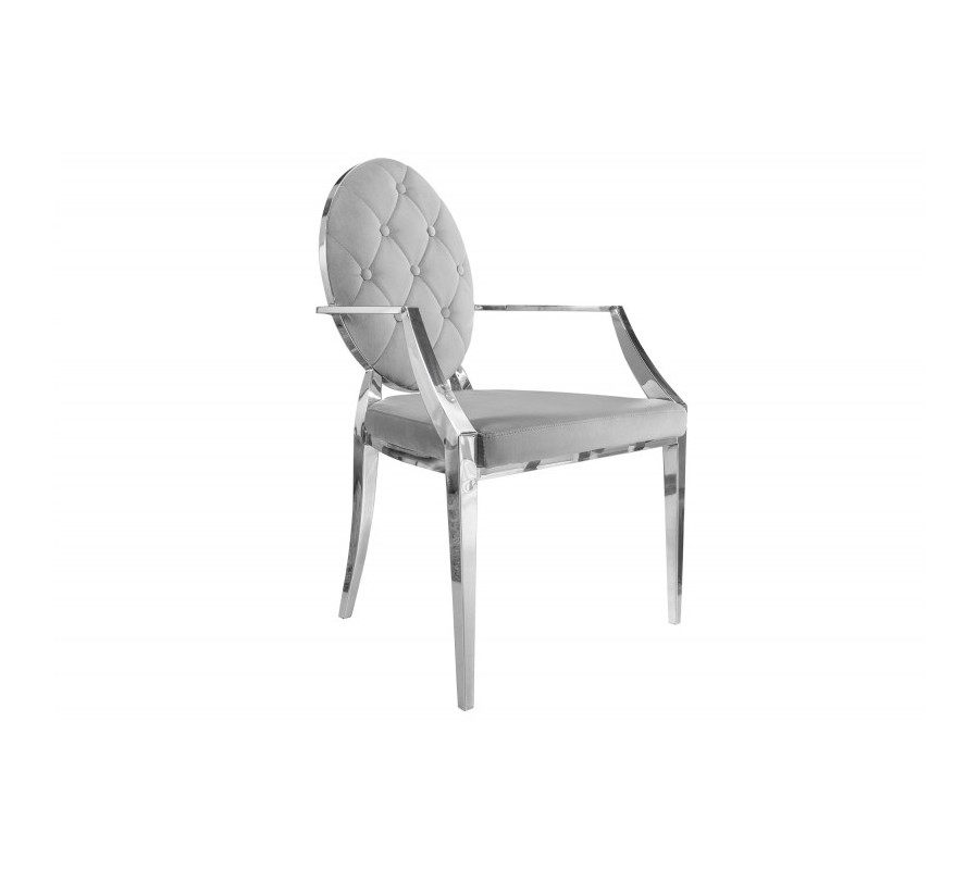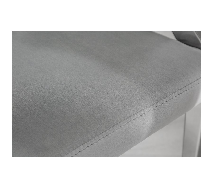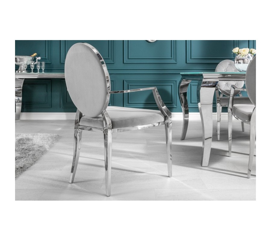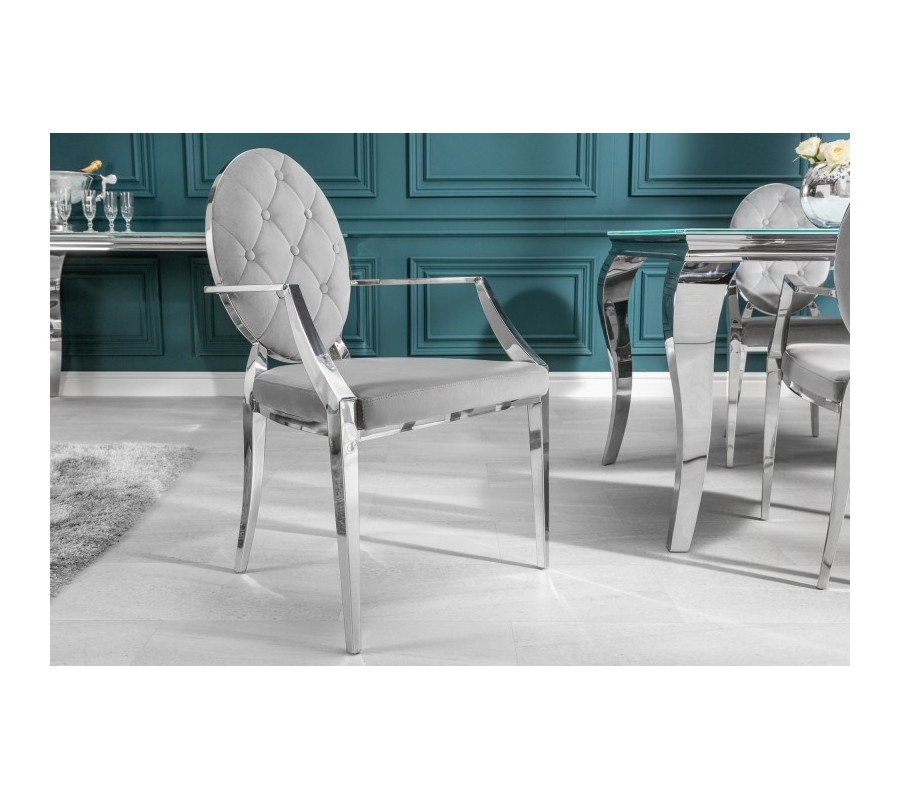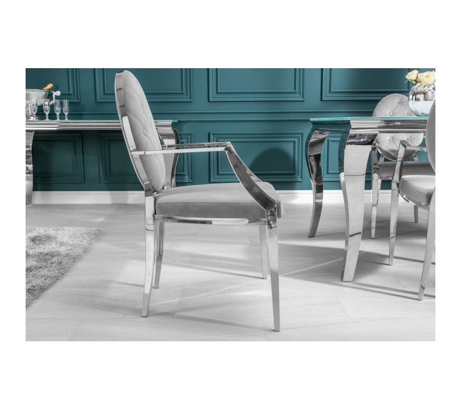 Luxusná jedálenská stolička z kolekcie Modern Barock II je jedinečnou stoličkou kombinujúcou klasické barokové prvky s moderným dizajnom. Stolička prináša vysoko pohodlné sedenie vďaka vystuženým častiam doplneným o detaily v podobe švov. Celá stolička je vyrobená z lesklej nerezovej ocele, čo v kombinácii so sivým poťahom tvorí elegantný dizajn, ktorý dodá interiérom prepychový vzhľad. Stolička najviac zapadne do moderne a dizajnovo zariadených miestností, kde vynikne unikátnym vzhľadom.