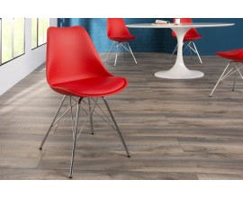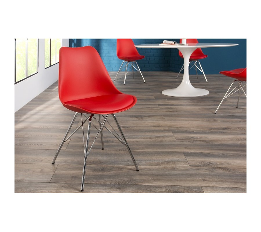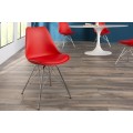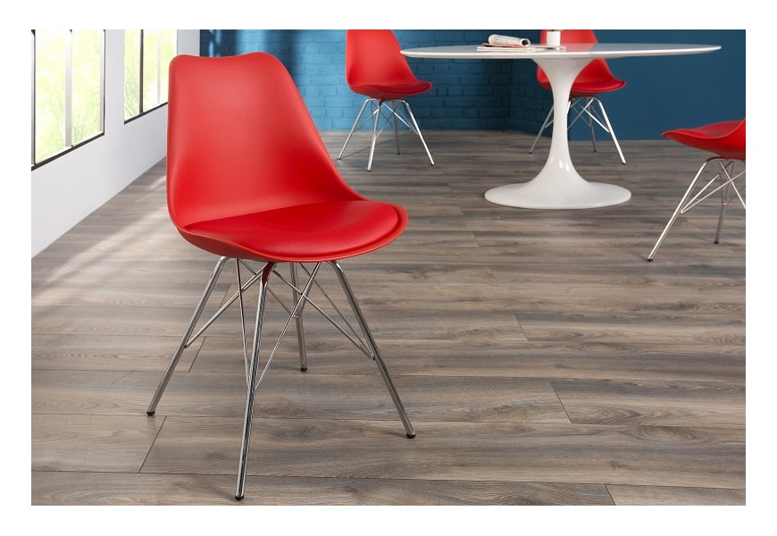 Dizajnová stolička Scandinavia v jasnej a veselej červenej farbe rozžiari každú miestnosť. Vďaka svojmu dizajnu, ktorý čerpá z retro štýlu sa hodí do retro zariadených interiérov, ale neublíži ani v moderných miestnostiach. Stolička má pochrómované kovové nohy, čo im dodáva unikátny lesk. Ostatné časti stoličky sú vyrobené z polyuretánu a plastu. Stolička ponúka nielen štýlový dizajn, ale aj pohodlné sedenie vďaka vystuženému sedadlu s imitáciou kože.