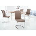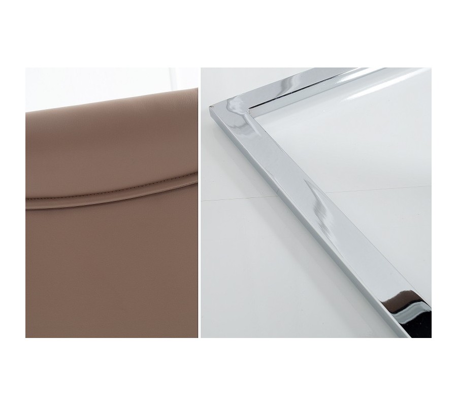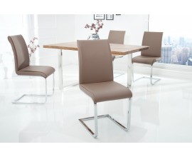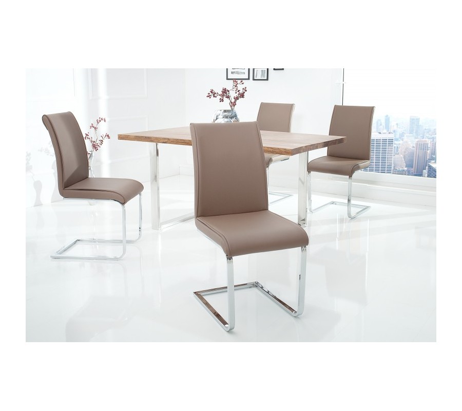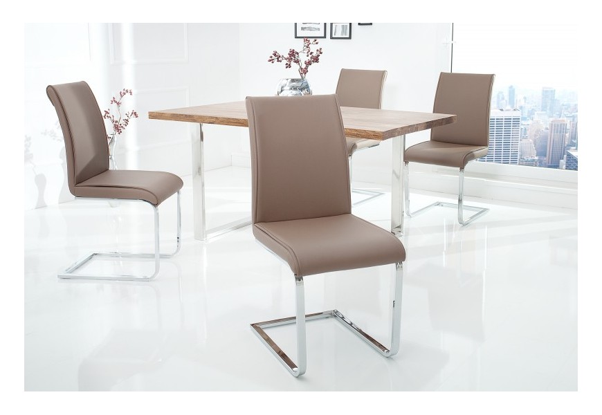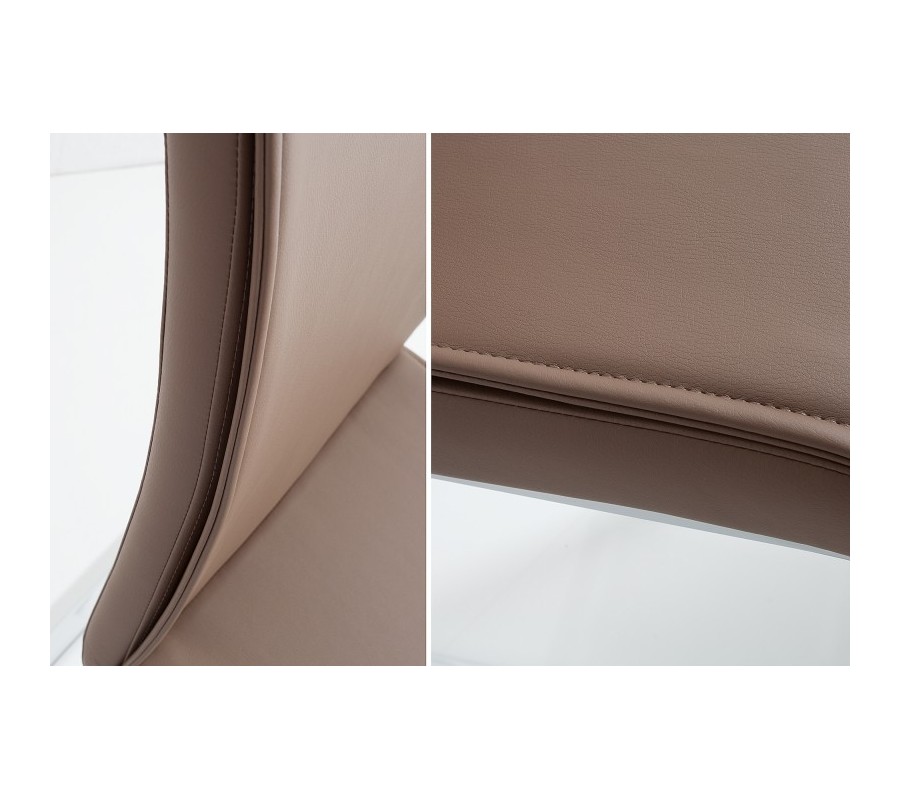 Dizajnová jedálenská stolička Elegance v neutrálnom a nadčasovom farebnom prevedení očarí svojim jednoduchým, moderným dizajnom. Jednoduchú chrómovanú konštrukciu dopĺňa pohodlné sedadlo s operadlom potiahnuté kvalitnou ekokožou v príjemnom, hnedom odtieni. Stolička sa svojim dizajnom hodí najmä do moderných priestorov.