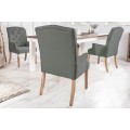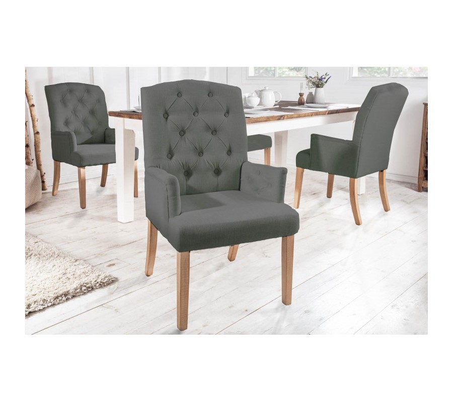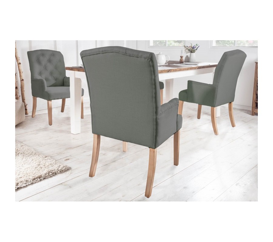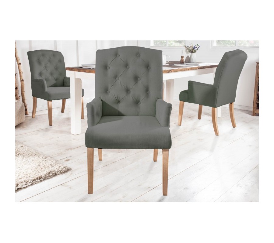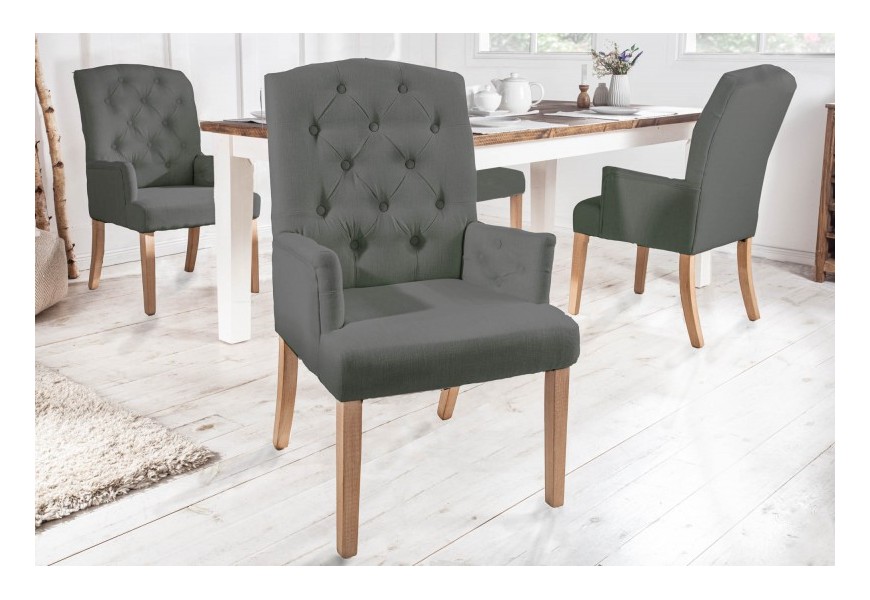 Štýlová jedálenská stolička Silloth je jedinečným dizajnovým kúskom, ktorý vynikne v každom vintage či vidiecky ladenom interiéri. Vkusné čalúnenie v sivej farbe vám zaručí dokonalé pohodlie pri stolovaní či práci. Zaujímavým prvkom je chesterfield prešívanie na operadle a podrúčkach, ktoré dodáva stoličke jedinečný vintage nádych. Drevené masívne nohy zabezpečujú skvelú stabilitu a príjemne ladia s čalúnením. Vďaka univerzálnej farebnosti sa dajú stoličky Silloth skvelo doladiť do vašich priestorov ladených v rôznych farebných škálach. Zapadnú do štýlových jedální či do luxusných konferenčných a zasadacích miestností.