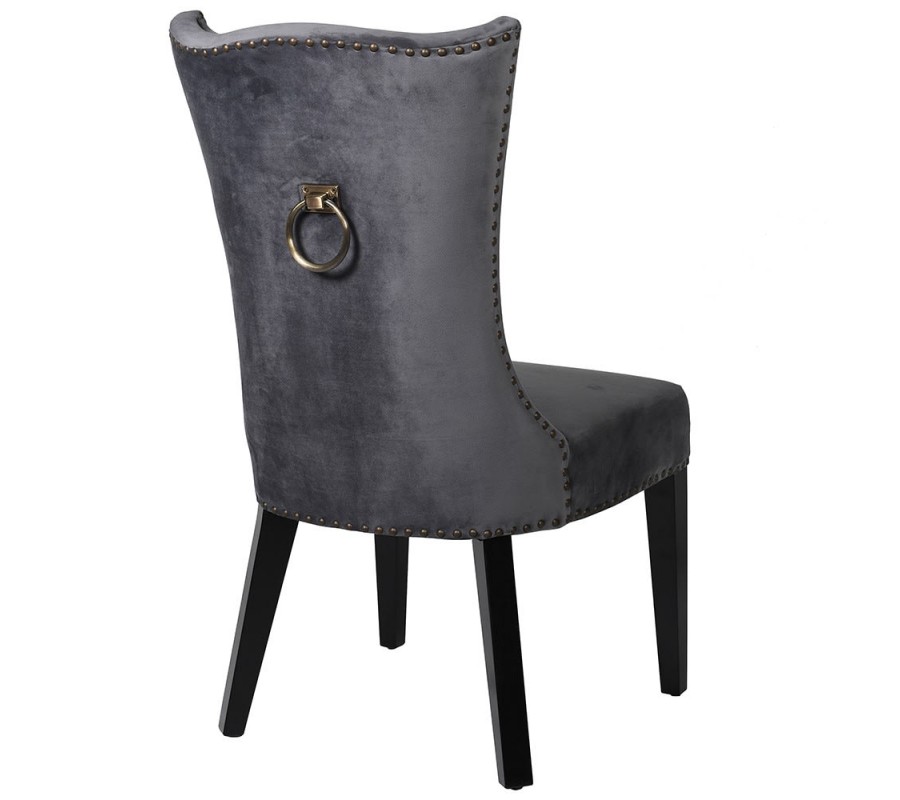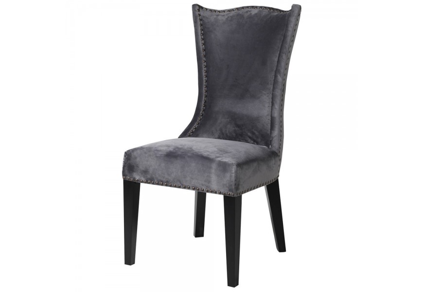 Zámocká luxusná jedálenská stolička Edrick v sivom zamatovom poťahu s čiernymi nohami a bronzovým klopadlom 103cm