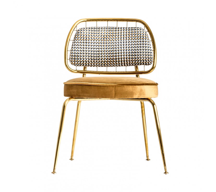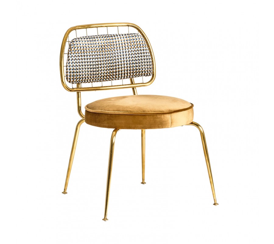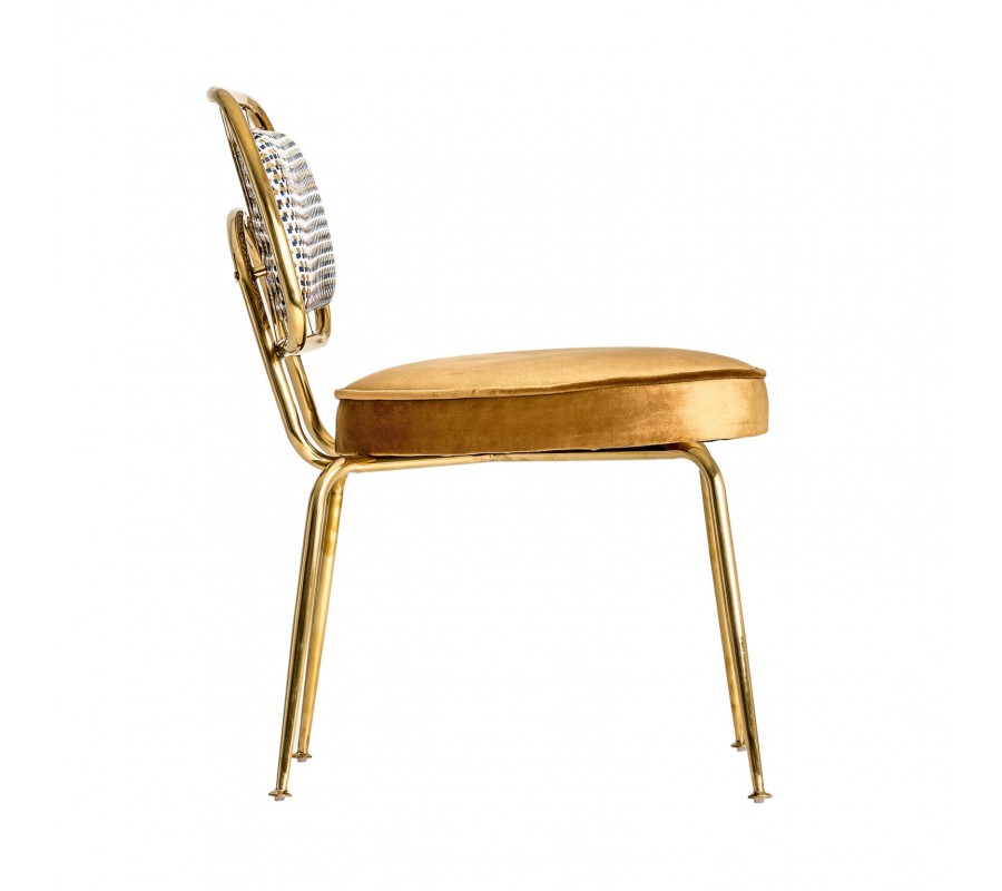 Luxusná jedálenská stolička Brilon sa stane šperkom každého luxusného interiéru s prvkami Art-deco štýlu. Stabilitu stoličky zabezpečuje lesklá kovová konštrukcia v zlatom odtieni, ktorá sa harmonicky dopĺňa so zamatovým leskom jej poťahu. Horčicový poťah na sedadle je kontrastne doplnený vzorovaným poťahom operadla s geometrickým Art-deco motívom. Môžete ju kombinovať s jedálenskými stolmi z masívneho dreva s exotickou kresbou, luxusnými kamennými povrchmi či prvkami z lesklého kovu. Stoličku Brilon odporúčame kombinovať s prvkami z našej rovnomennej kolekcie, v ktorej nájdete širokú ponuku produktov v rovnakom štýle.