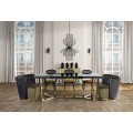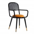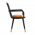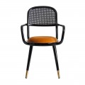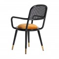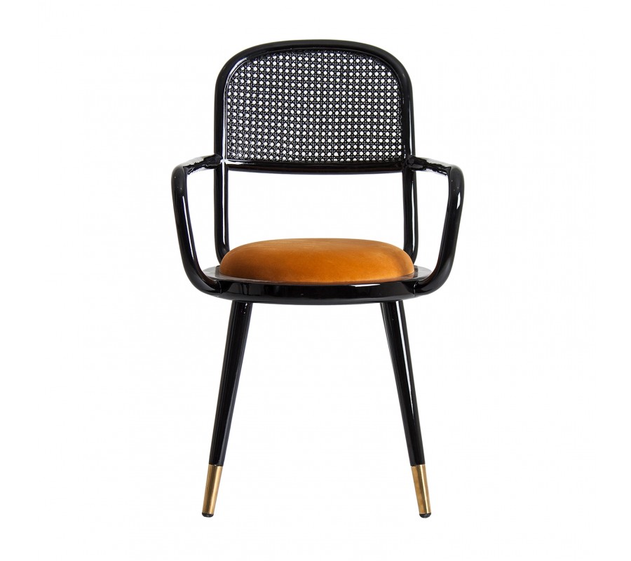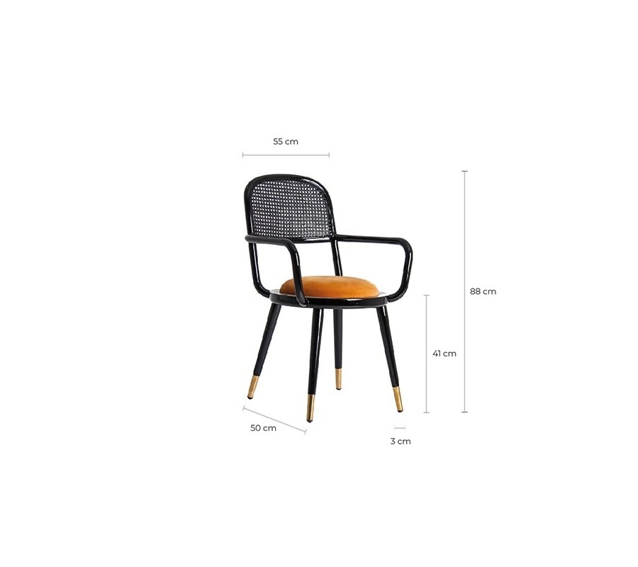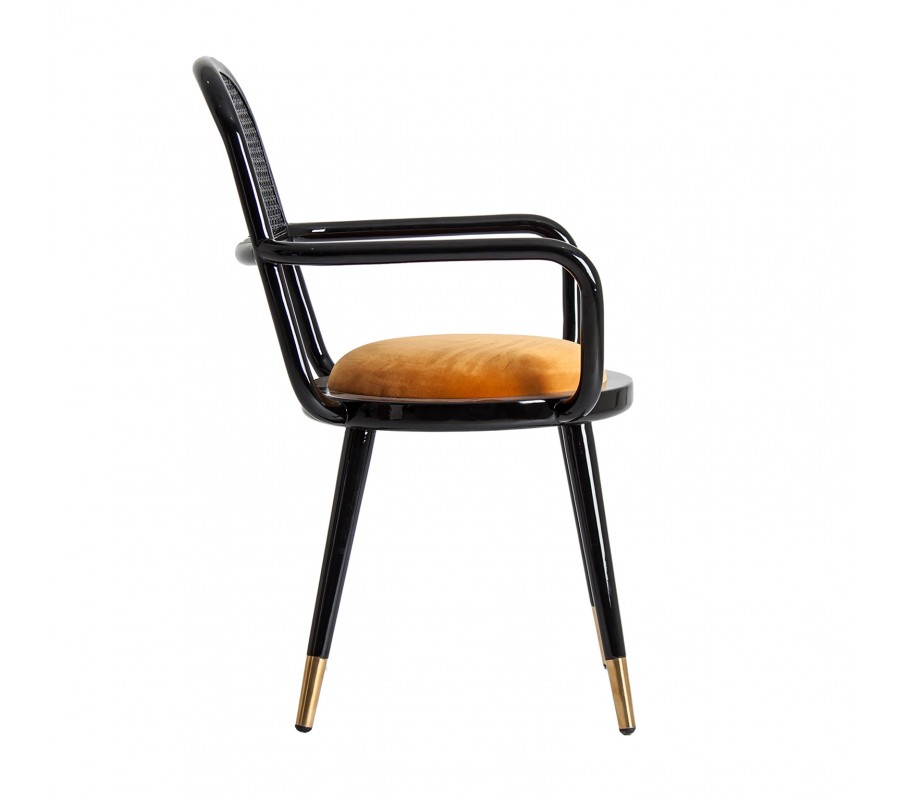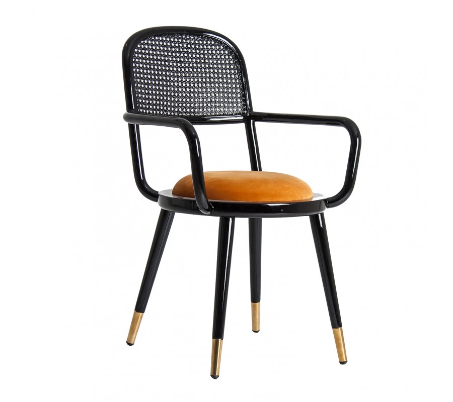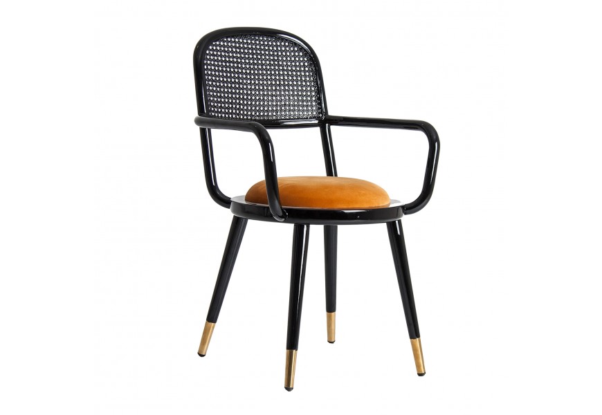 Luxusná jedálenská stolička Brilon z ohýbaného masívneho dreva v tmavom odtieni čiernej sa stane elegantným a zároveň sviežim prvkom vášho interiéru. Tmavé masívne operadlo je doplnené ratanovým výpletom v rovnakom odtieni a v kombinácii s kruhovým čalúneným sedadlom v horčicovej farbe vytvára zaujímavý kontrast. Elegantná čierna farba dreva je na nohách ukončená zlatými detailmi, ktoré podčiarkujú luxusnú povahu dizajnu stoličky. Stoličku môžete kombinovať s luxusnými prvkami Art-deco štýlu, ktoré sú charakteristické lesklými luxusnými povrchmi, zamatovými textíliami a nezameniteľným dizajnom. Luxusnú jedálenskú stoličku môžete vo vašom interiéri doplniť prvkami v rovnakom štýle z našej kolekcie Brilon.