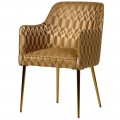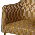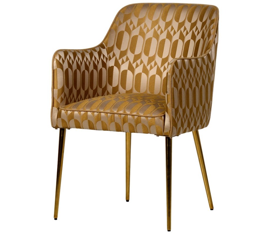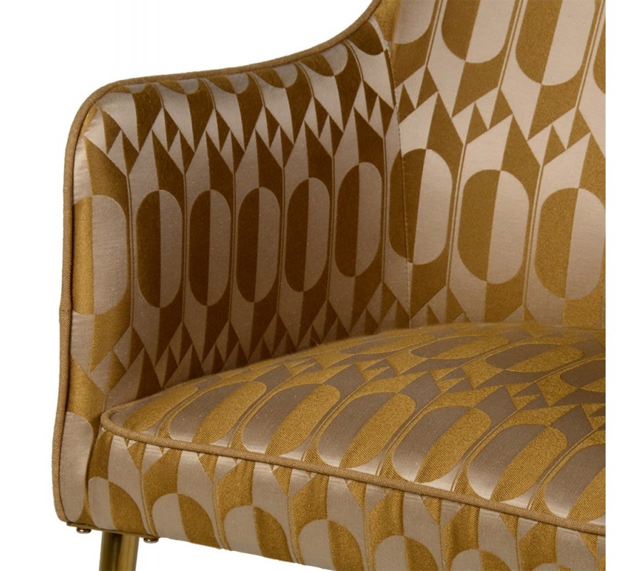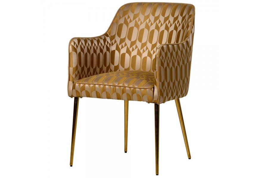 Luxusná stolička Glamoure I je čalúnená vo výraznom vzorovanom poťahu s geometrickým zrkadlovým vzorom v štýle Art-deco. Zlatý odtieň poťahu sa dokonale dopĺňa s tenkými kovovými nohami. Komfort počas sedu je okrem kvalitného čalúnenia zabezpečený praktickými opierkami na ruky. Tento mimoriadny kúsok môžete doplniť luxusnými prvkami lesklého Art-deco štýlu. Môžete ju kombinovať s jedálenskými stolmi z masívneho dreva s exotickou kresbou, luxusnými kamennými povrchmi či prvkami z lesklého kovu.