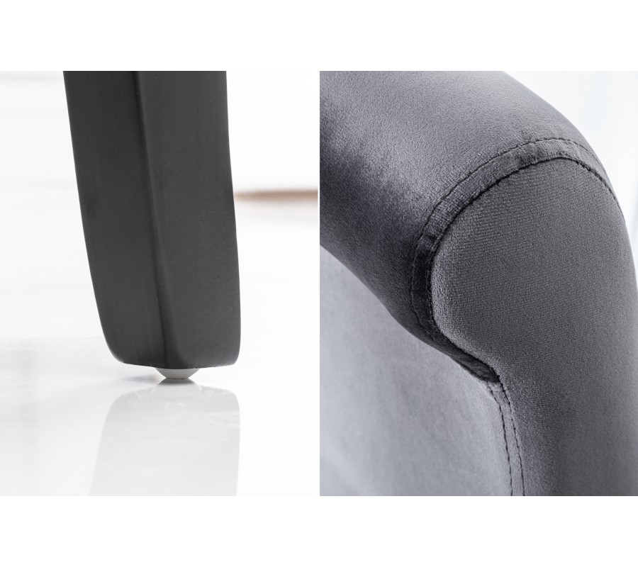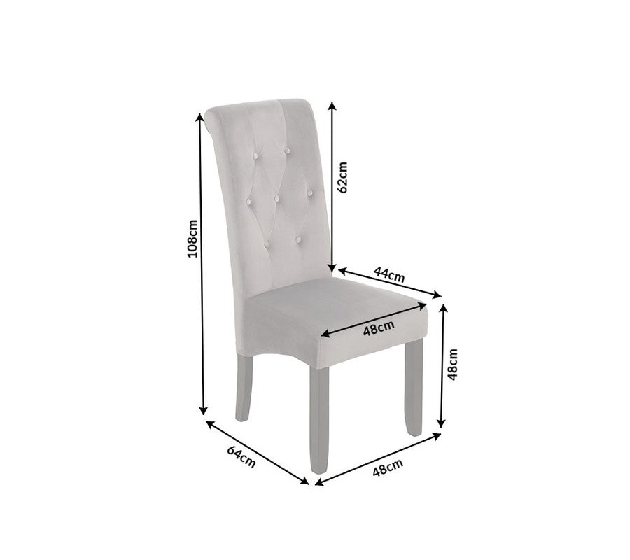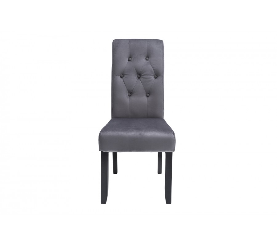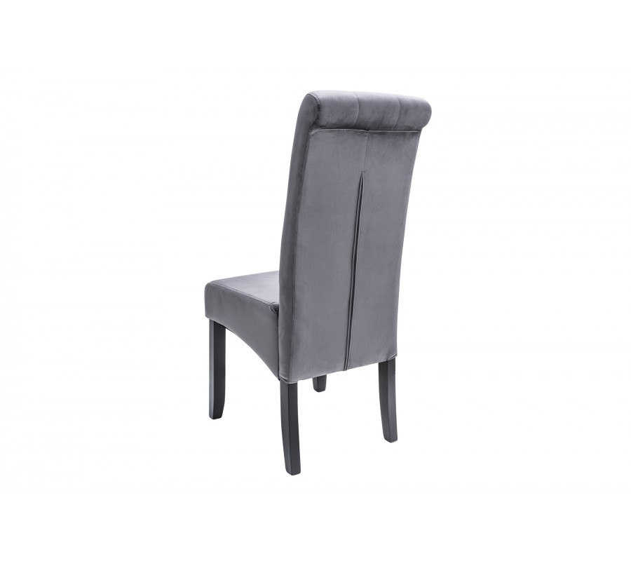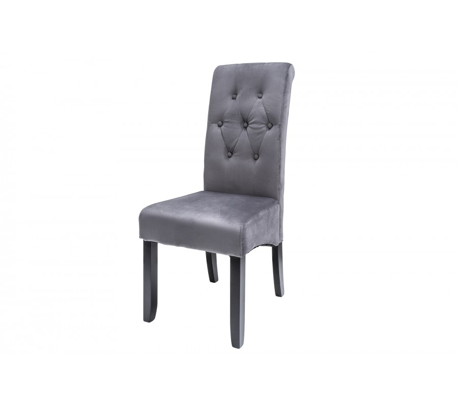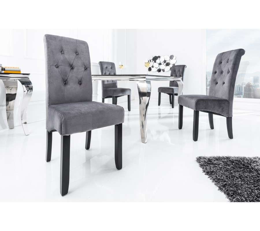 Štýlová jedálenská stolička Valentino s vysokým čelom predstavuje elegantné spojenie klasického vzhľadu a pohodlia. Je čalúnená jemným sivým zamatom, ktorý pôsobí luxusne a príjemne na dotyk. Vysoké operadlo je ozdobené klasickým gombíkovým prešívaním v kosoštvorcovom vzore, ktorý pridáva na výraze a sofistikovanosti.