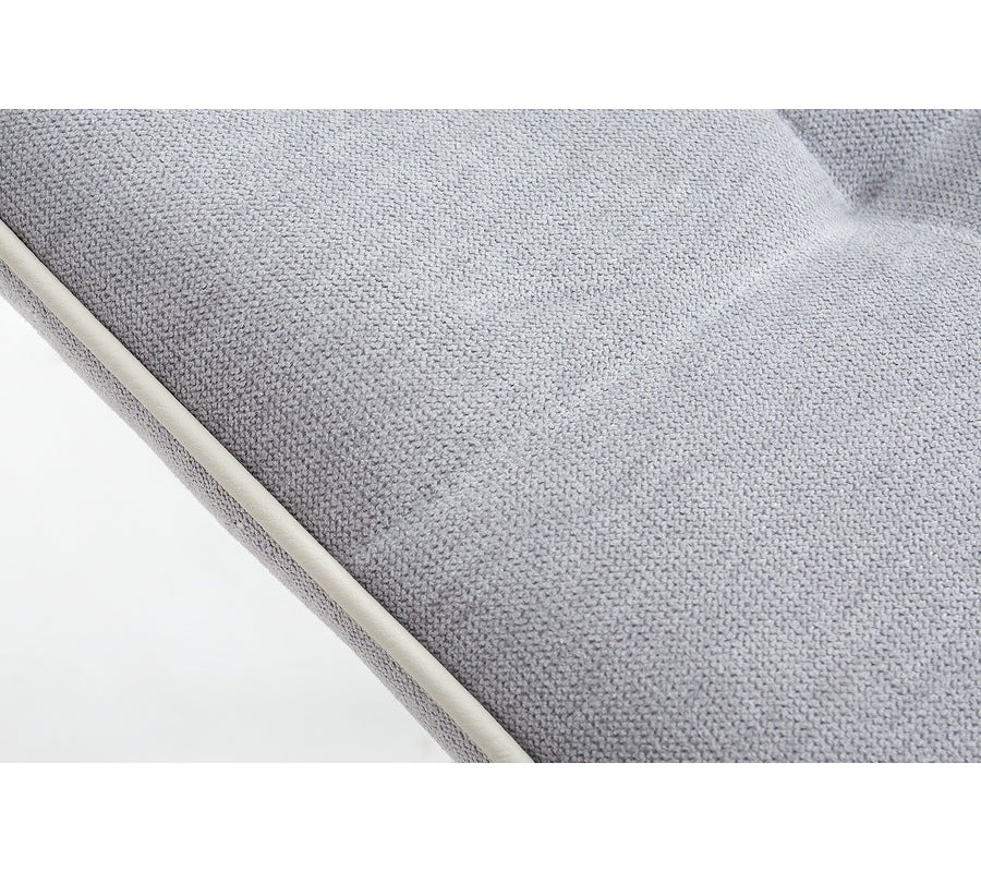 Stabilná kovová podstava v tvare U má plynulé prepojenie predných tyčí s tými zadnými, čím vytvára harmonický celok. Štvorcové prešívanie rozčleňuje poťah a pridáva jemnú štruktúru. Kontrastné lemovanie po obvode sedadla zvýrazňuje línie a dodáva stoličke dekoratívny akcent.