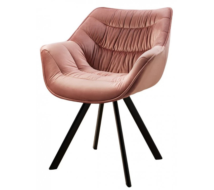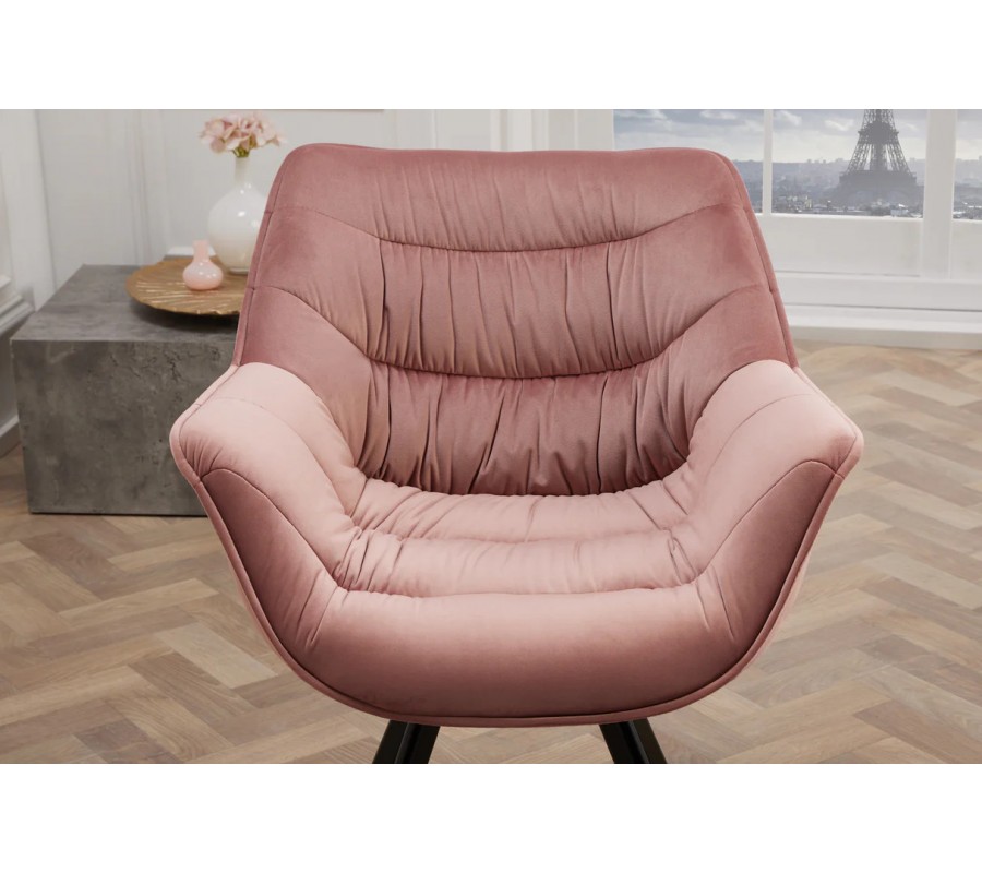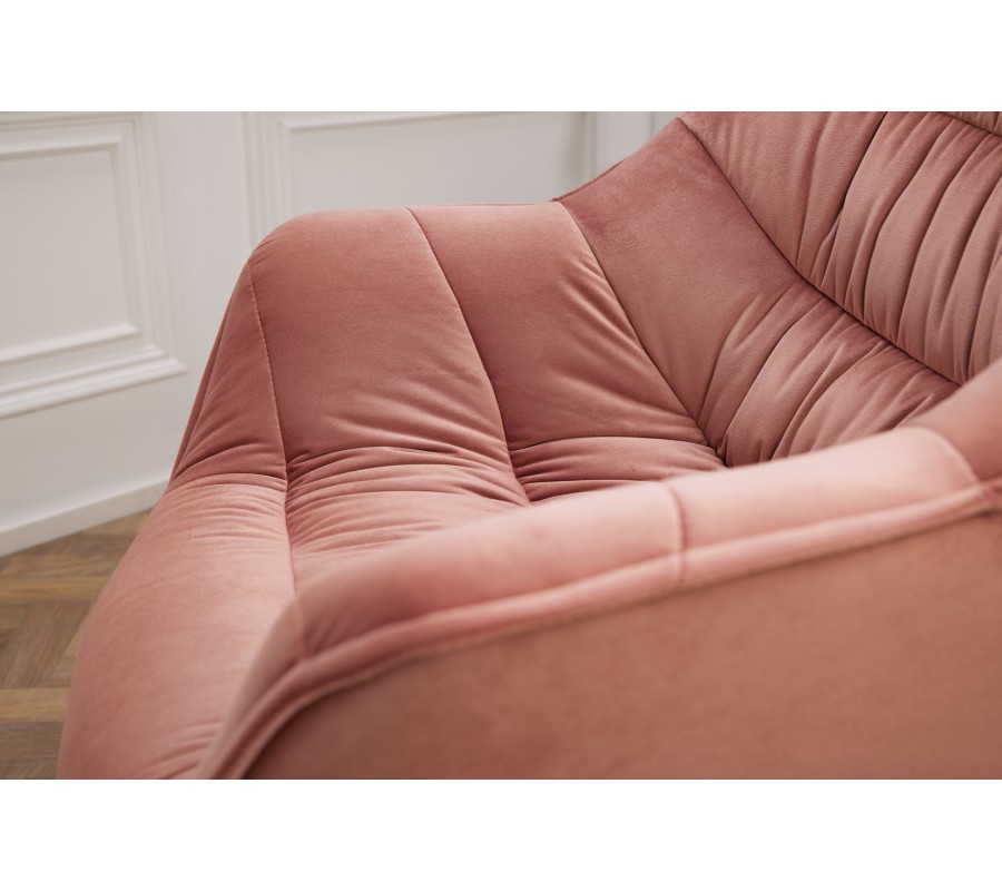 Sedacia konštrukcia stoličky je potiahnutá na dotyk hebkou zamatovou látkou v luxusnom staroružovom farebnom odtieni. Dekoratívne prešívanie na vnútornej strane a lemovanie po obvode, pripomína ikonické kreslá zo 60. rokov. Tento retro detail však pôsobí sviežo vďaka modernému prevedeniu a štýlovéj farebnosti. Tvar sedadla je mierne zaoblený a priestranný, čo zaručuje maximálny komfort aj pri dlhšom sedení.
