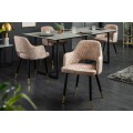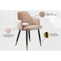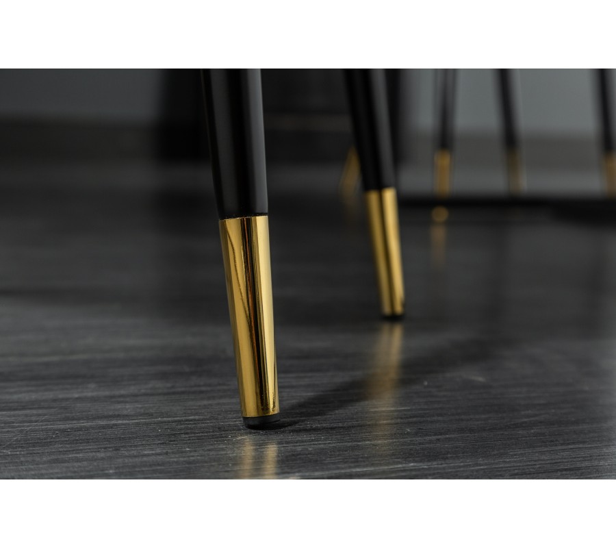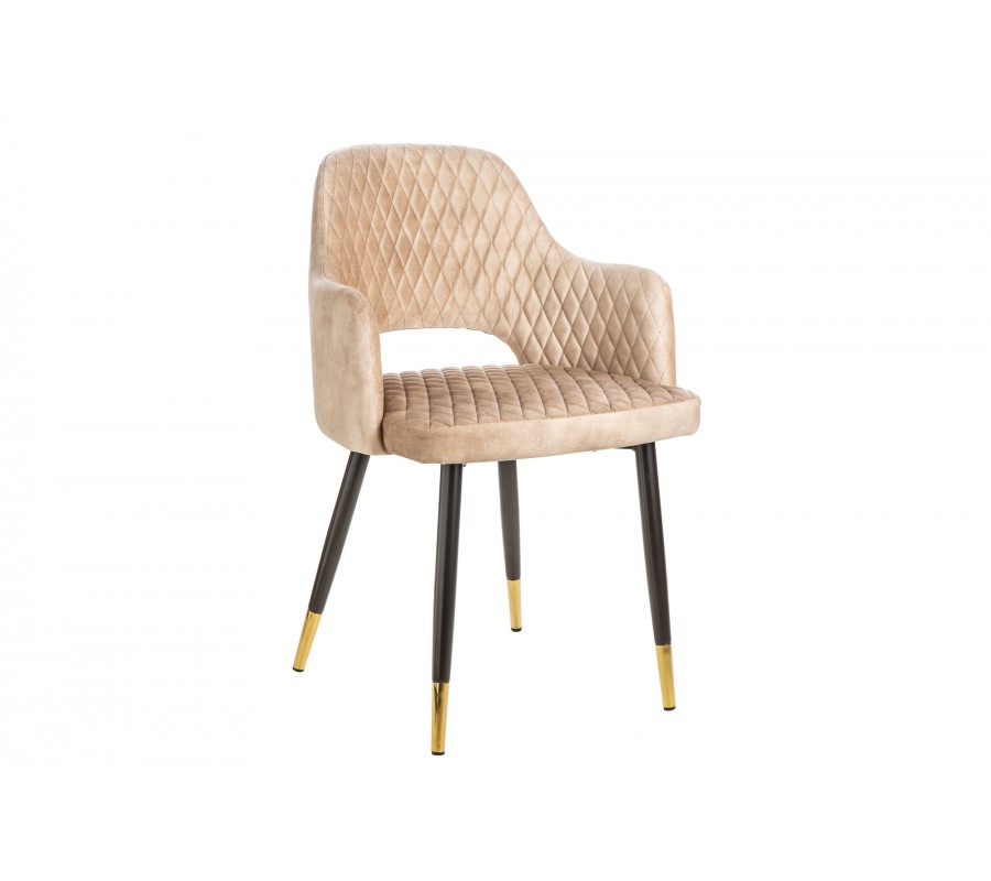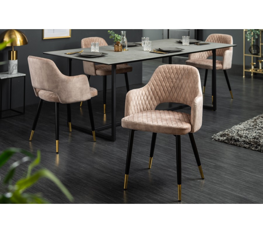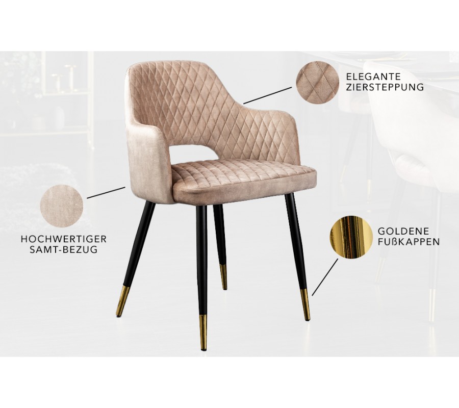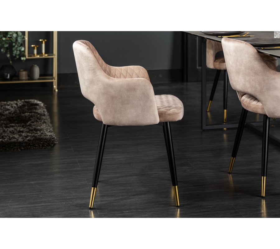 Stolička Fribourg je štýlovým a elegantným kúskom, ktorý sa nesie v populárnom art-deco štýle. Upúta vás príjemným poťahom zo zamatu v svetlej béžovej farbe v kombinácii s čiernymi kovovými nožičkami. Spodná časť nožičiek zlatej farby vytvára luxusný art-deco vzhľad, ktorý krásne vynikne v moderných interiéroch. K dokonalému komfortu pri stolovaní či práci vám dopomôže tvarované operadlo, podrúčky a taktiež príjemný poťah zo zamatu. Stoličky Fribourg možno využiť v obývačke, kuchyni či jedálni, ale napríklad aj vo firemných či hotelových priestoroch v konferenčných miestnostiach. Krásne zapadne do tmavších priestorov a dokonalý dojem vytvoríte kombináciou s kovovými dekoráciami v čiernej alebo zlatej farbe. Nosnosť max 120kg.