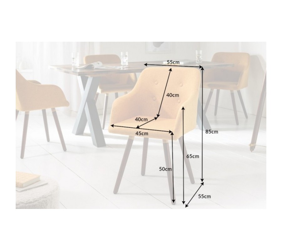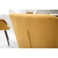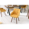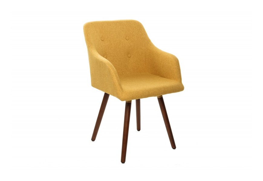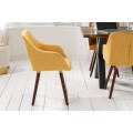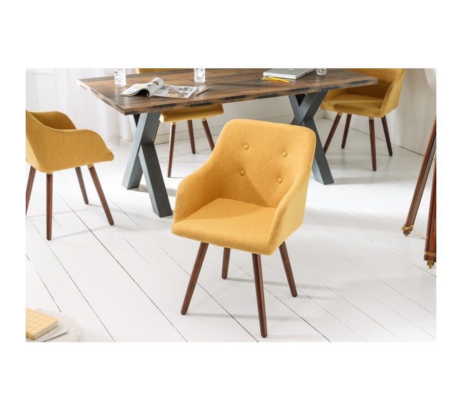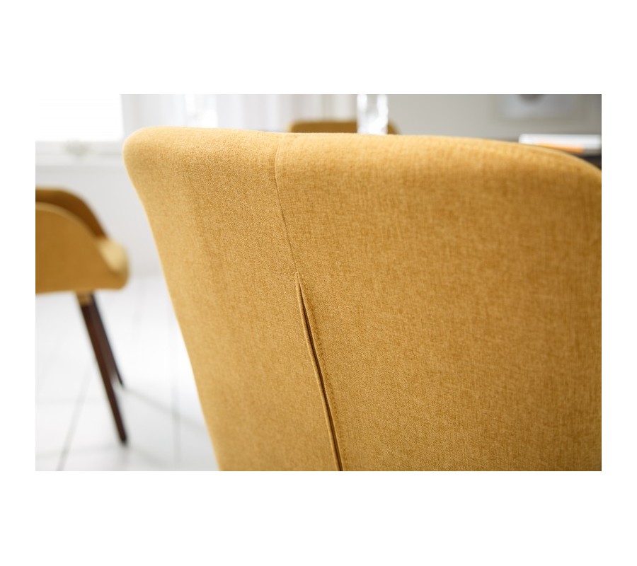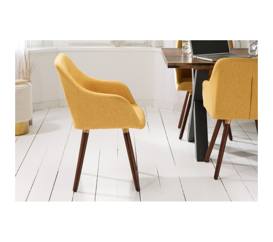 Nadčasový dizajn stoličky Scandinavia čerpá inšpiráciu v stále obľúbenom retro štýle. Čalúnenie sedacej časti plynule prechádza cez opierky na ruky až k operadlu a poskytuje tak dokonalé pohodlie aj počas dlhého sedu. Žltý odtieň odolného poťahu je doplnený teplým odtieňom nožičiek s dreveným povrchom. Okrem doplnenia interiérov v retro dizajne sa stoličky nestratia ani v priestore škandinávskymi prvkami. Jasnú žltú farbu môžete použiť ako príjemný kontrast v neutrálne sfarbenom priestore, no nemusíte sa báť kombinovať ju aj s ďalšími farbami či vzormi v interiéri.