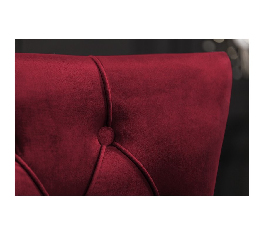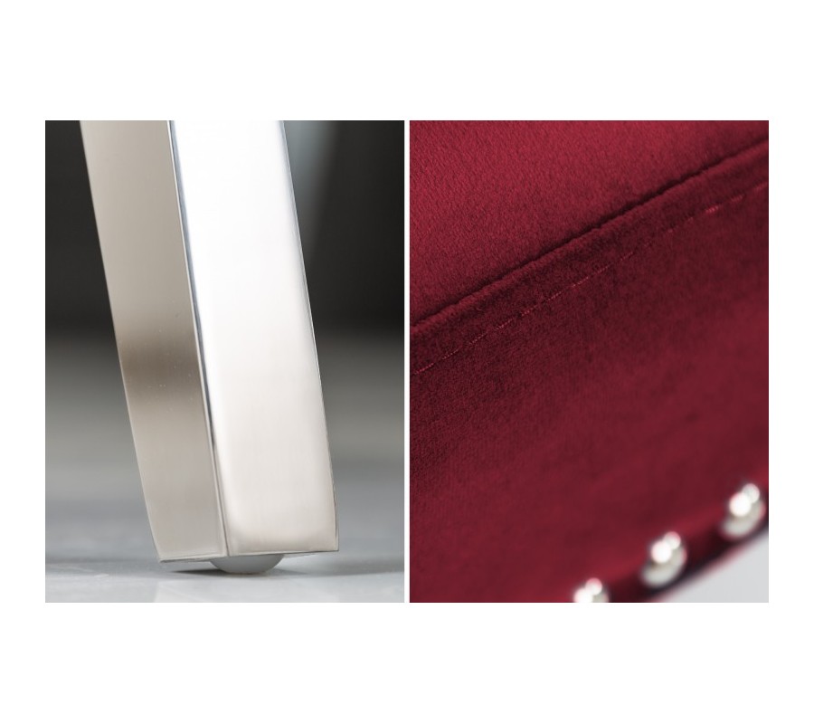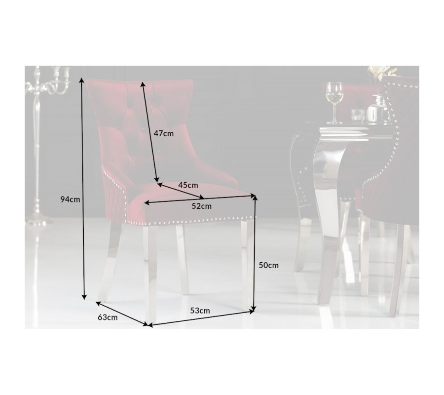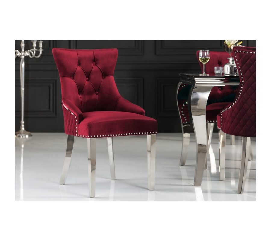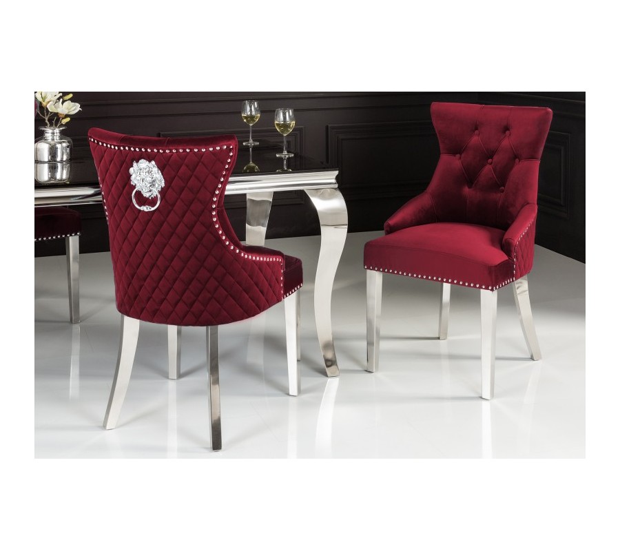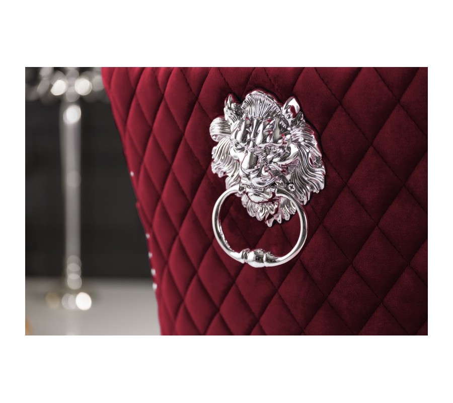 Štýlová jedálenská stolička Eleanor je dizajnovým kúskom vhodným predovšetkým do zámocky ladených jedální, kuchýň či konferenčných miestností. Zaujme predovšetkým vďaka svojmu unikátnemu vzhľadu, ktorý je tvorený luxusným zamatovým poťahom vo vínovo červenej farbe s nadčasovým chesterfield prešívaním. Lem čalúnenia zdobia kovové cvoky a na zadnej strane operadla sa nachádza dizajnový kovový kruh s podobizňou leva. Celkový vzhľad dopĺňajú kovové strieborné nožičky. Stoličky Eleanor krásne vyniknú najmä v kombinácii s kovovým, skleneným alebo zrkadlovým nábytkom.