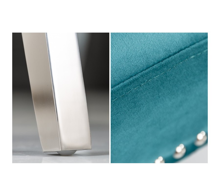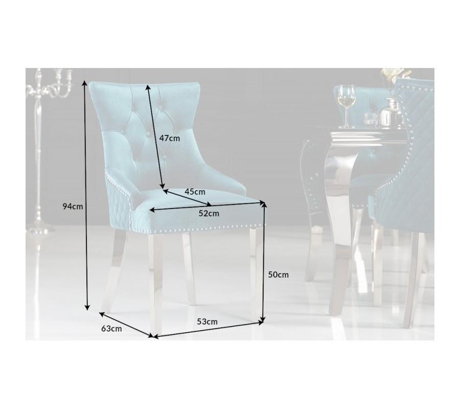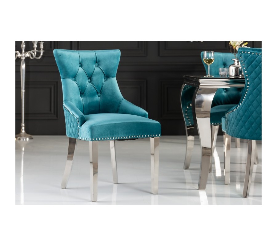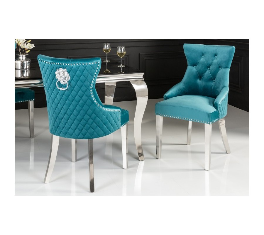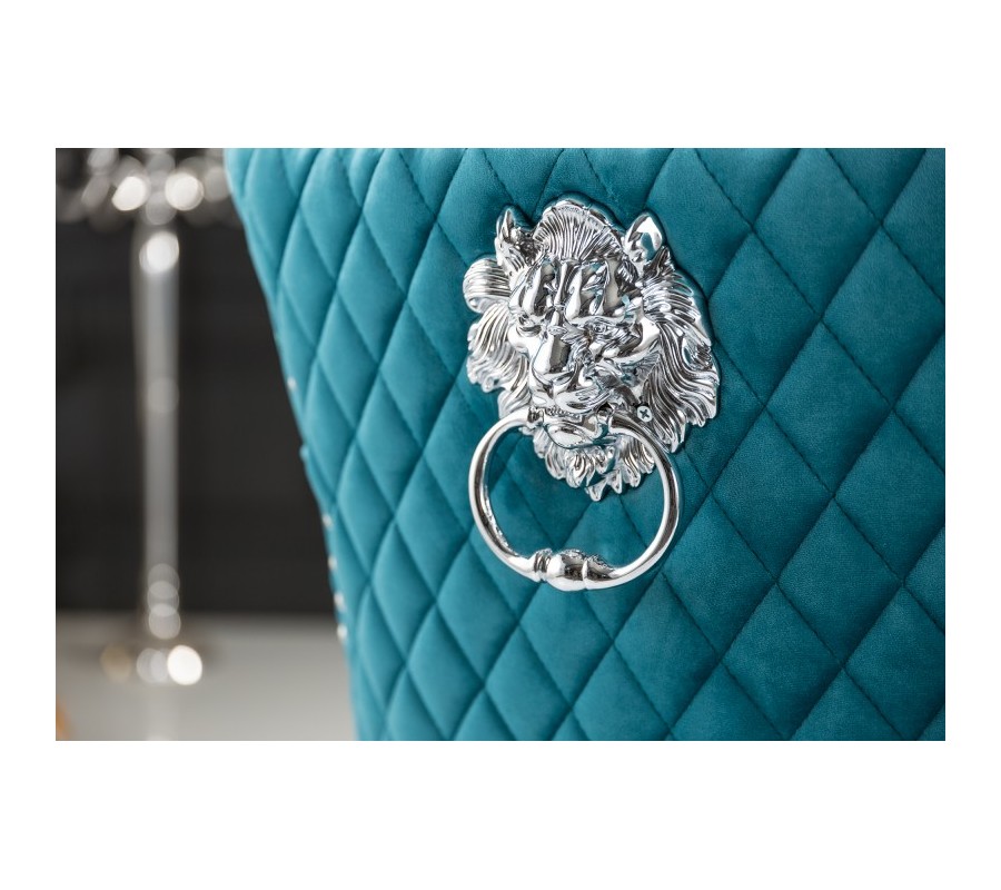 Štýlová jedálenská stolička Eleanor je kúskom vhodným do zámocky ladených jedální, kuchýň či konferenčných miestností. Je jedinečná predovšetkým vďaka svojmu unkátnemu dizajnu, ktorý je tvorený luxusným zamatovým poťahom v tyrkysovej farbe s nadčasovým chesterfield prešívaním. Lem čalúnenia zdobia kovové cvoky a na zadnej strane operadla sa nachádza dizajnový kovový kruh s podobizňou leva. Celkový vzhľad dopĺňajú kovové strieborné nožičky. Stoličky Eleanor krásne vyniknú najmä v kombinácii s kovovým, skleneným alebo zrkadlovým nábytkom.