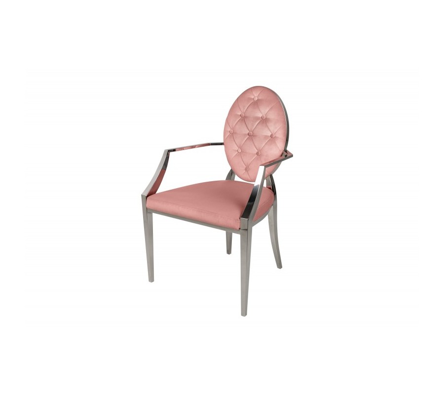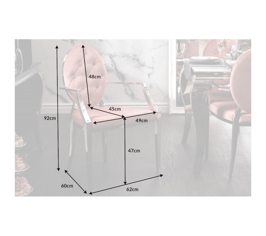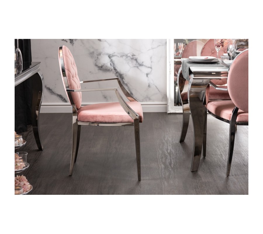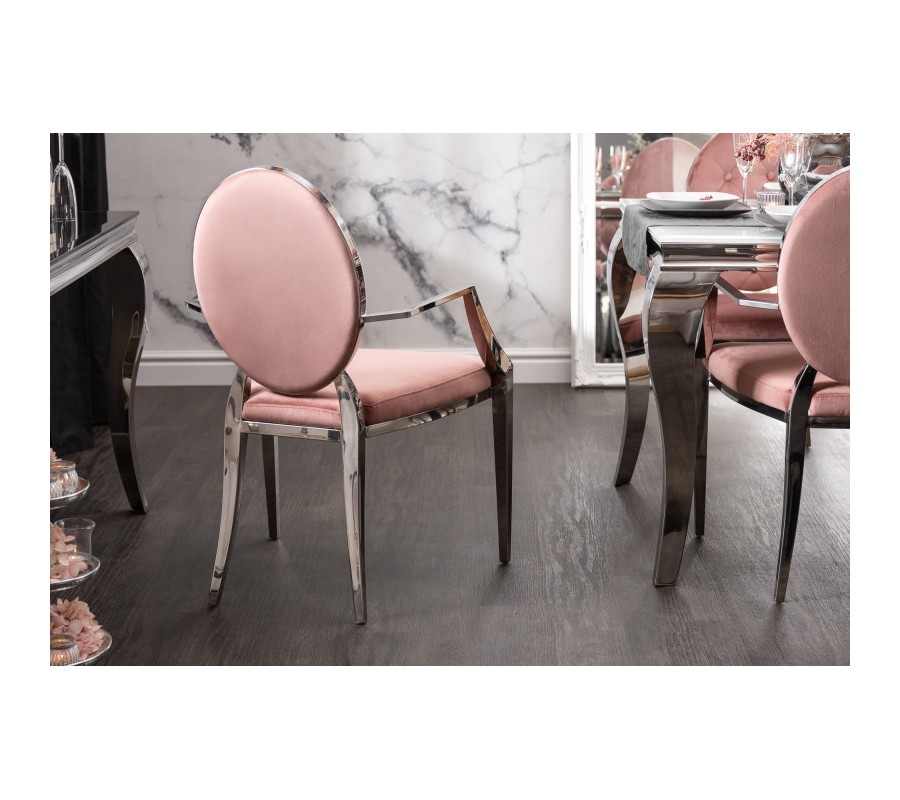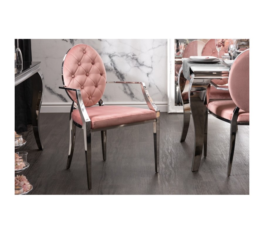 Štýlová jedálenská stolička Modern Barock zaujme svojím oválnym operadlom s chesterfield prešívaním a zamatovým staroružovým čalúnením, ktoré spríjemní vaše posedenie. Vďaka svojej jemnej farebnosti a elegantnému prevedeniu je ideálnym adeptom do klasicky ladených jedální, obývačiek či zasadacích miestností zariadených v tmavších i svetlejších odtieňoch. Stoličky Modern Barock odporúčame kombinovať s kovovým, zrkadlovým či skleneným nábytkom.