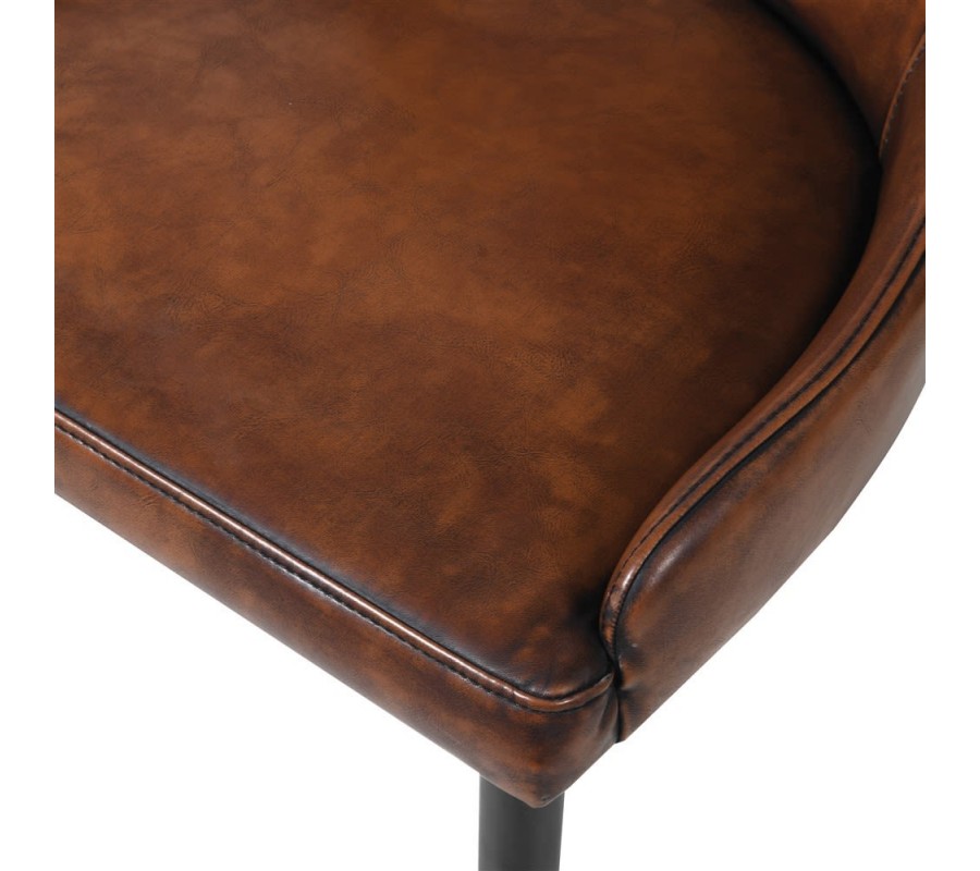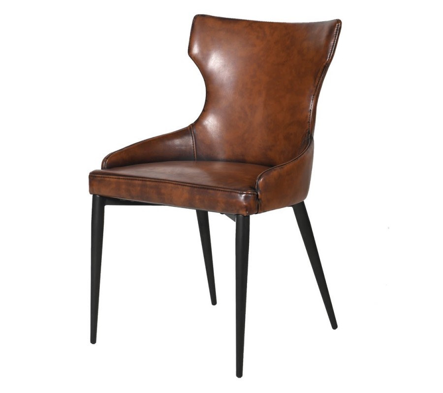 Dizajnová jedálenská stolička z našej kolekcie Bard je elegantným a štýlovým kúskom vhodným do retro alebo vintage ladených jedální, obývačiek či konferenčných miestností. Zaujme svojím elegantným čalúnením z ekokože vo vintage tmavohnedej farbe, ktoré je doplnené čiernymi kovovými nohami. Vďaka operadlu v tvare egg je stolička pohodlná aj na dlhšie sedenie. Línia operadla prechádza plynulým oblúkom do prednej časti stoličky v podobe minimalistických podrúčok. Kožený vzhľad krásne zapadne do svetlejších i tmavších priestorov a do vášho interiéru vnesie luxusný nádych. Odporúčame stoličky Bard kombinovať s masívnym jedálenským stolom, koženou sedačkou a výraznými dekoráciami vo vintage štýle.