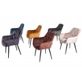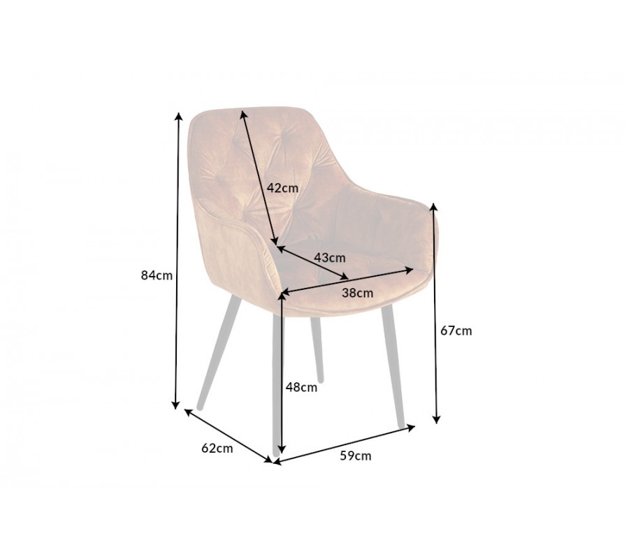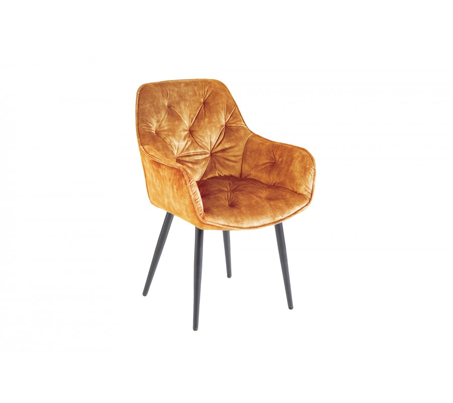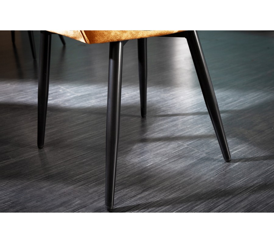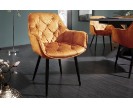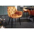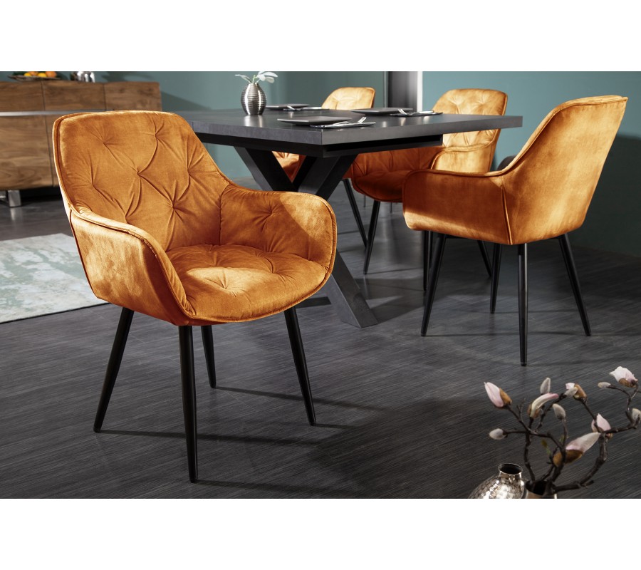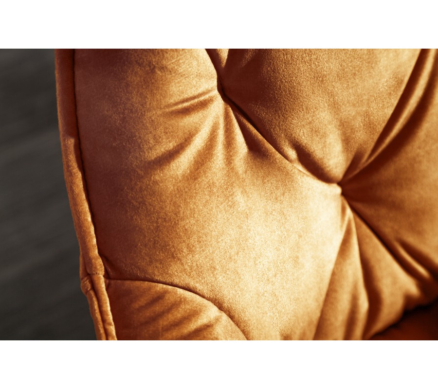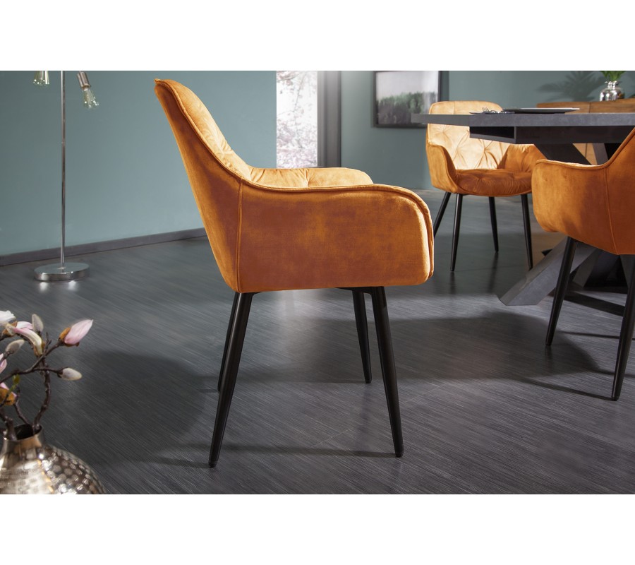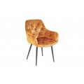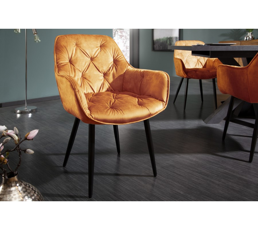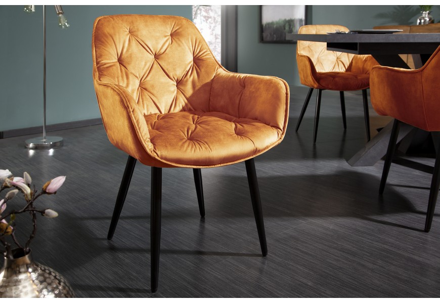 Jedinečná a nadčasová jedálenská stolička z rady Milano disponuje vkusným retro vzhľadom. Príjemná kombinácia nádherného oranžového zamatového prešívaného čalúnenia a čiernych kovových nôh pôsobí naozaj jedinečne a dokonale zapadne najmä do moderných interiérov ladených do výrazných farieb. Na jedálenskom kresle Milano Vás taktiež zaručene potešia opierky na ruky, dodávajúc tak stoličke na pohodlnosti. Nadčasové kreslo odporúčame kombinovať najmä so zlatými dekoráciami.