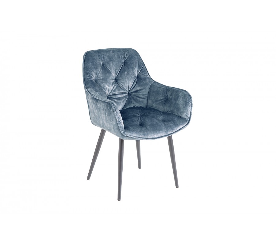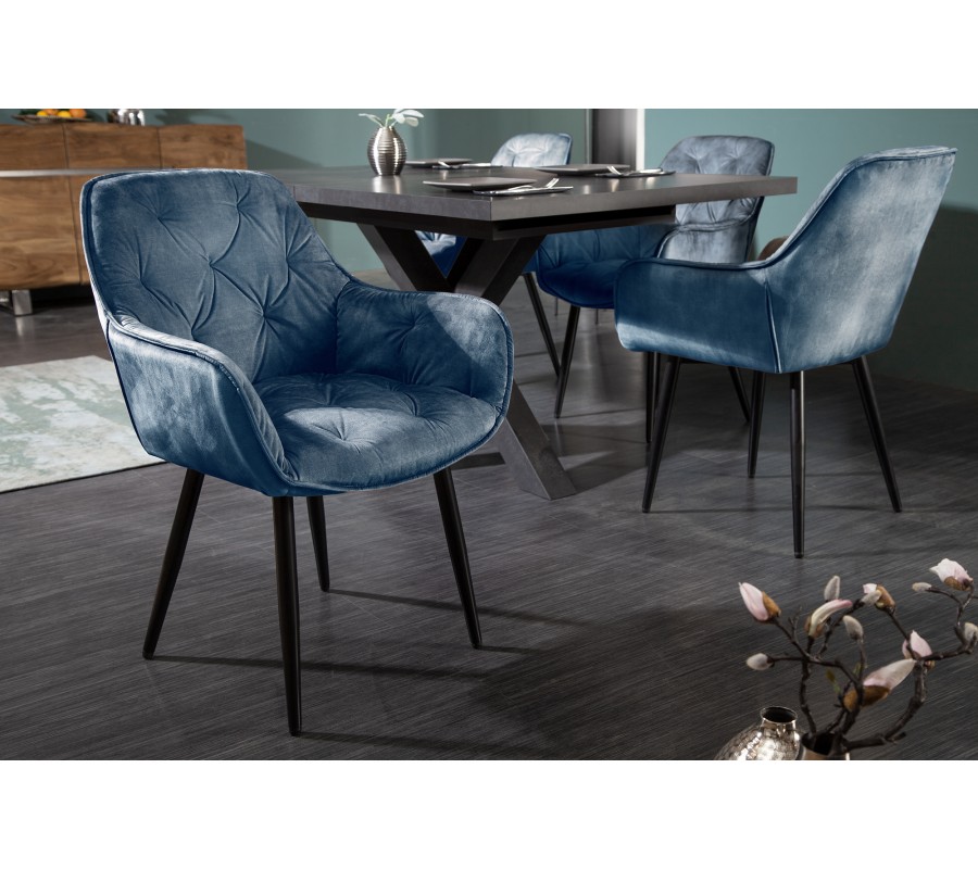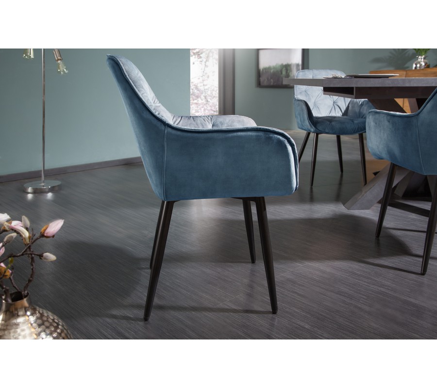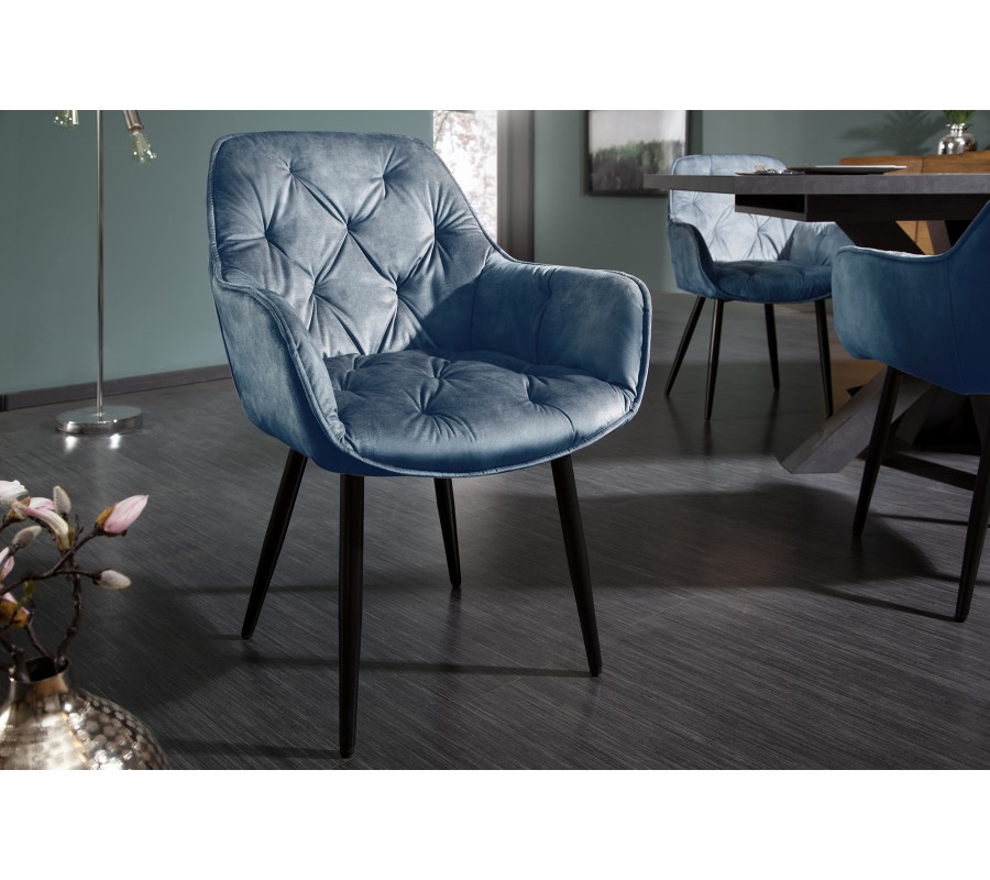 Jedinečná a nadčasová jedálenská stolička z rady Milano disponuje vkusným retro vzhľadom. Príjemná kombinácia nádherného tmavomodrého prešívaného zamatového čalúnenia a čiernych kovových nôh pôsobí naozaj jedinečne a dokonale zapadne najmä do moderných interiérov ladených do výrazných farieb. Na jedálenskom kresle Milano Vás taktiež zaručene potešia opierky na ruky, dodávajúc tak stoličke na pohodlnosti. Nadčasové kreslo odporúčame kombinovať najmä so zlatými dekoráciami.