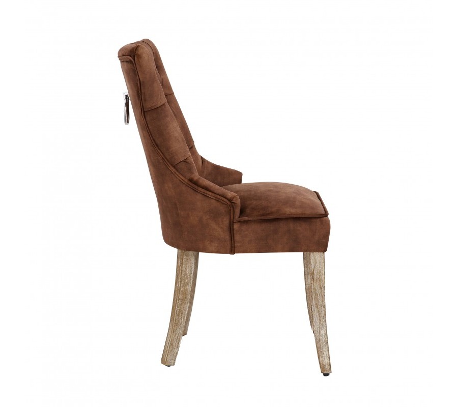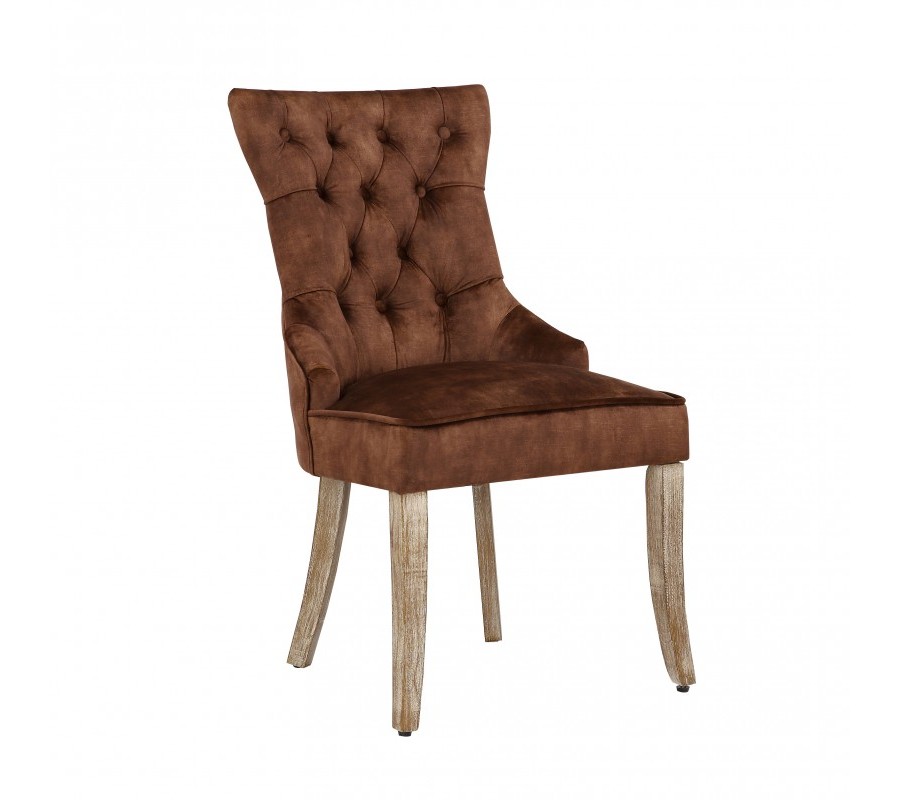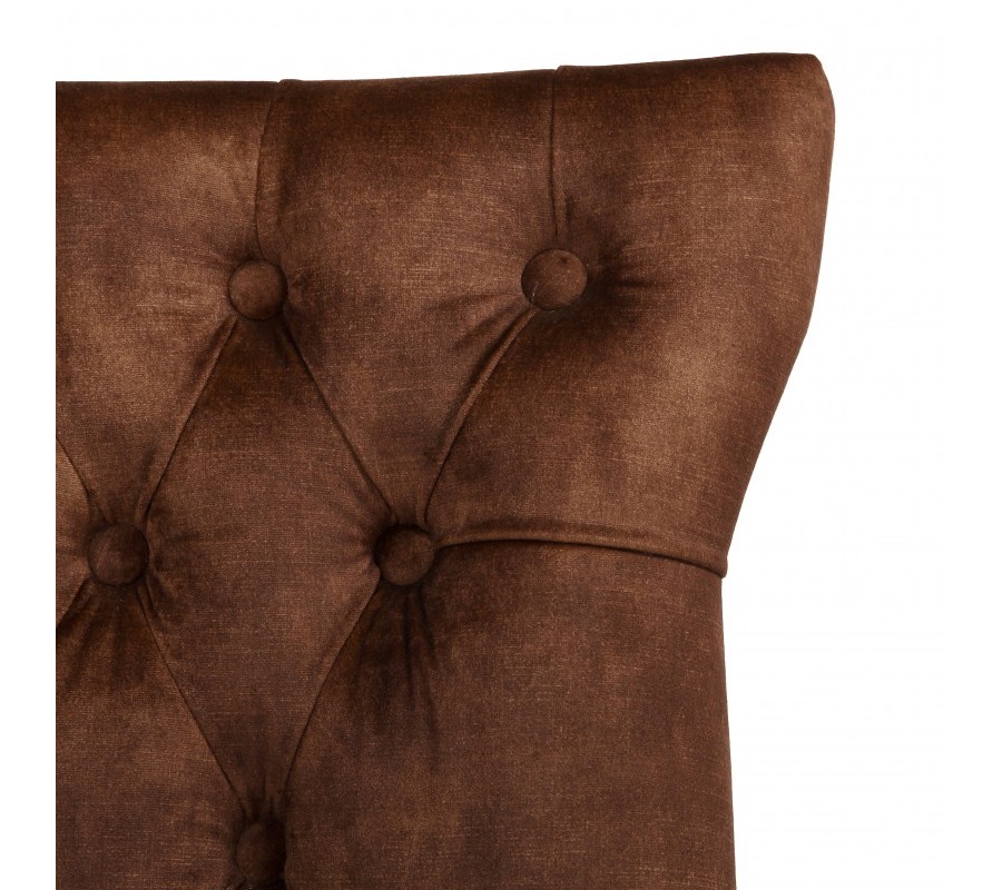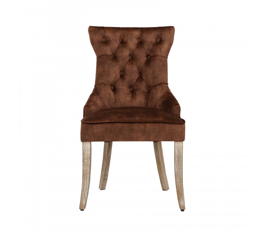 Chesterfield jedálenská stolička Torino so zamatovým poťahom hnedej farby a masívnymi nohami so strieborným klopadlom 96cm