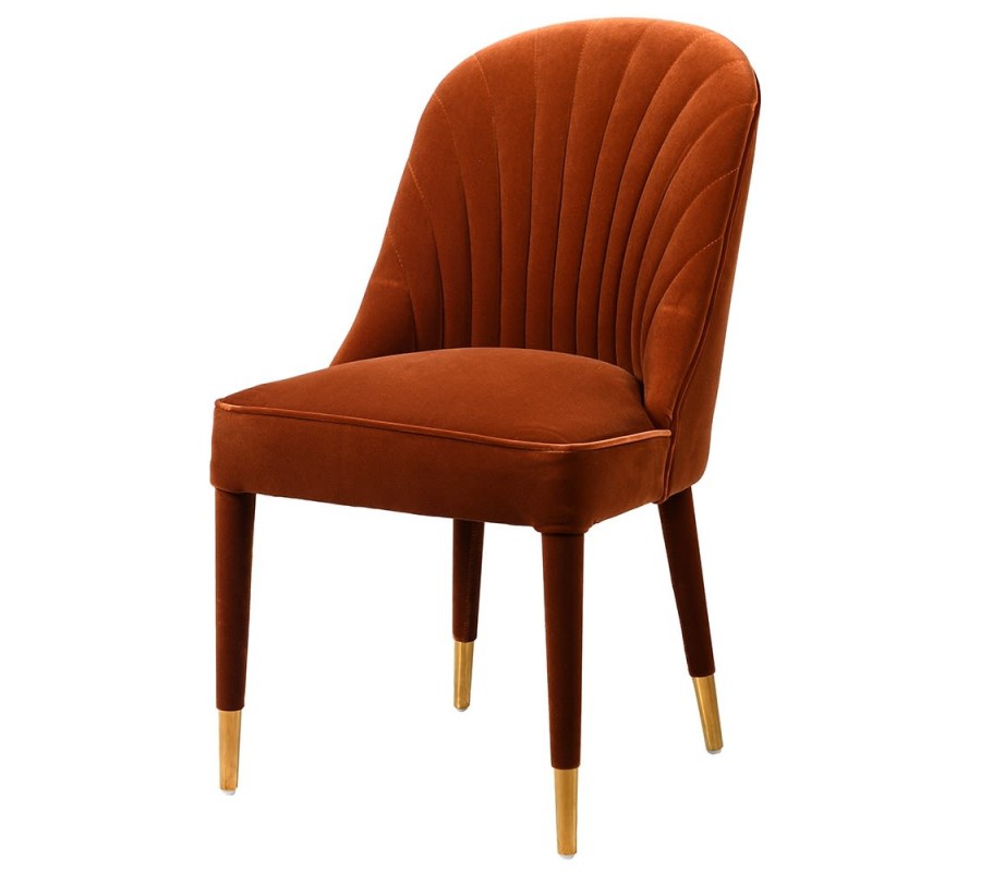 Štýlová stolička Célestine v hrdzavo oranžovom zamatovom prevedení je jedinečným art-deco dizajnovým kúskom do vášho interiéru. Kvalitná konštrukcia stoličky Célestine z dreveného masívu v kombinácií s bohatým polstrovaním na sedacej časti a dizajnovej chrbtovej opierke dodá komfort a pohodlie pri sedení v art-deco alebo moderne zariadených interiéroch. Zamatové čalúnenie v hrdzavo oranžovej farbe siaha až po koniec nožičiek, kde ho vystrieda zlaté kovové zakončenie, ktoré dodá unikátny a moderný art-deco nádych stoličke Célestine v kombinácií so zlatými alebo art-deco štýlovými doplnkami. Odporúčame kombinovať do svetlých interiérov, v ktorých dizajnová stolička Célestine vynikne ako unikátny kúsok.