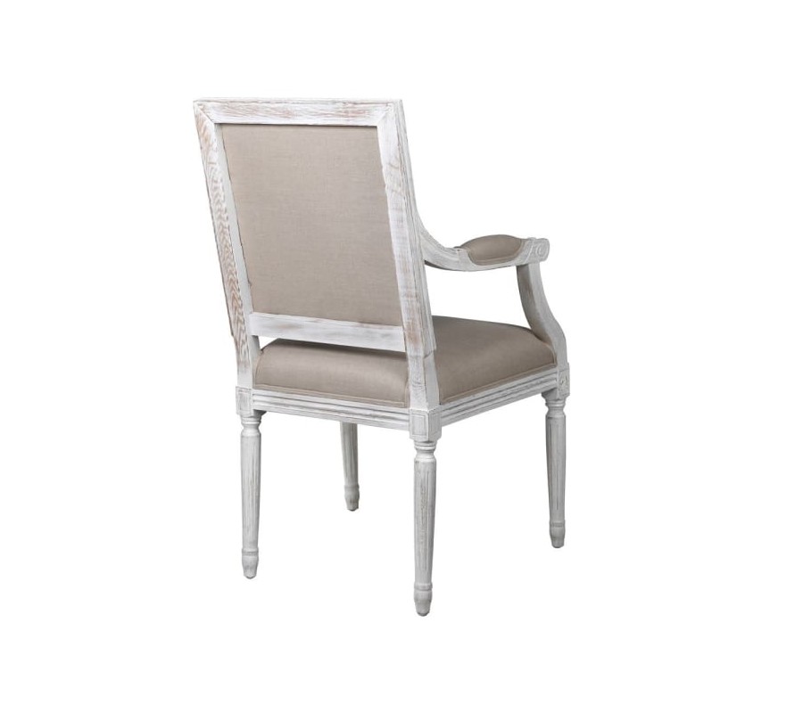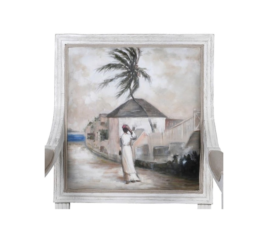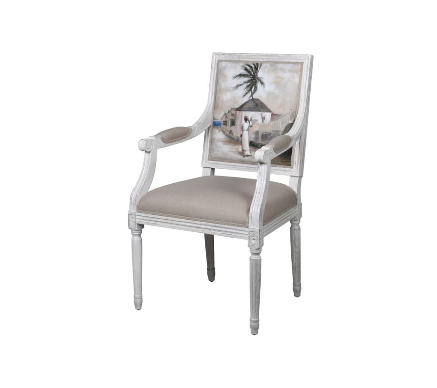 Exkluzívna jedálenská stolička WIltshire zaujme predovšetkým vďaka svojmu jedinečnému ručne maľovanému operadlu. Motív pripomínajúci stredozemné prímorské oblasti príjemne ladí s celkovým svetlým prevedením stoličky. Off-white odtieň drevenej konštrukcie je doplnený svetlosivou čalúnenou sedacou časťou, ktorá sa postará o váš komfort. K vášmu pohodliu tiež dopomôžu praktické podrúčky. Kvalitné dubové masívne drevo zabezpečí dlhú životnosť Bohaté ručné vyrezávanie no nožičkách, oepradle i podrúčkach umocňuje celkový rustikálny vzhľad stoličky. Stoličky WIlthire odporúčame kombinovať s masívnym jedálenským stolom, čalúnenou sedačkou či ďalšími vintage doplnkami.