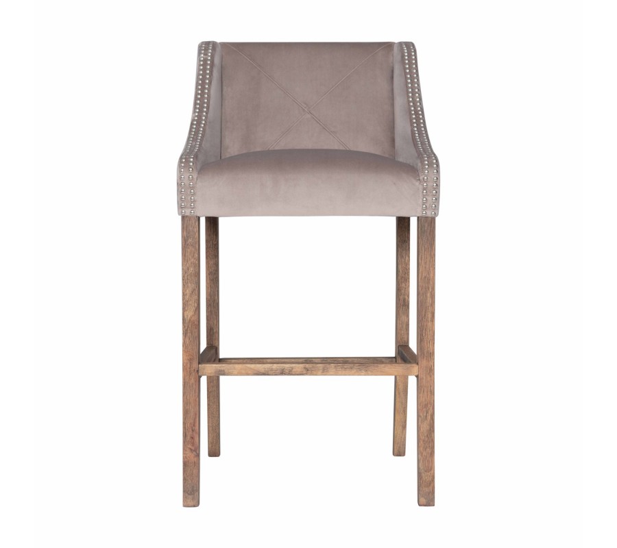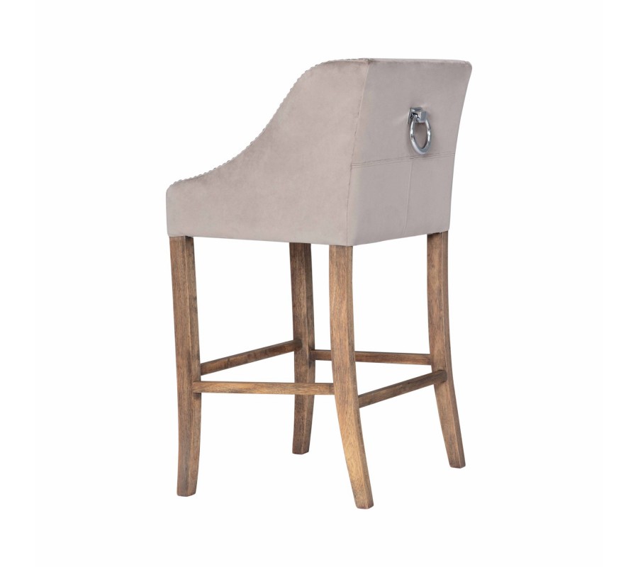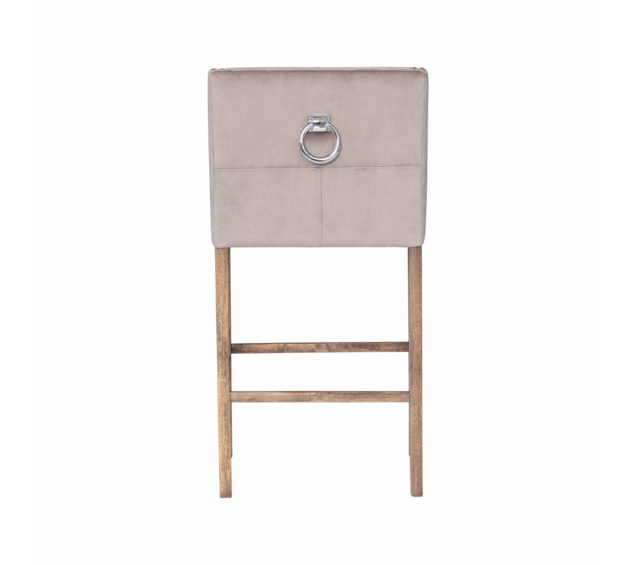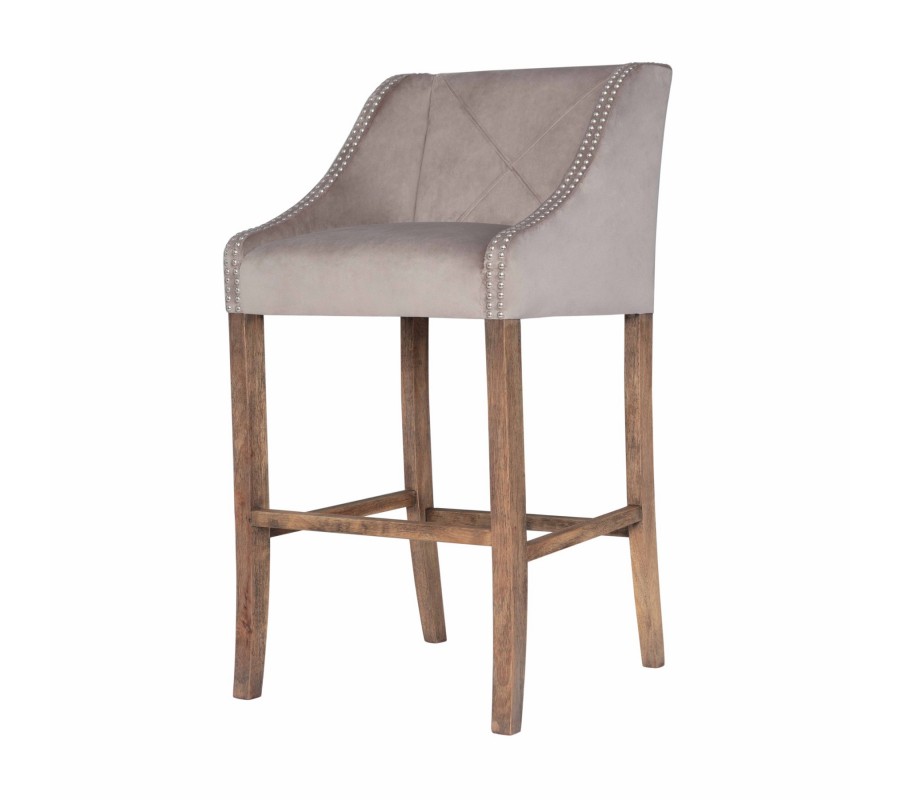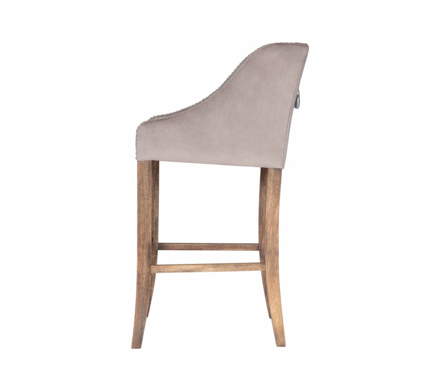 Štýlová barová stolička Westend je jedinečným kúskom do vašej domácnosti alebo podniku. Dizajnové béžové čalúnenie s elegantnými cvokmi po prednej časti bočných opierok v kombinácií s prešívaním na chrbtovej opierke pripomínajúce písmeno X vytvárajú zaujímavý dizajnový nádych. Unikátnosť barovej stoličky Westend iba podčiarkuje strieborná kovová rukoväť, ktorá sa nachádza na zadnej strane chrbtovej opierky. Pohodlie pri sedení zaistí jemný béžový textilný poťah a drevené, jemne zaoblené nožičky, ktoré sú obohatené o opierku na nohy. Vďaka svojmu svetlému prevedeniu odporúčame kombinovať barovú stoličku Westend do tmavých aj svetlých štýlových interiérov a vďaka drevenej konštrukcií nôh sa hodí aj do vidiecky ladených jedální a barov v kombinácií s podlahou a iným nábytkom v prirodzenej farbe dreva.