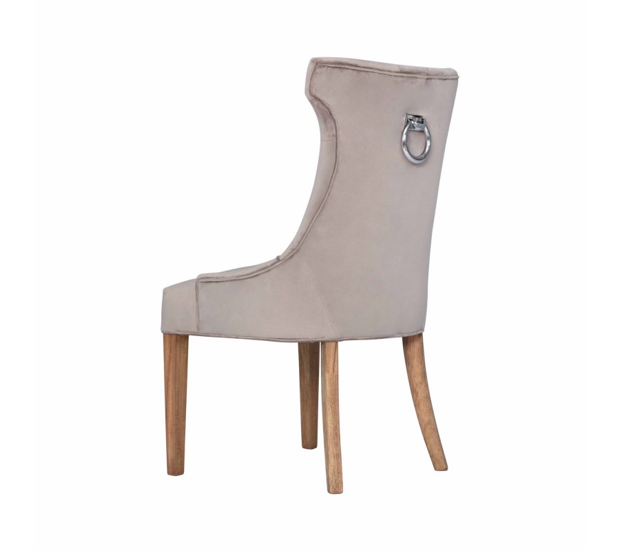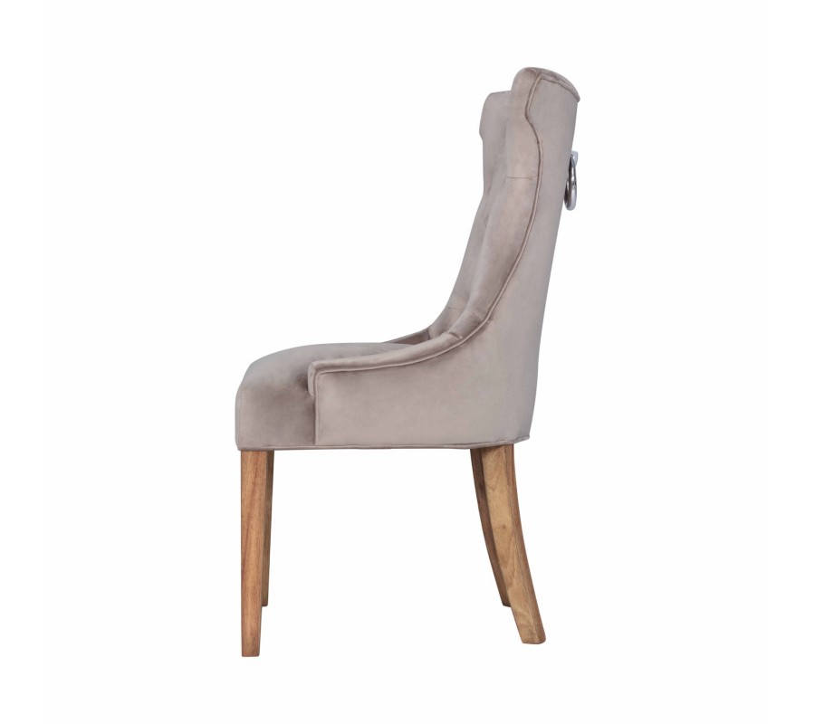 Chesterfield moderná jedálenská stolička Dinah s béžovým poťahom a drevenými nohami 100cm