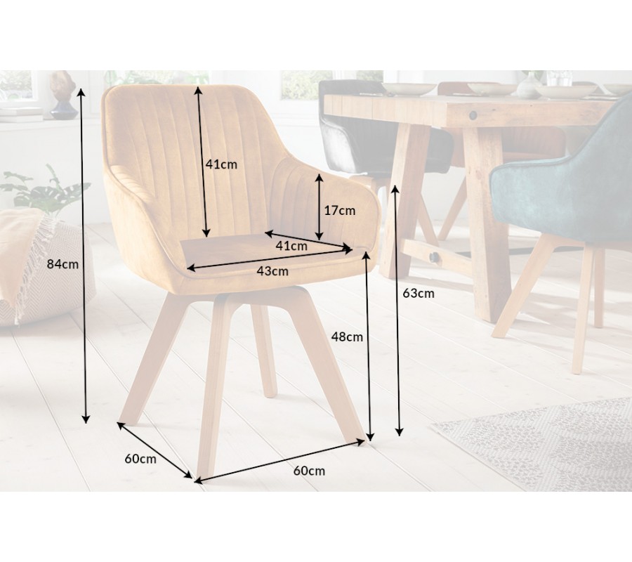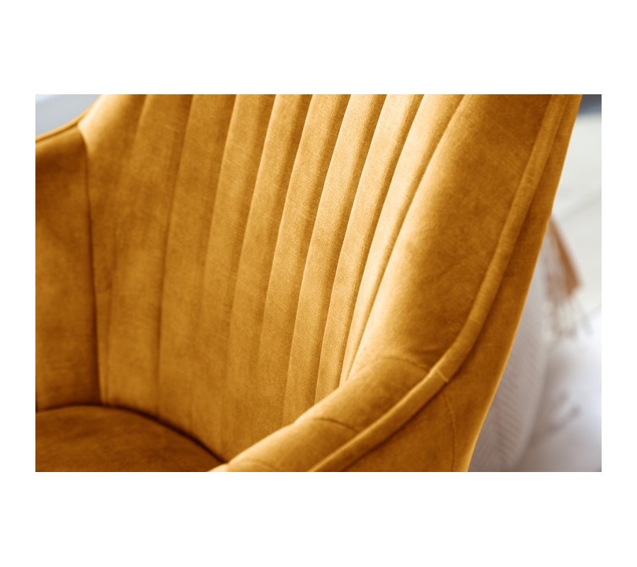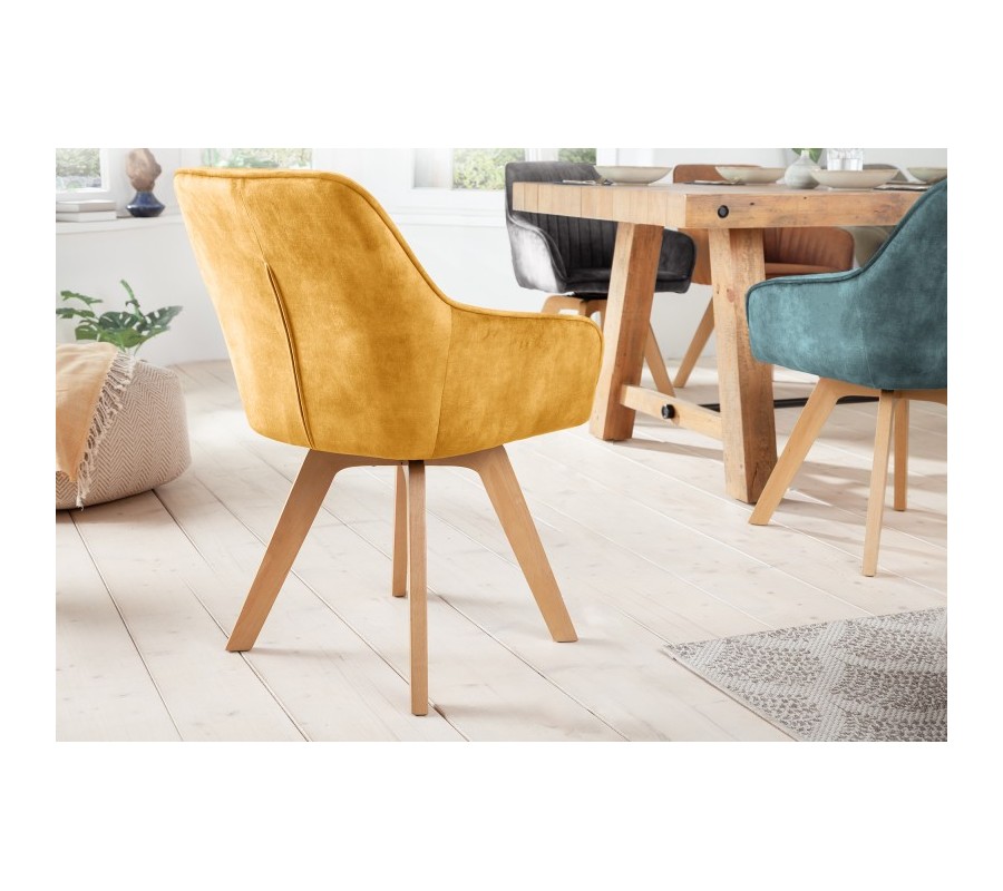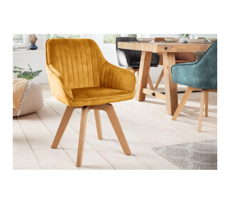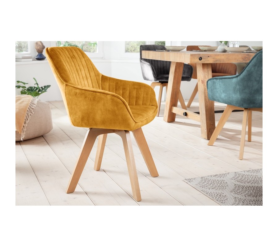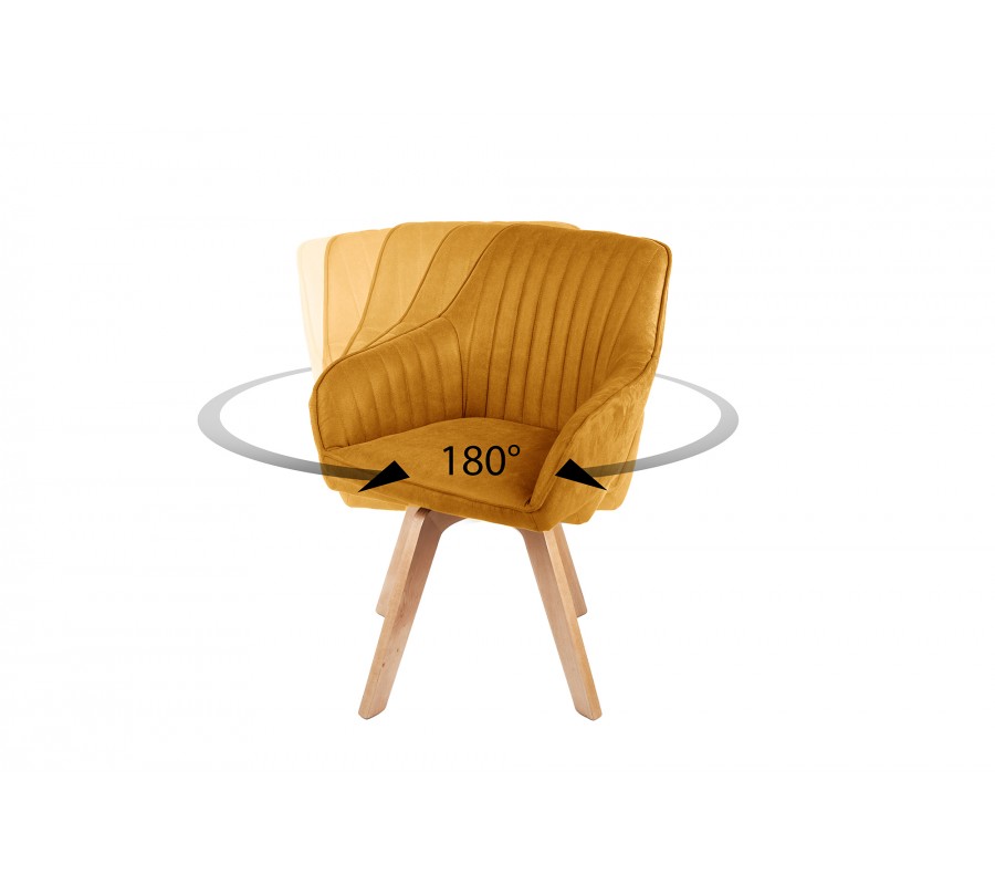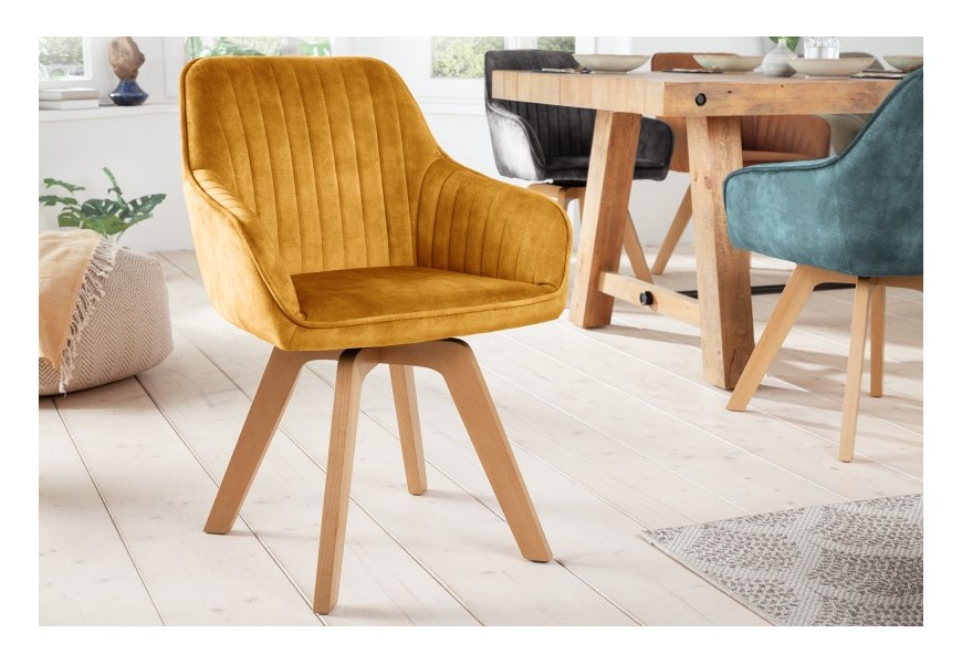 Luxusné a dizajnové jedálenské kreslo zo série Caballet je príjemným doplnkom do nejednej modernej domácnosti. Vkusné kreslo Caballet v škandinávskom štýle disponuje vhodnými opierkami na ruky, čo poskytne dodatočný komfort pri sedení. Jedálenské kreslo Caballet má taktiež príhodnú možnosť otáčania sedacej časti o 180 stupňov. Sedadlo je možné pri sedení otočiť do oboch bočných strán, čo zabezpečí komfortné usadenie či vstávanie od stola. Keď sa kreslo nepoužíva, sedacia časť sa bez záťaže automaticky natočí na prednú stranu, takže jedálenský priestor bude pôsobiť elegantne a uhladene. Jedinečné kreslo Caballet je potiahnuté zamatom v krásnom žltom odtieni a jeho nohy sú vyrobené z dreva s povrchovou úpravou, ktorá dovoľuje vyniknúť ich prirodzenej farebnosti. Dizajnové kreslo s vkusným vertikálnym prešívaním odporúčame kombinovať najmä s modernými dekoráciami a iným nábytkom v modernom či škandinávskom štýle v rámci jedinečných jedální, kuchýň či reštaurácií.