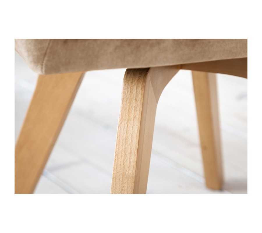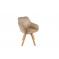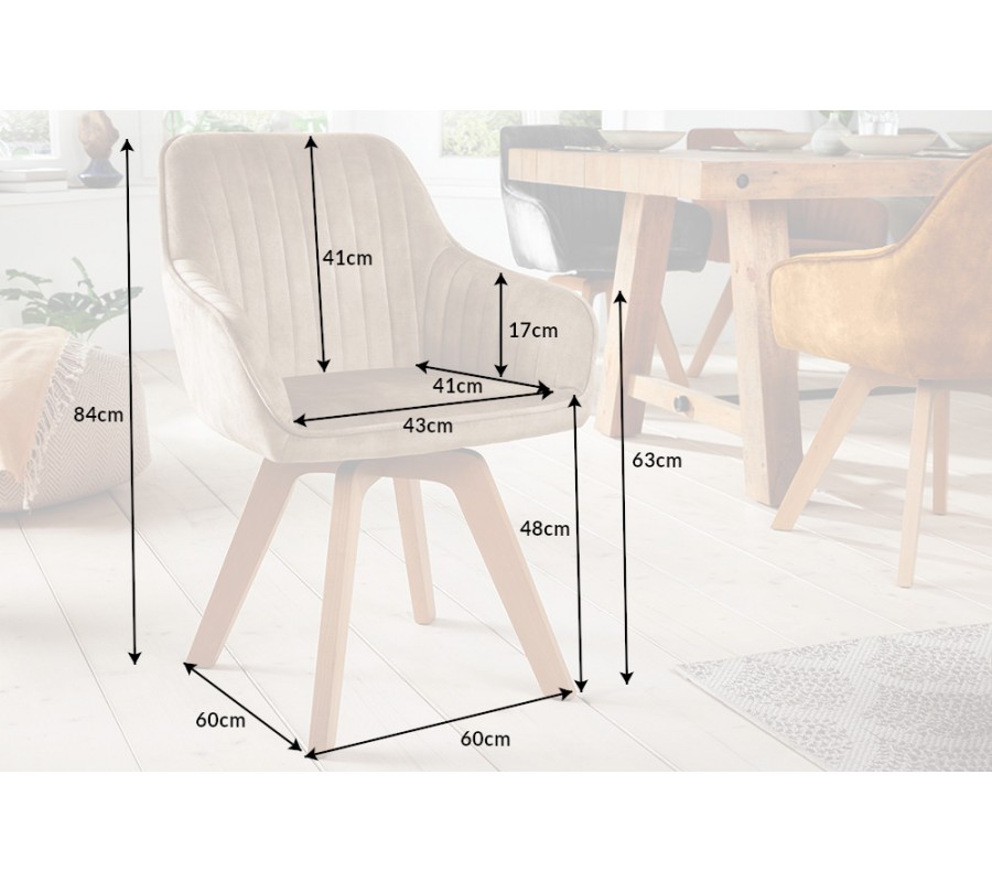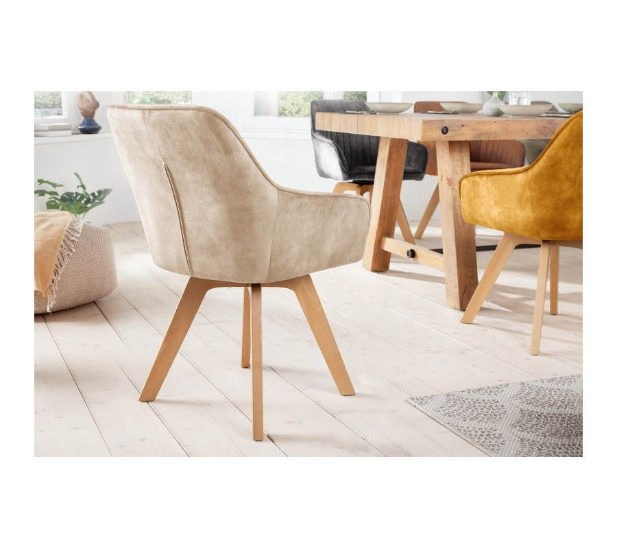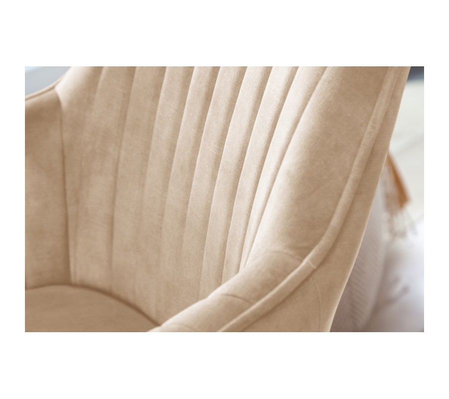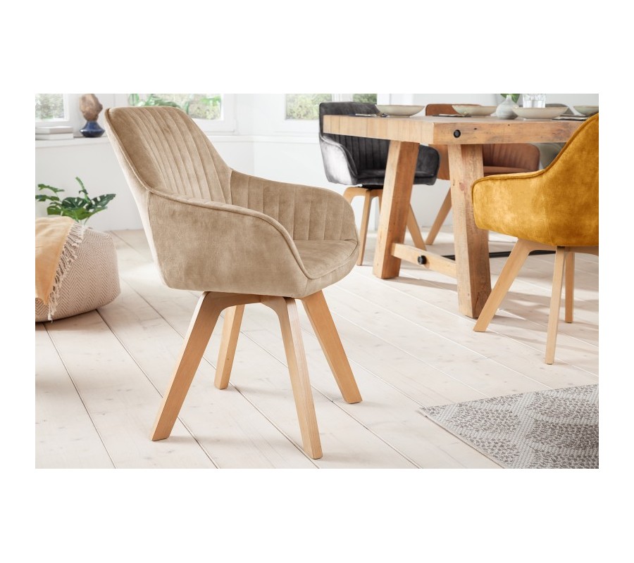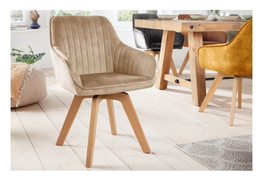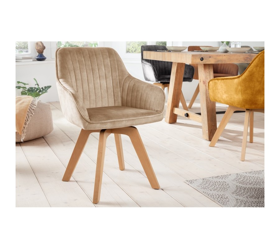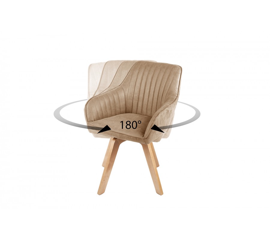 Luxusné a dizajnové jedálenské kreslo zo série Caballet je príjemným doplnkom do nejednej modernej domácnosti. Vkusné kreslo Caballet v škandinávskom štýle disponuje vhodnými opierkami na ruky, čo poskytne dodatočný komfort pri sedení. Jedálenské kreslo Caballet má taktiež príhodnú možnosť otáčania sedacej časti o 180 stupňov. Sedadlo je možné pri sedení otočiť do oboch bočných strán, čo zabezpečí komfortné usadenie či vstávanie od stola. Keď sa kreslo nepoužíva, sedacia časť sa bez záťaže automaticky natočí na prednú stranu, takže jedálenský priestor bude pôsobiť elegantne a uhladene. Jedinečné kreslo Caballet je potiahnuté zamatom v krásnom béžovom odtieni a jeho nohy sú vyrobené z dreva s povrchovou úpravou, ktorá dovoľuje vyniknúť ich prirodzenej farebnosti. Dizajnové kreslo s vkusným vertikálnym prešívaním odporúčame kombinovať najmä s modernými dekoráciami a iným nábytkom v modernom či škandinávskom štýle v rámci jedinečných jedální, kuchýň či reštaurácií.