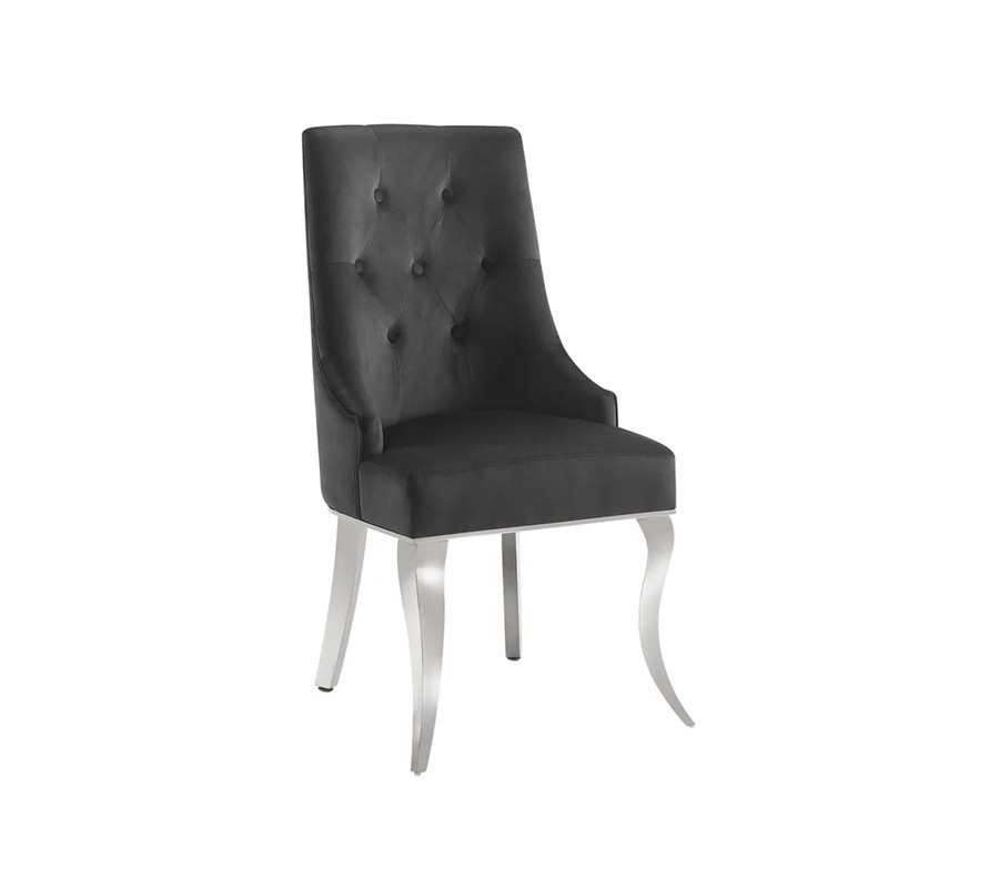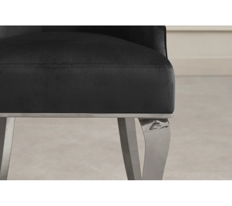 Stolička je čalúnená v elegantnom zamatovom čiernom odtieni, ktorý podčiarkuje jej noblesný charakter a umožňuje jednoduché kombinovanie s rôznymi materiálmi a farbami interiéru. Kvalitný zamatový poťah z mikrovlákna je odolný, príjemný na dotyk a spolu s precíznym čalúnením zabezpečuje komfortné sedenie aj pri dlhších stretnutiach pri jedálenskom stole. Dekoratívnym detailom sú prešívané gombíky, ktoré dodávajú stoličke jemný barokový akcent a zvýrazňujú jej glamour charakter.