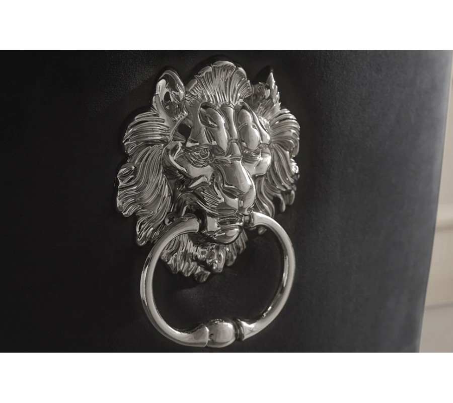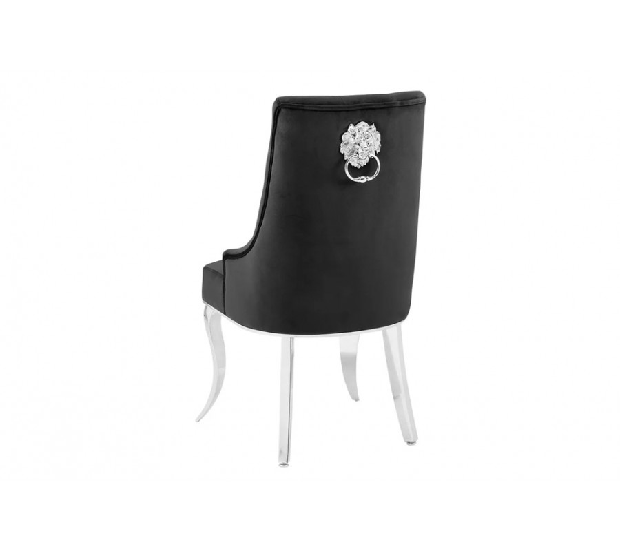 Praktické klopadlo v tvare hlavy leva umiestnené na zadnej strane operadla slúži na jednoduchú manipuláciu so stoličkou a zároveň plní dekoratívnu funkciu typickú pre glamour a barokový štýl. Model je riešený bez opierok na ruky, čo umožňuje praktické zasunutie stoličky pod stôl. Bohato čalúnená sedacia časť zabezpečuje príjemné a stabilné sedenie, zatiaľ čo stolička si zachováva ľahký a vyvážený vzhľad.