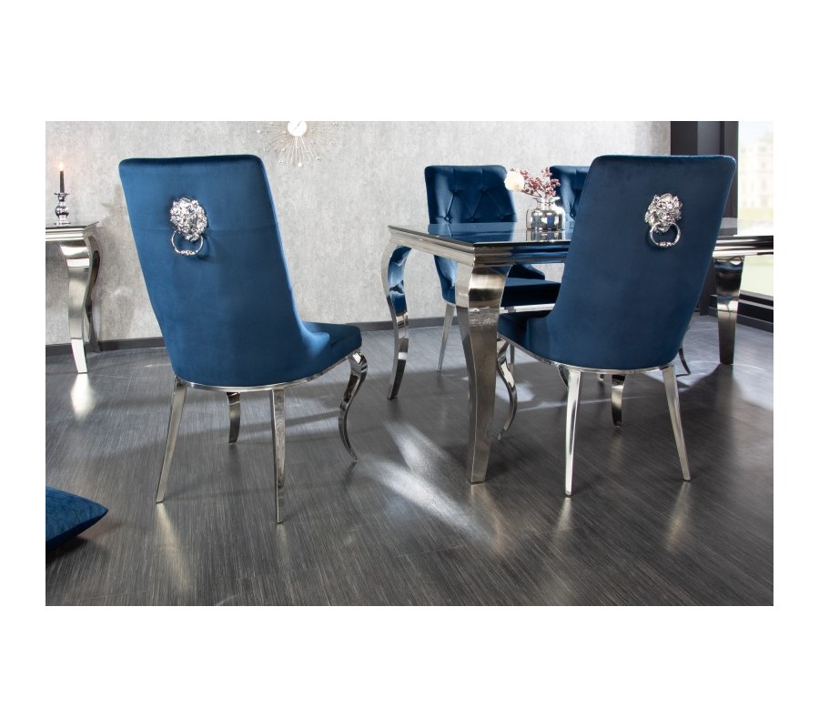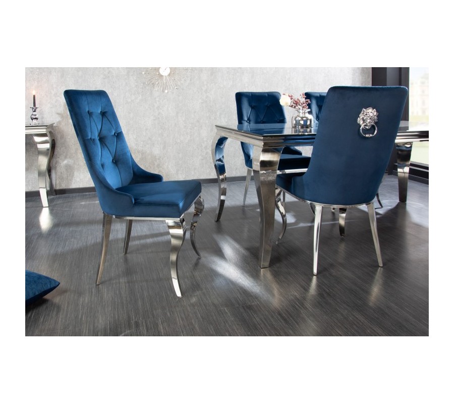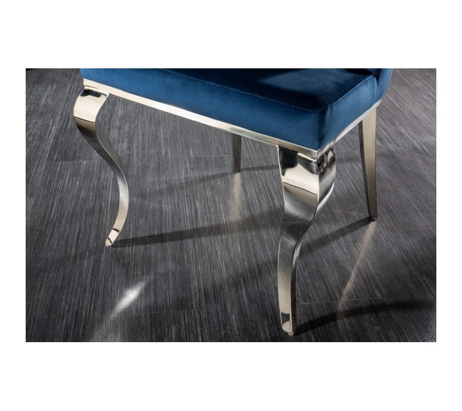 Baroková dizajnová jedálenská stolička Glamour s chrómovou konštrukciou a modrým zamatovým čalúnením 102cm