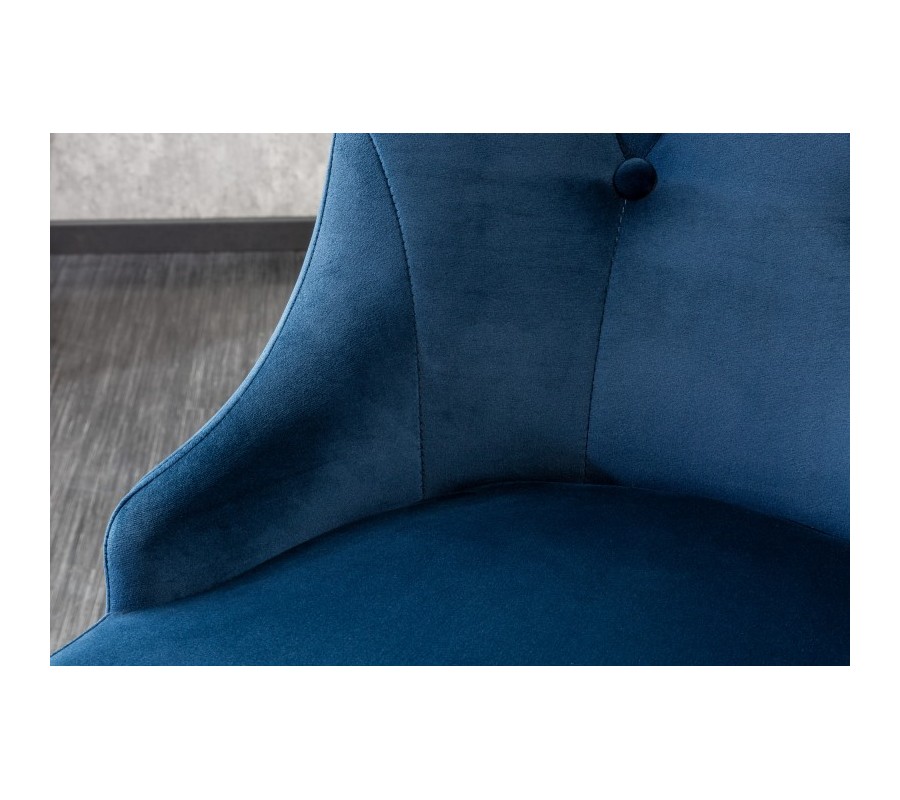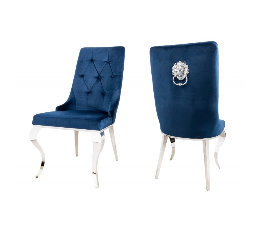Luxusné jedálenské kreslo Glamour zapadne do moderne a barokovo ladených priestorov jedální, obývačiek či zasadacích sál. Už na prvý pohľad zaujme svojím jedinečným dizajnom prepájajúcim barokový nádych s modernými trendami. Kreslo pozostáva z kovovej chrómovej konštrukcie a zamatového čalúnenia v tmavomodrej farbe, ktoré navyše zdobí elegantné chesterfield prešívanie. Na zadnej strane operadla sa nachádza dizajnový prvok v podobe kruhového kovového úchytu v tvare levej hlavy. Vkusne zaoblené nohy spolu s tvarovaným operadlom tvoria nielen jedinečný dizajn, ale zároveň sa postarajú aj o vaše stopercentné pohodlie pri stolovaní či pri práci. Stoličky Glamour sú výborným adeptom na kombináciu s chrómovým alebo skleneným jedálenským stolom a vyniknú najmä v tmavšie ladených priestoroch, kde vytvoria efekt luxusu a noblesy.