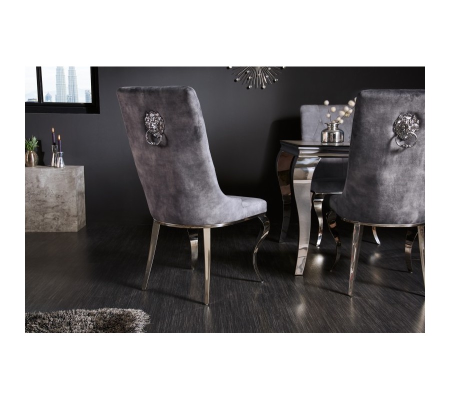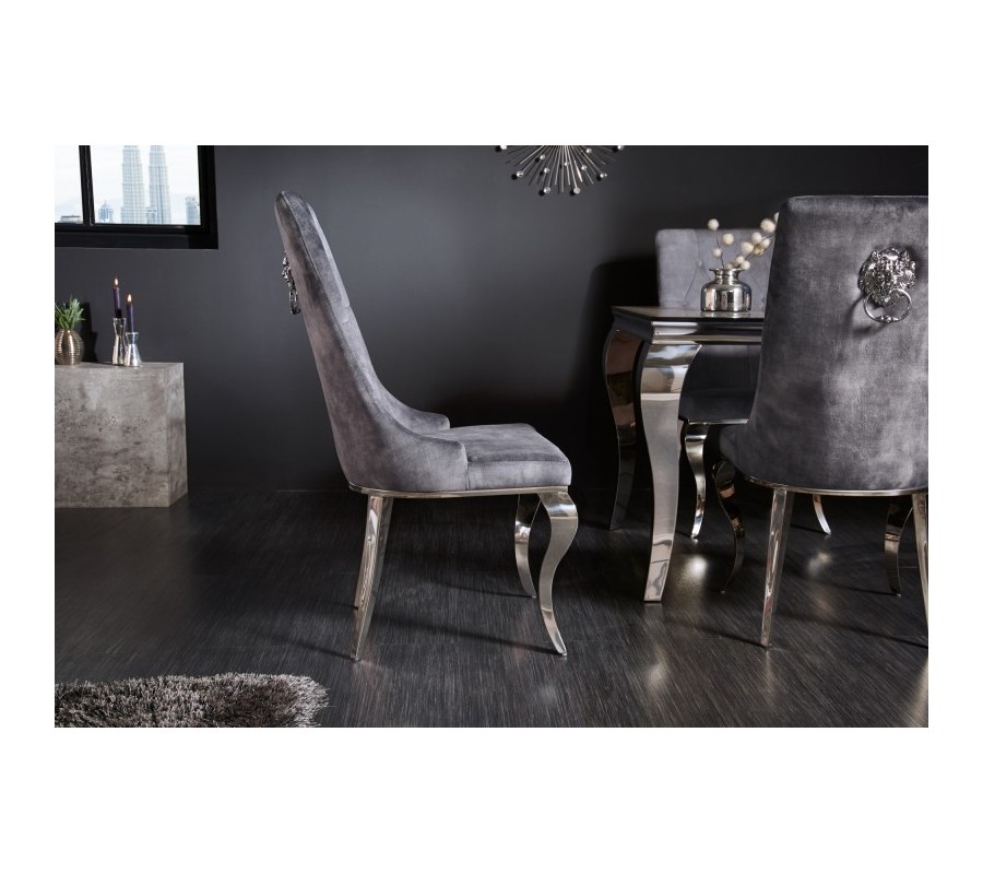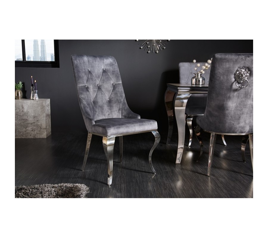 Exkluzívne kreslo z našej kolekcie luxusného nábytku Glamour zapadne do moderne a barokovo ladených priestorov jedální, obývačiek či zasadacích sál. Toto kreslo sa vyznačuje svojím jedinečným dizajnom pozostávajúcim z kovovej chrómovej konštrukcie so strieborným zamatovým čalúnením s elegantným chesterfield prešívaním. Vkusne zaoblené nohy spolu s tvarovaným operadlom tvoria nielen jedinečný dizajn, ale zároveň sa postarajú aj o vaše stopercentné pohodlie pri stolovaní či pri práci. Stoličky Glamour sú výborným adeptom na kombináciu s chrómovým alebo skleneným jedálenským stolom a vyniknú najmä v tmavšie ladených priestoroch, kde vytvoria efekt luxusu a noblesy.