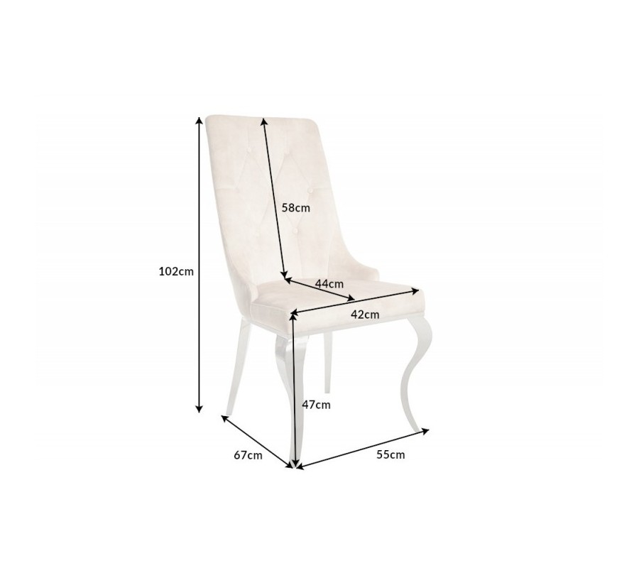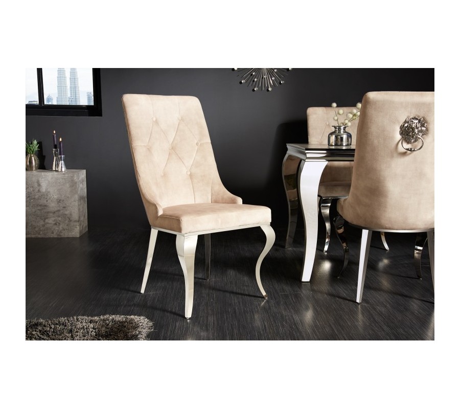 Exkluzívna moderná jedálenská stolička Glamour so zamatovým béžovým čalúnením a striebornými chrómovými nohami 102cm