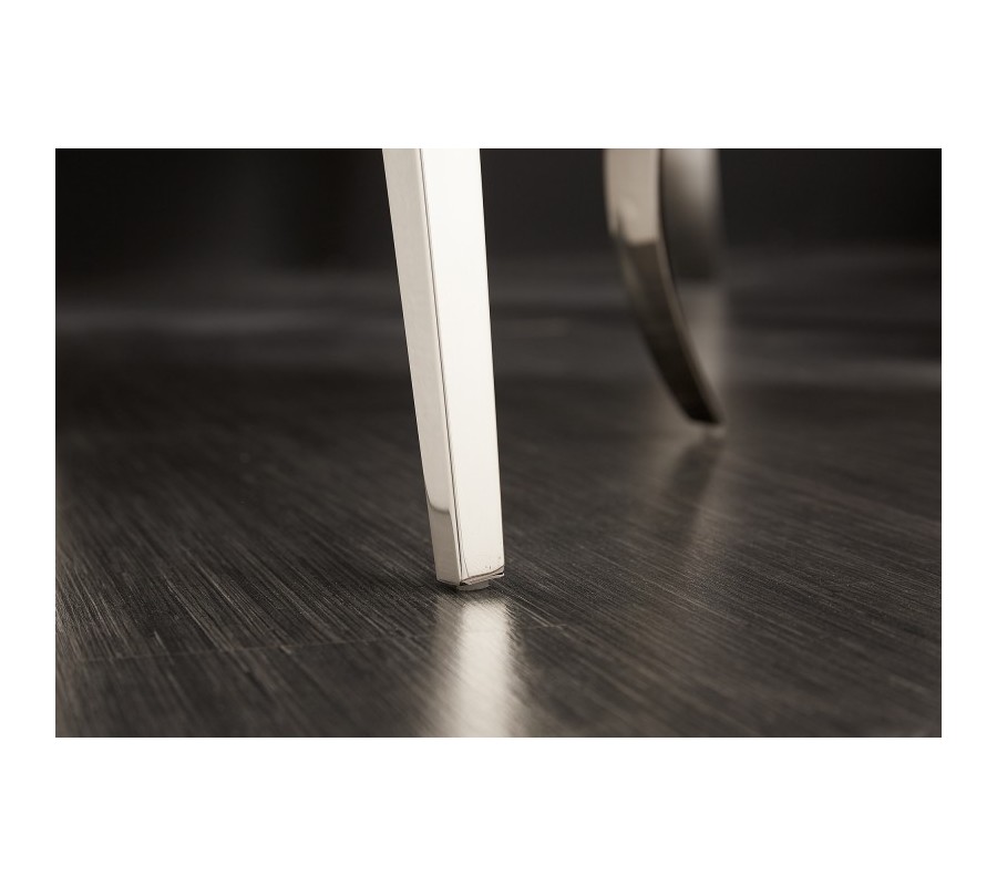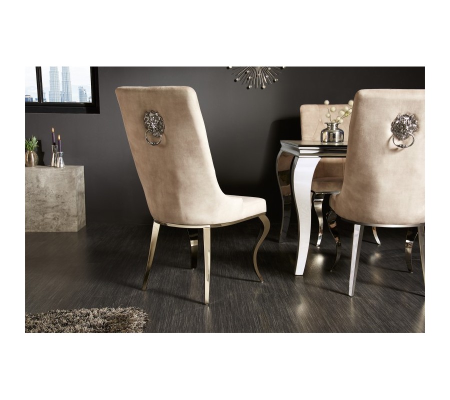Luxusné kreslo z kolekcie Glamour je kúskom vhodným do moderne a barokovo ladených priestorov jedální, obývačiek či zasadacích sál. Toto kreslo sa vyznačuje svojím jedinečným dizajnom pozostávajúcim z kovovej chrómovej konštrukcie so zamatovým čalúnením v jemnej farbe šampanského. Operadlo navyše zdobí elegantné chesterfield prešívanie a dizajnový kovový úchyt v tvare levej hlavy na zadnej strane. Vkusne zaoblené nohy spolu s tvarovaným operadlom tvoria nielen jedinečný dizajn, ale zároveň sa postarajú aj o vaše stopercentné pohodlie pri stolovaní či pri práci. Pre dosiahnutie dokonalej luxusnej atmosféry odporúčame stoličky Glamour kombinovať s kovovým alebo skleneným jedálenským stolom.