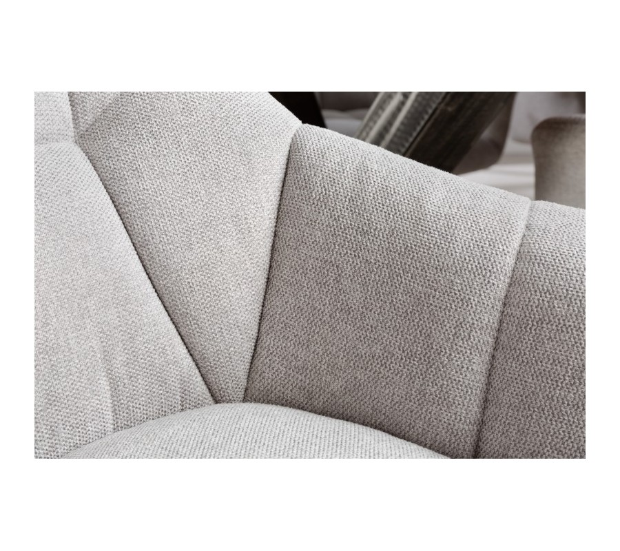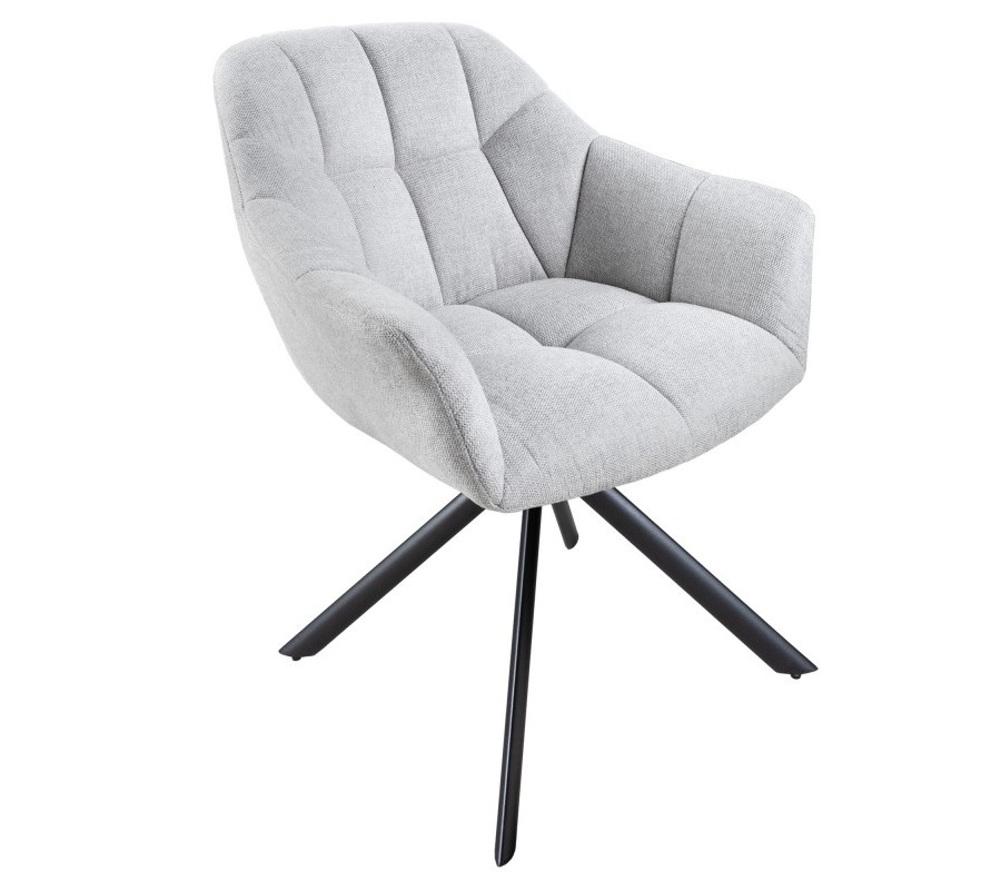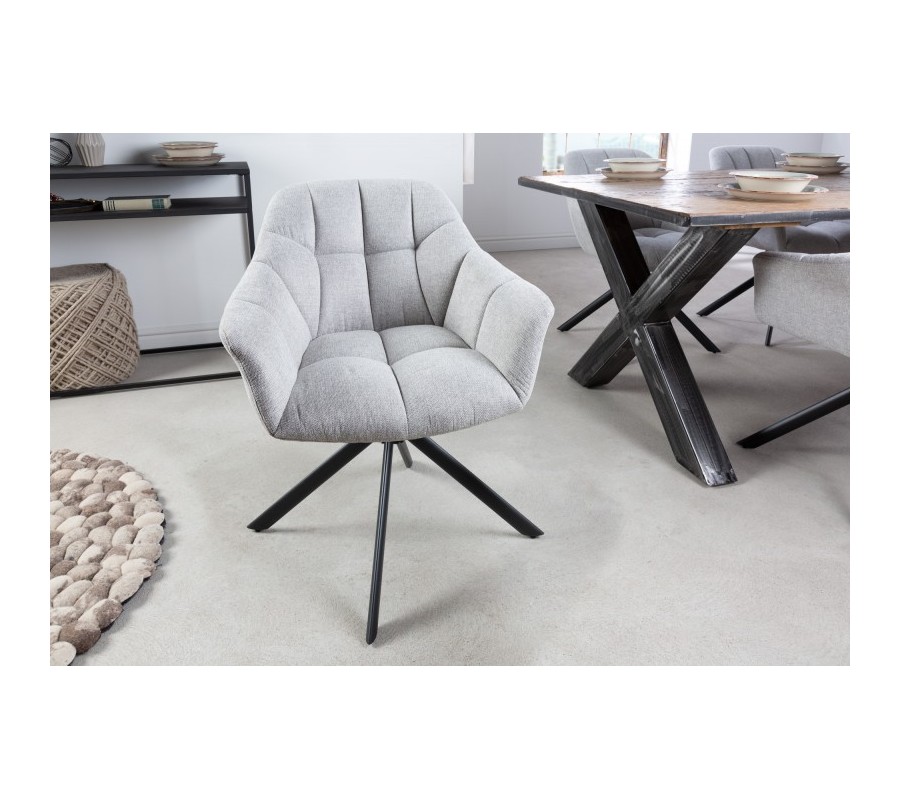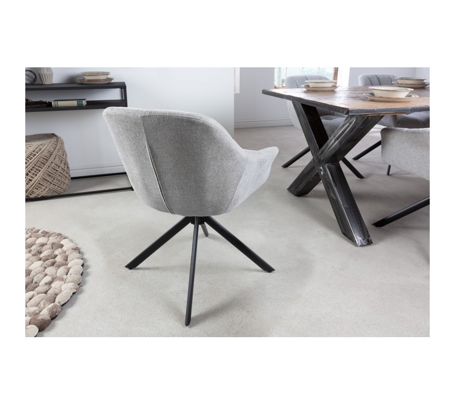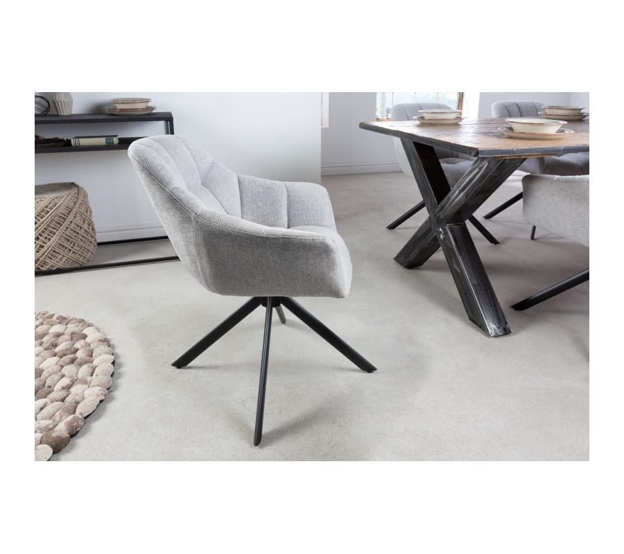 Dizajn modernej štýlovej otočnej stoličky Mariposa bol inšpirovaný pohybom motýlích krídel. Sedacia časť modernej otočnej stoličky je čalúnená textúrovanou látkou, ktorá pôsobí elegantným dojmom. Čalúnenie je zdobené prešívaním, ktoré odkazuje na dizajn z prelomu minulého storočia. Luxusná stolička v čoraz vyhľadávanejšom retro štýle nenápadne doplní interiér zariadený v modernom alebo industriálnom štýle s retro či art deco doplnkami. Nespochybniteľnou prednosťou otočnej jedálenskej stoličky je pohodlie zabezpečené mäkkými opierkami. Vďaka štyrom kovovým nožičkám v čiernej farbe stolička pôsobí nadľahčeným, vzdušným dojmom a skvelo kontrastuje s masívnymi jedálenskými stolmi. Elegantná sivá farba textúrovanej látky podčiarknutá nadčasovo čiernymi nožičkami pôsobia tlmeným, útulným dojmom, vďaka čomu bude Vaša jedáleň vždy obľúbeným miestom stretnutí.