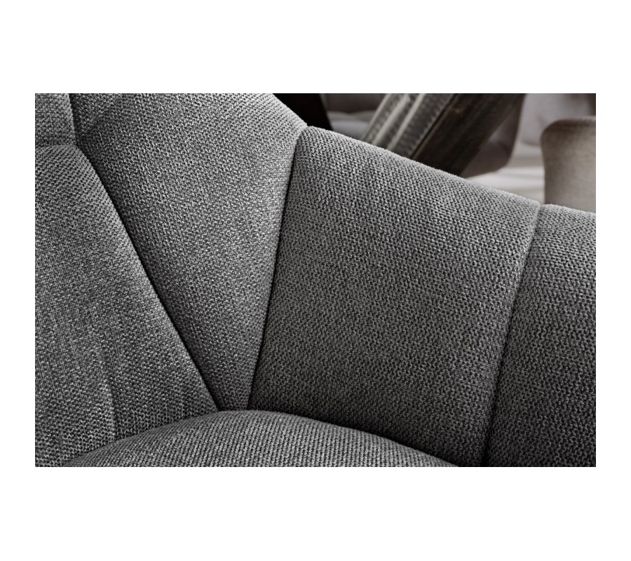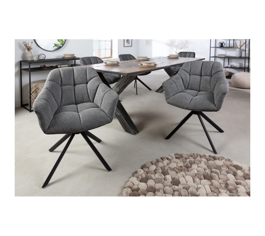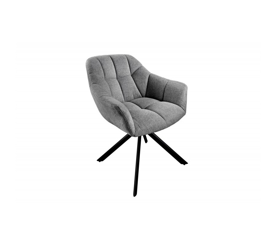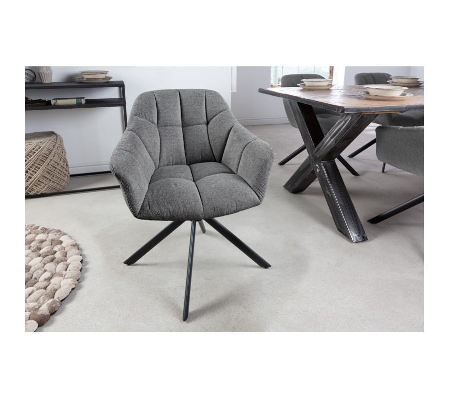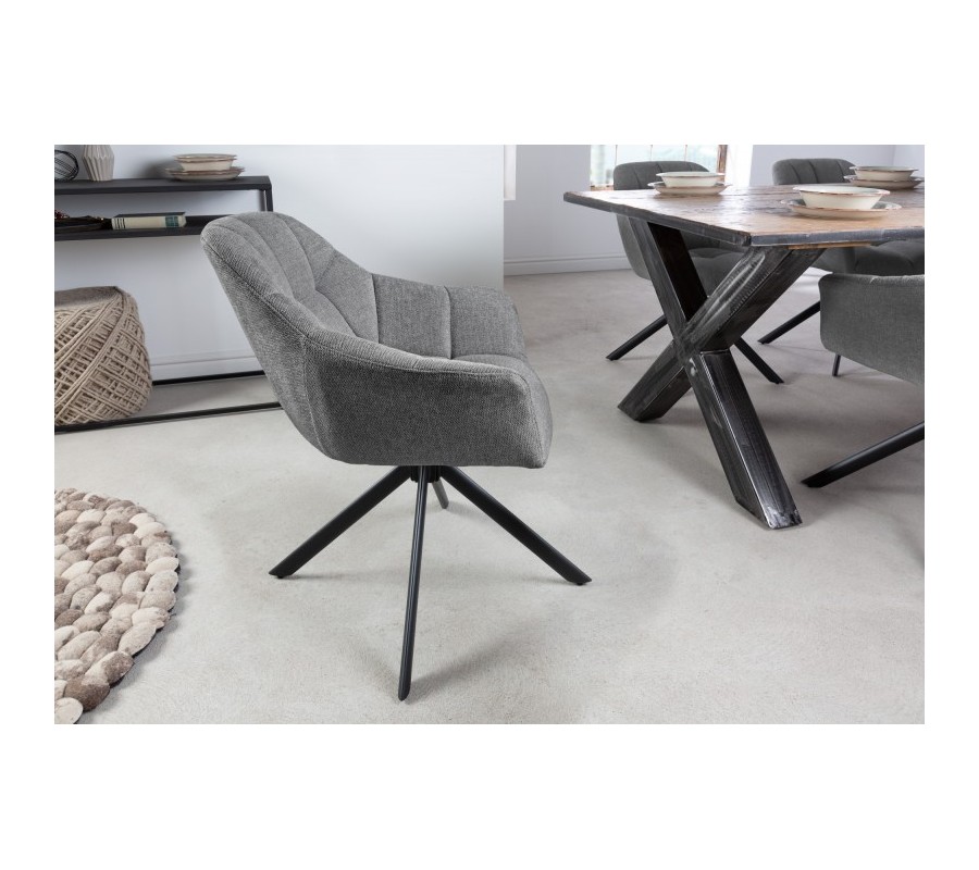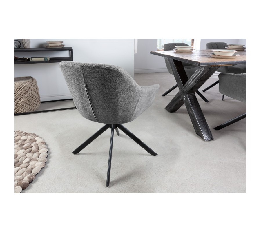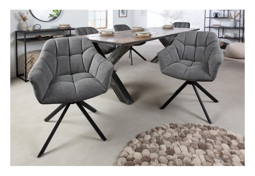 Dizajn modernej stoličky do jedálne Mariposa bol inšpirovaný pohybom motýlích krídel. Sedacia časť modernej otočnej stoličky je čalúnená textúrovanou látkou, ktorá pôsobí elegantným dojmom. Čalúnenie je zdobené prešívaním, ktoré odkazuje na dizajn z prelomu minulého storočia. Jedálenská stolička Mariposa v čoraz vyhľadávanejšom retro štýle nenápadne doplní interiér zariadený v modernom alebo industriálnom štýle s retro či art deco doplnkami. Nespochybniteľnou prednosťou otočnej jedálenskej stoličky je pohodlie zabezpečené mäkkými opierkami. Vďaka štyrom kovovým nožičkám v čiernej farbe stolička pôsobí nadľahčeným, vzdušným dojmom a skvelo kontrastuje s masívnymi jedálenskými stolmi. Elegantná sivá farba textúrovanej látky podčiarknutá nadčasovo čiernymi nožičkami pôsobia tlmeným, útulným dojmom, vďaka čomu bude Vaša jedáleň vždy obľúbeným miestom stretnutí.
