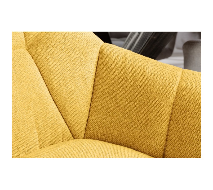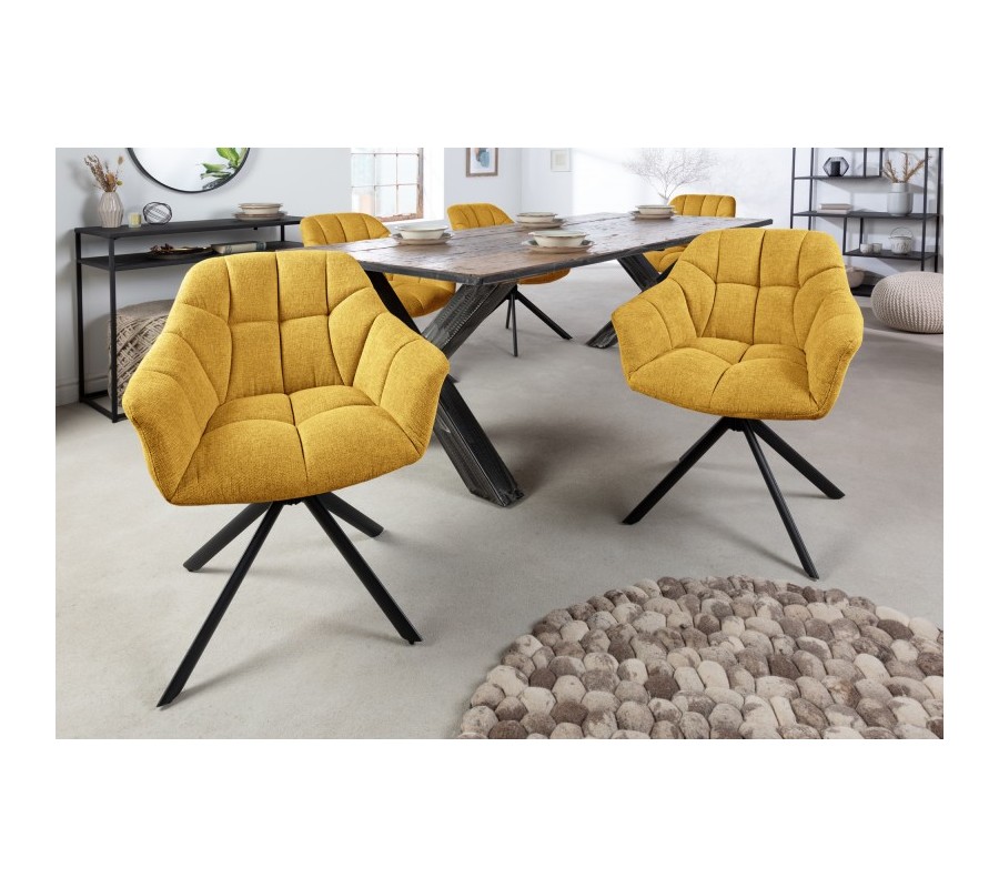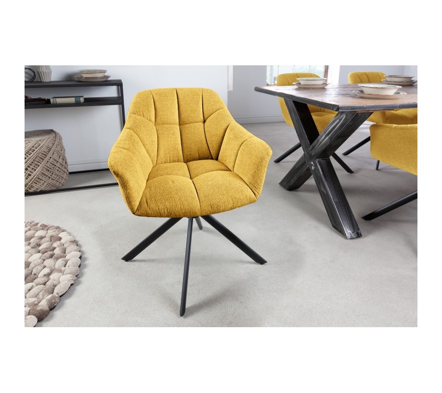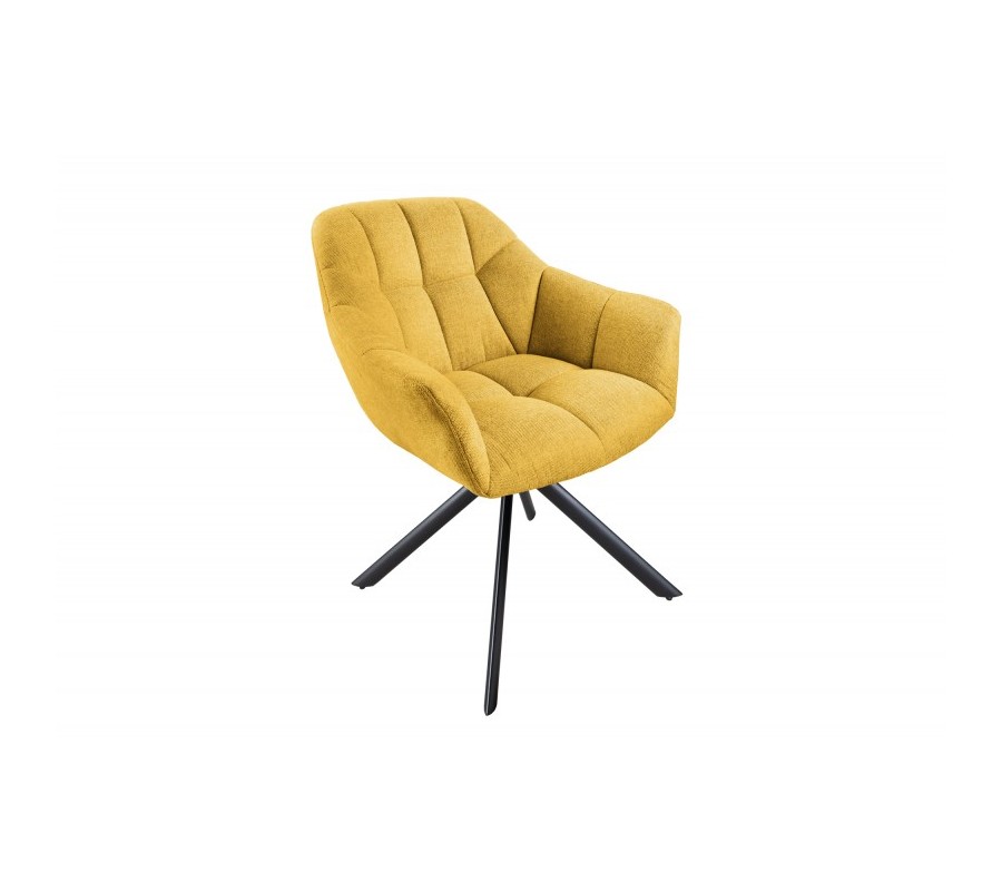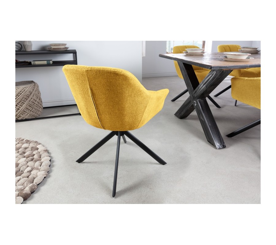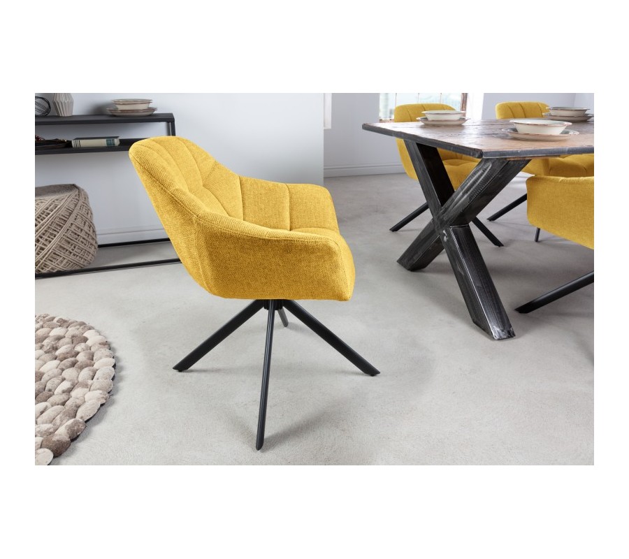 Moderná otočná jedálenská stolička Mariposa so žltým čalúnením a čiernymi kovovými nohami 83cm