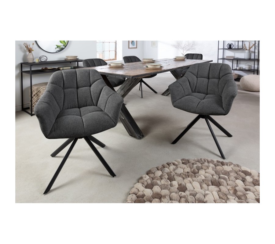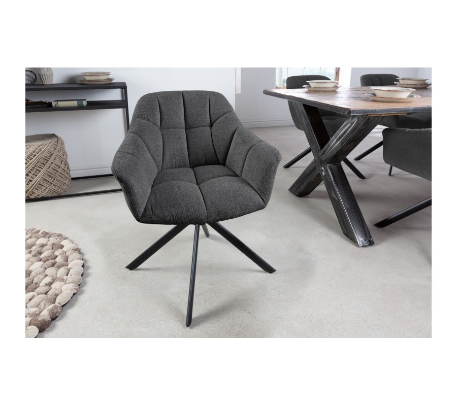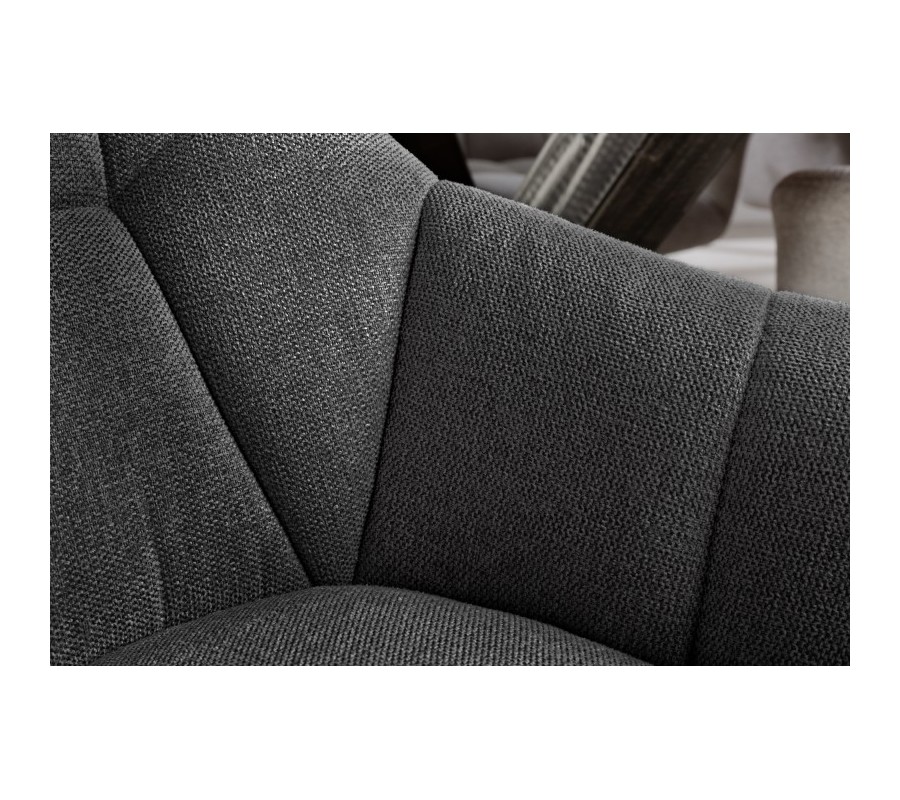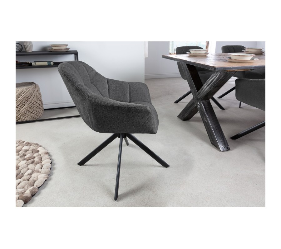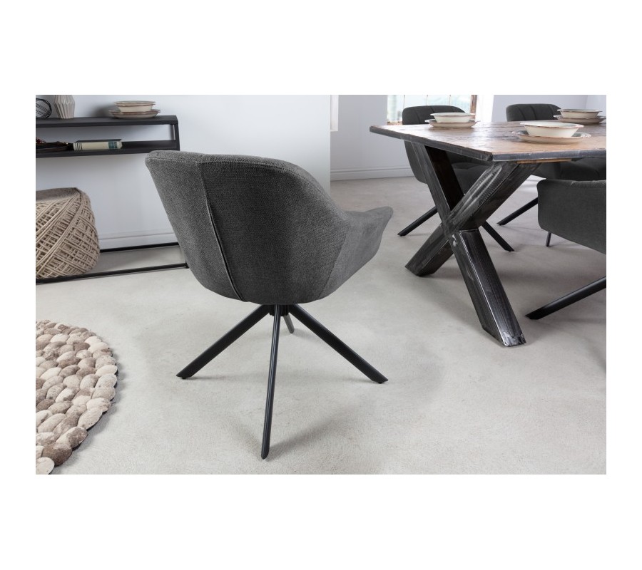 Moderná dizajnová stolička do jedálne pripomína vzhľadom sedacej časti roztvorené motýlie krídla, podľa čoho aj kolekcia dostala svoje meno - Mariposa. Inšpirovaná španielskym štýlom, otočná jedálenská stolička zaručí pohodlné trávenie času pri jedálenskom stole s Vašimi najbližšími. Sedacia časť modernej stoličky do jedálne je čalúnená textúrovanou látkou s ozdobným prešívaním odkazujúcim na dizajn z prelomu minulého storočia. Retro stolička na štyroch kovových nožičkách sa vďaka svojmu nenútenému prevedeniu hodí do interiérov zariaďovaných v modernom, retro či industriálnom štýle. Štýlová stolička skvelo doplní aj masívne jedálenské stoly Vďaka tlmenej antracitovej farbe otočná stolička zútulní interiér a dá vyniknúť výraznejšim doplnkom.