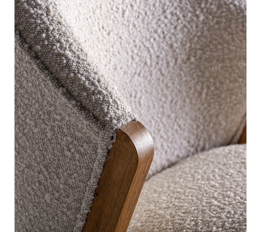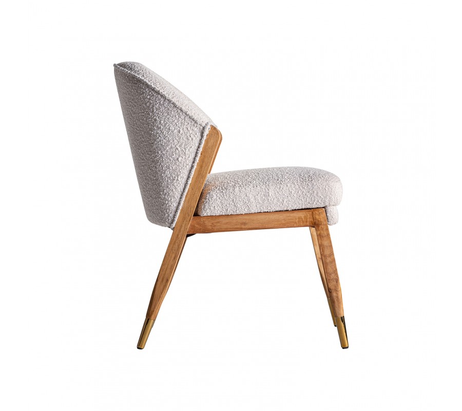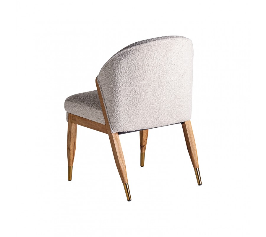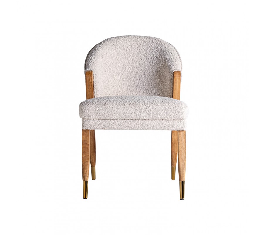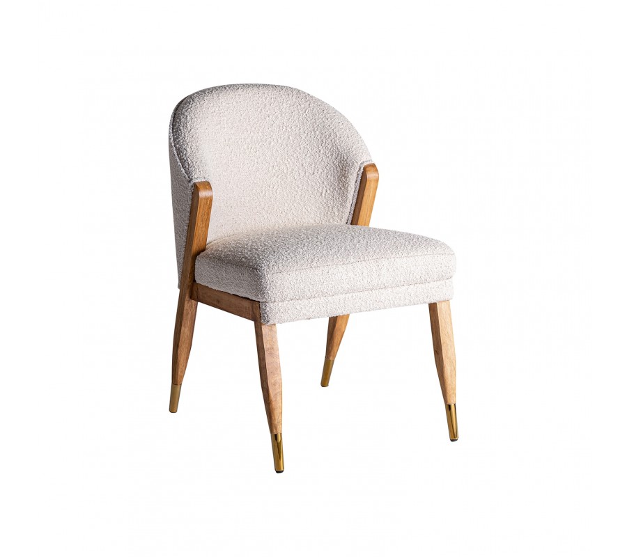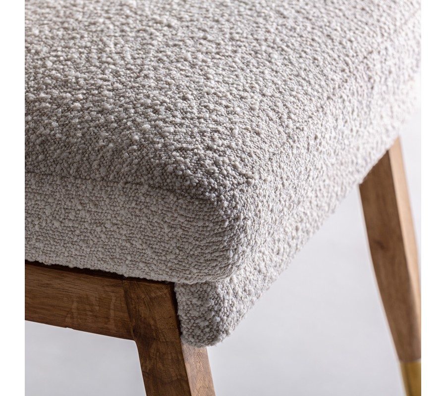 Unikátna stolička Aurélia vo vintage štýle tvorí nadčasová kombinácia borovicového masívneho dreva v prírodnom svetlohnedom odtieni s poťahom z buklé krémovej farby. Bavlnené buklé, materiál, ktorý v posledných rokoch zažíva v interiérovom dizajne comeback, je typický svojim honosným vzhľadom, ktorého hutnosť a pohodlný vzhľad mu dodáva množstvo uzlov a hustota tkania. Zaoblený tvar operadla vytvára zaujímavý vizuál, ktorý dopĺňa dizajnové prevedenie zošikmených drevených nôh. Spodok nožičiek zdobia jemné elegantné zlaté prvky. Okrem pôsobivého vzhľadu vám zaoblené operadlo a mäkká sedacia časť poskytnú stopercentný komfort pri práci, stolovaní či oddychu. Stolička Aurélia odporúčame umiestniť do nadčasových obývačiek, kancelárií či vintage ladených kaviarní. Jedinečnú atmosféru umocňujúcu retro či vintage vzhľad možno vytvoriť kombináciou s nábytkom z masívneho dreva, so zlatými kovovými dekoráciami a doplnkami v iných výrazných odtieňoch či so živou zeleňou.