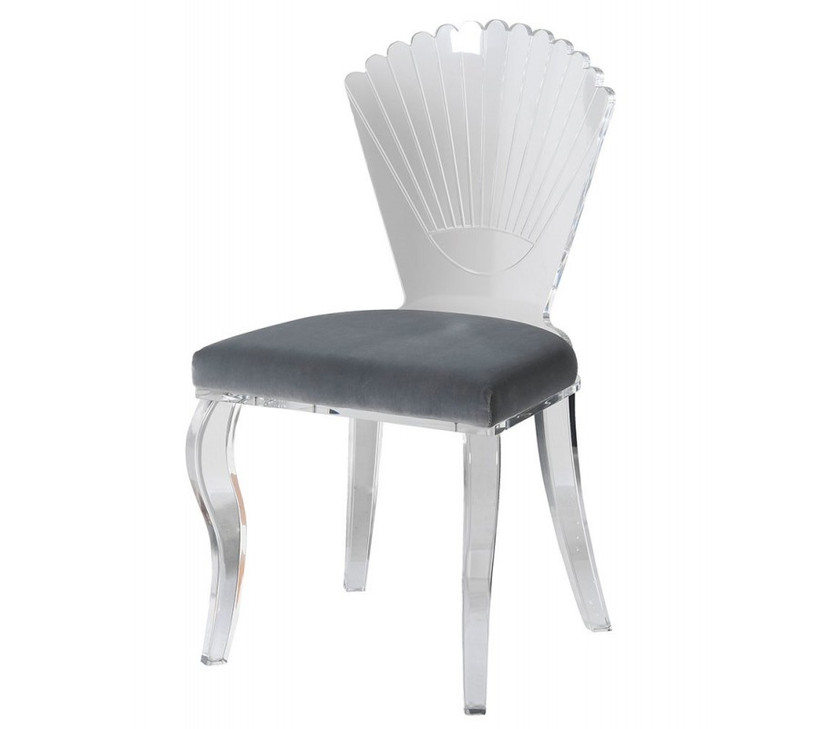 Luxusná jedálenská stolička Clarice s akrylovou chrbtovou opierkou v tvare mušle a nožičkami s čalúnením sivej farby 92cm