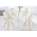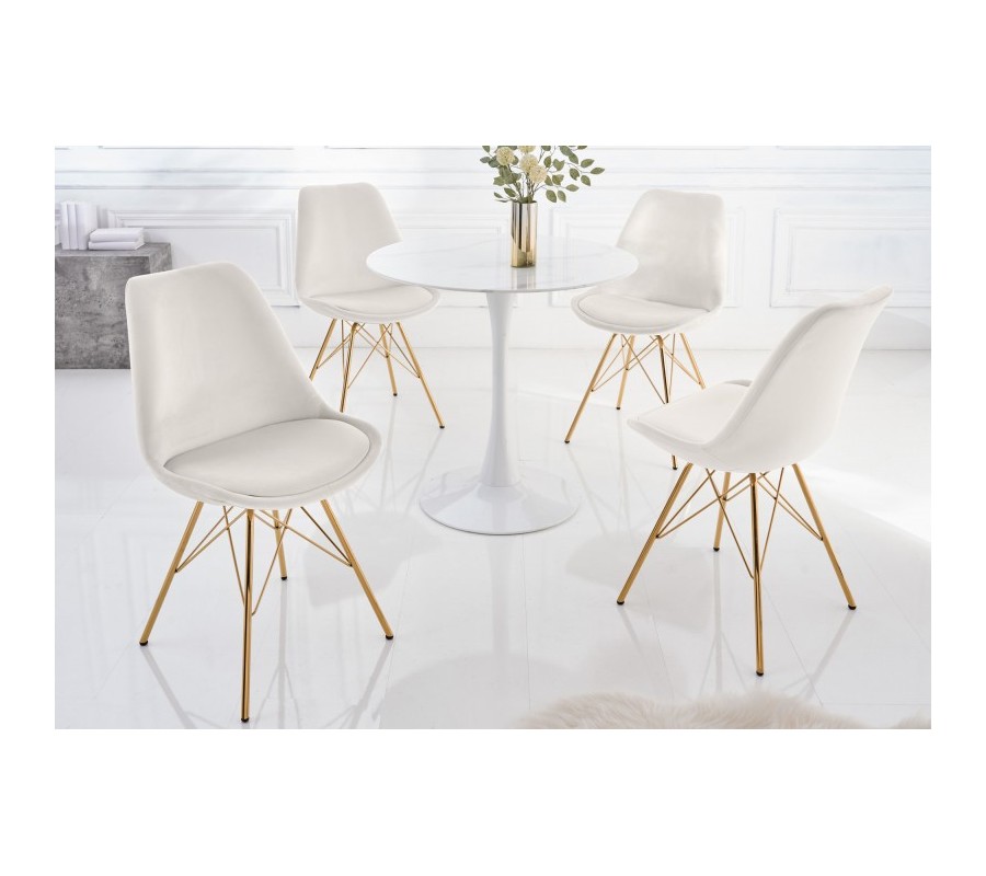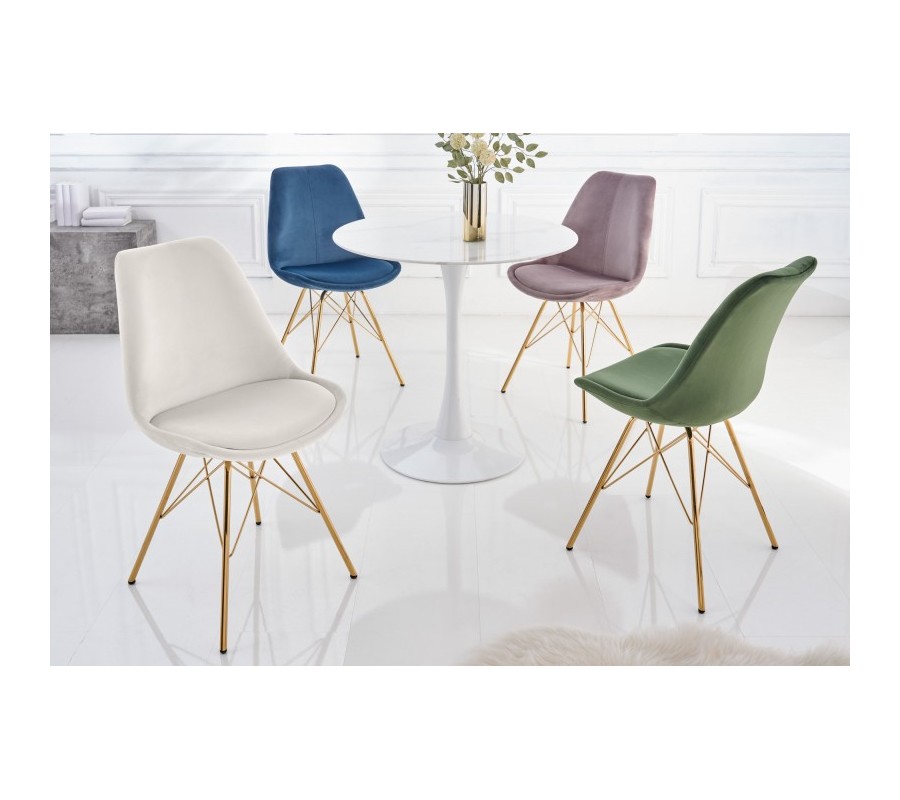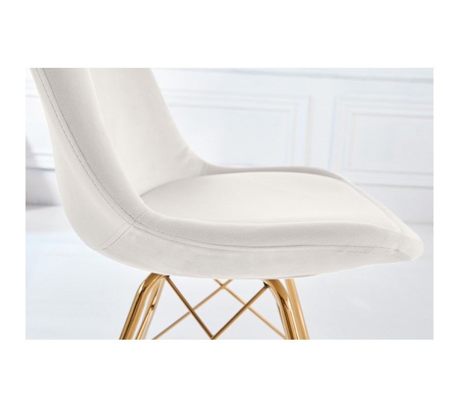 Dizajnová jedálenská stolička Scandinavia zaujme svojím elegantným moderným vzhľadom. Jej konštrukcia vyrobená z kovu sa nesie v lesklej zlatej farbe, pričom zošikmené nožičky sa prelínajú v zaujímavých geometrických útvaroch. Zlatú podstavu dopĺňa zamatové champagne čalúnenie, čím vzniká luxusný efekt vhodný na doplnenie opulentne ladených priestorov hotelov, zasadacích miestností či exkluzívnych reštaurácií. Okrem toho stoličky Scandinavia vhodne doplnia aj vaše súkromné priestory jedální, obývačiek či kancelárií. Elegantný farebný a materiálový súlad je typický pre štýl art deco a tak je vhodným adeptom na doplnenie práve takto ladených priestorov. Stoličky odporúčame kombinovať s masívnym alebo skleneným jedálenským stolom s kovovými nohami, a s rôznymi doplnkami so zlatými prvkami.