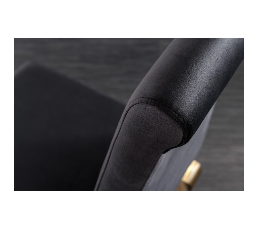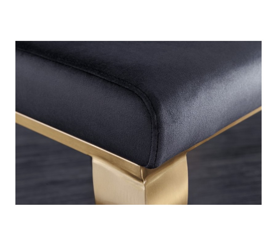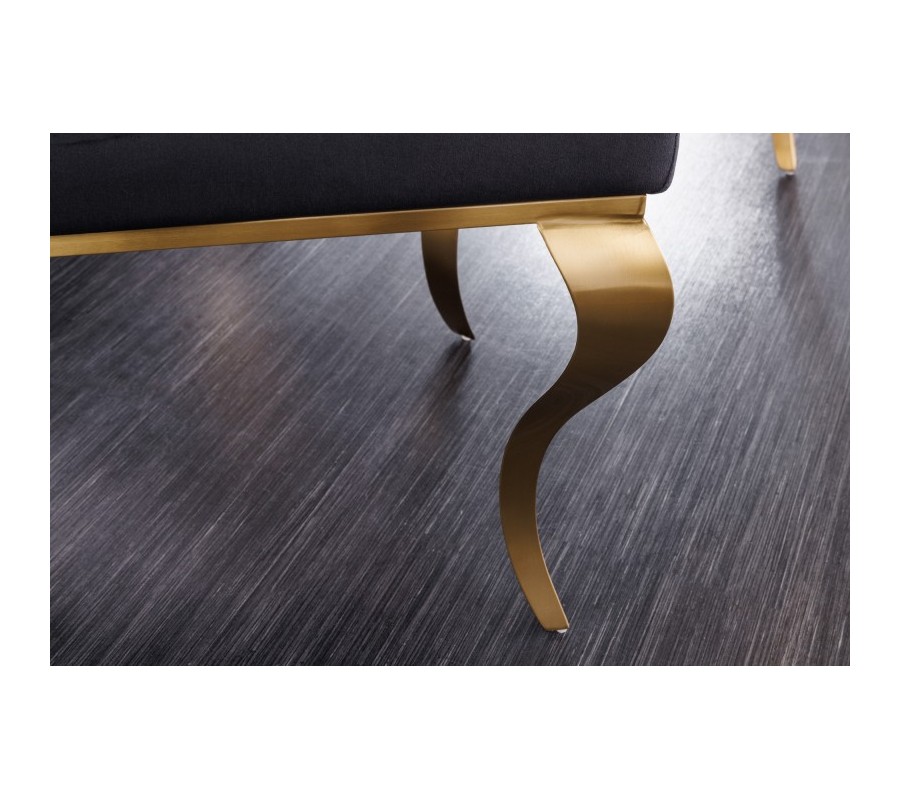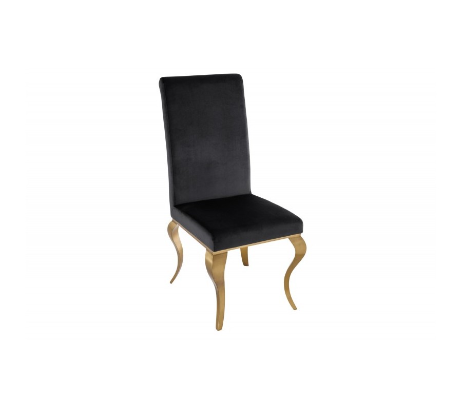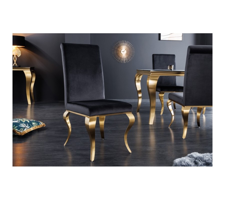 Jedálenská stolička Gold Barock prináša spojenie moderného a barokového štýlu. Prevedenie v zlato - čiernej kombinácií sa hodí najmä do modernejších interiérov zariadených napríklad v artdeco štýle, v ktorých dominujú kovové materiály a tmavšie metalické farby ako zlatá a čierna. Barokovú jedálenskú stoličku Gold Barock odporúčame kombinovať s jedálenským stolom Gold Barock a ostatným glamour nábytkom z Kolekcie Modern Barock. Cabriolové nohy z nehrdzavejúcej ocele v zlatej farbe jedálenskej stoličke dodávajú barokový charakter a spojenie matnej zlatej farby so zamatovým poťahom z mikrovlákna v čiernej farbe dotvára moderný extravagantný dizajn.