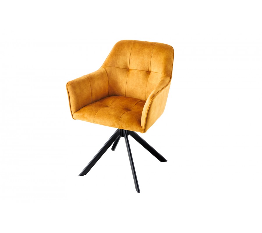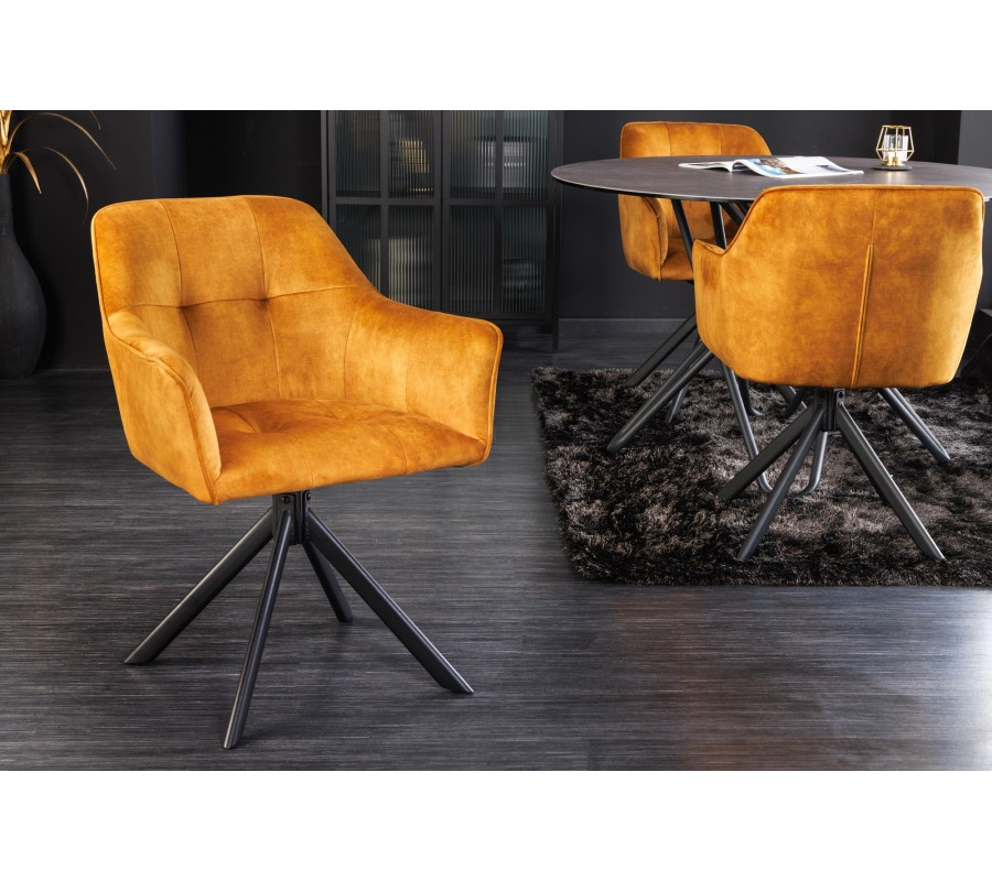 Ak hľadáte do svojich kancelárskych priestorov pohodlnú, funkčnú a zároveň dizajnovo zaujímavú stoličku, ste na správnom mieste! Stolička Devon je príťažlivá najmä vďaka svojmu nadčasovému jednoduchému dizajnu, ktorý prepája kvalitné a trvácne materiály s prvkami moderného štýlu. Disponuje príjemným zamatovým čalúnením v štýlovej okrovej farbe, ktorá vašu miestnosť rozžiari a dodá jej hravý moderný nádych. Pohodlné operadlo aj podrúčky sa postarajú o váš dokonalý komfort, či už stoličku využijete pri stolovaní alebo pri práci. Šikmé kovové nohy čiernej farby dotvárajú celkový moderný vzhľad. Vďaka možnosti otáčania stoličky o 180 stupňov je dokonalou voľbou do kancelárskych priestorov, kde oceníte ľahkú manipuláciu a možnosť pohybu. Doplnením stoličky Devon do tmavej miestnosti v kombinácii s masívnym stolom s kovovými prvkami dosiahnete industriálny nádych, zatiaľčo v svetlejšie ladenom interiéri vynikne jej moderné prevedenie s prvkami škandinávskeho štýlu.