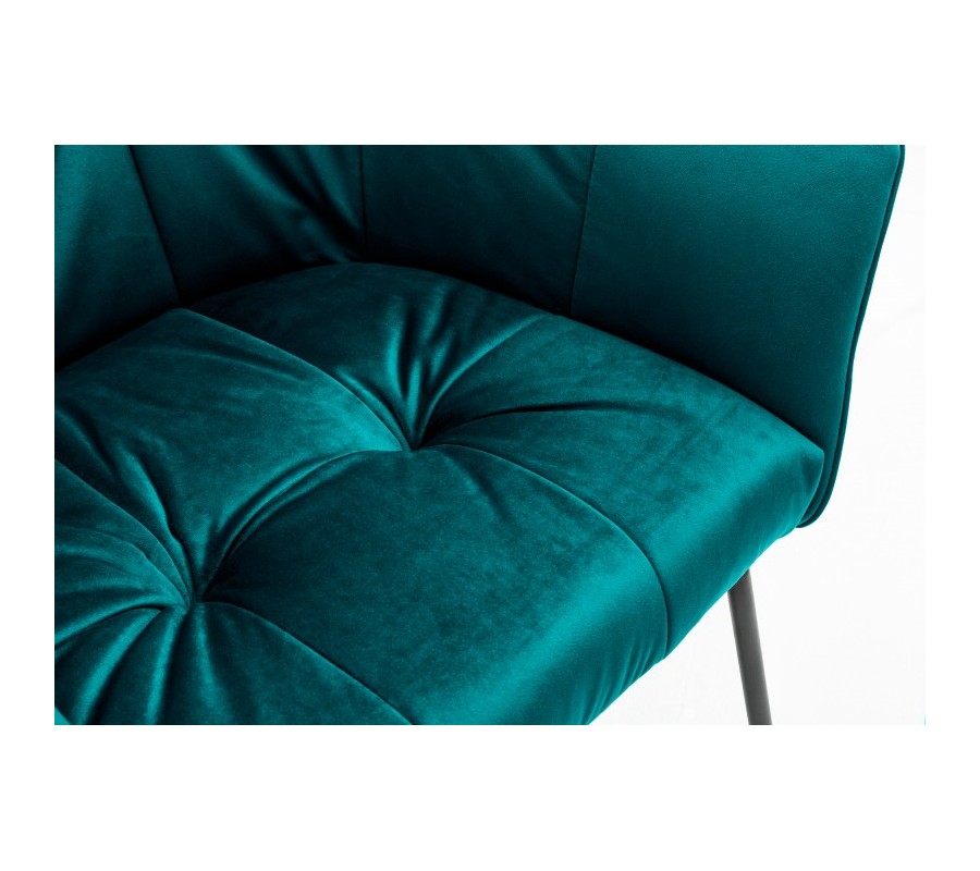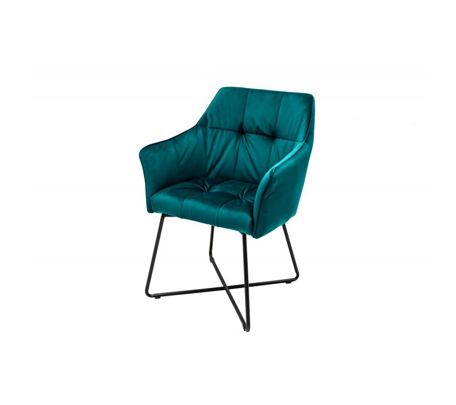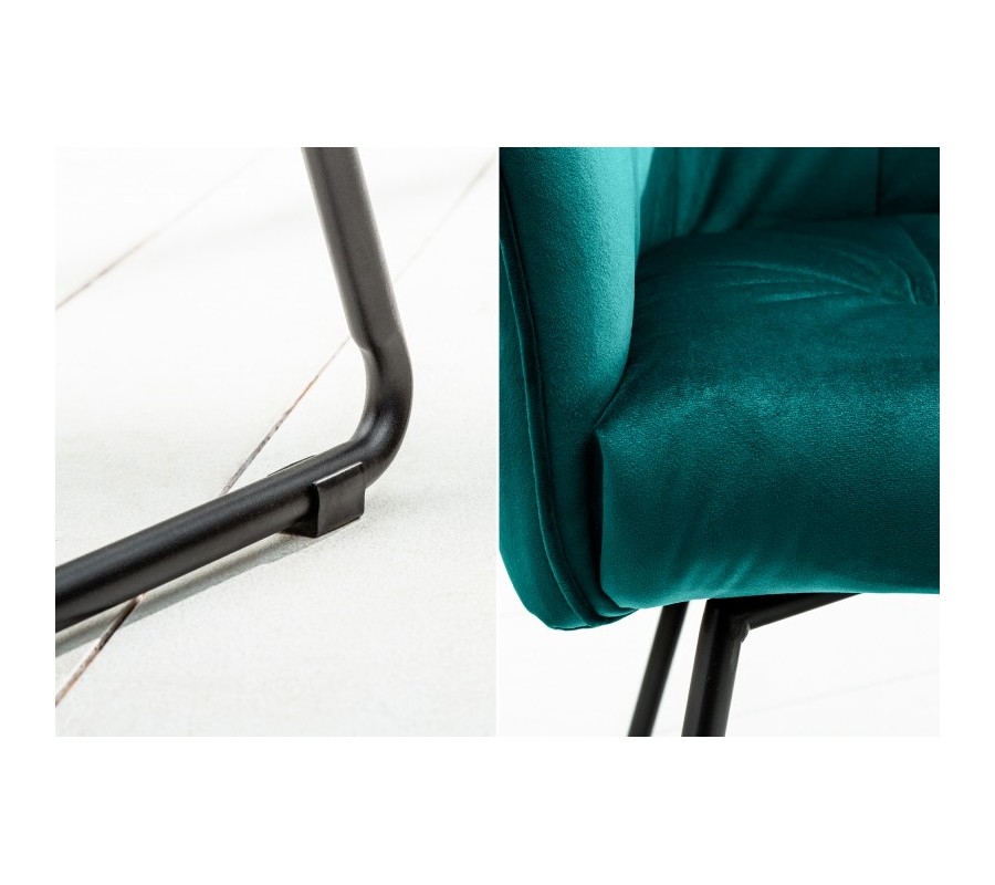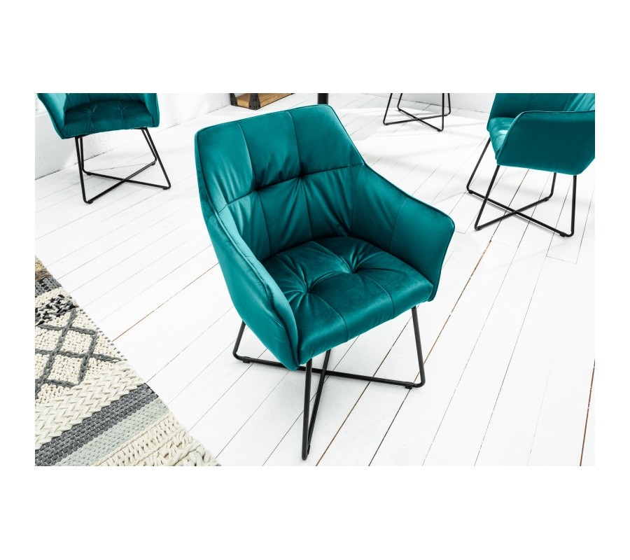 Štýlová jedálenská stolička Amala už na prvý pohľad zaujme svojím výrazným tyrkysovým čalúnením zo zamatu. Stolička tak získava štýlový vzhľad a zároveň sa postará o váš dokonalý komfort. Okrem príjemného poťahu k vášmu pohodliu prispeje aj tvarované operadlo a podrúčky. Jednoduché prešívanie na operadle dodáva stoličke elegantný vzhľad. Výrazné čalúnenie dopĺňajú jednoduché križujúce sa čierne kovové nohy, ktoré dotvárajú moderný efekt. Stoličky Amala vhodne zapadnú do moderne alebo industriálne ladených jedální. Skvelú kombináciu vytvoria napríklad s masívnym jedálenským stolom s kovovými nohami a ďalšími kovovými prvkami.