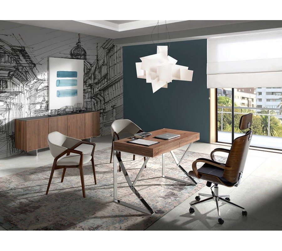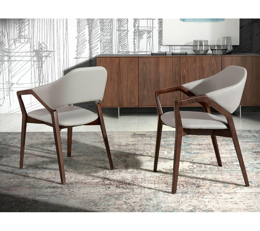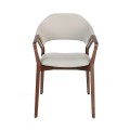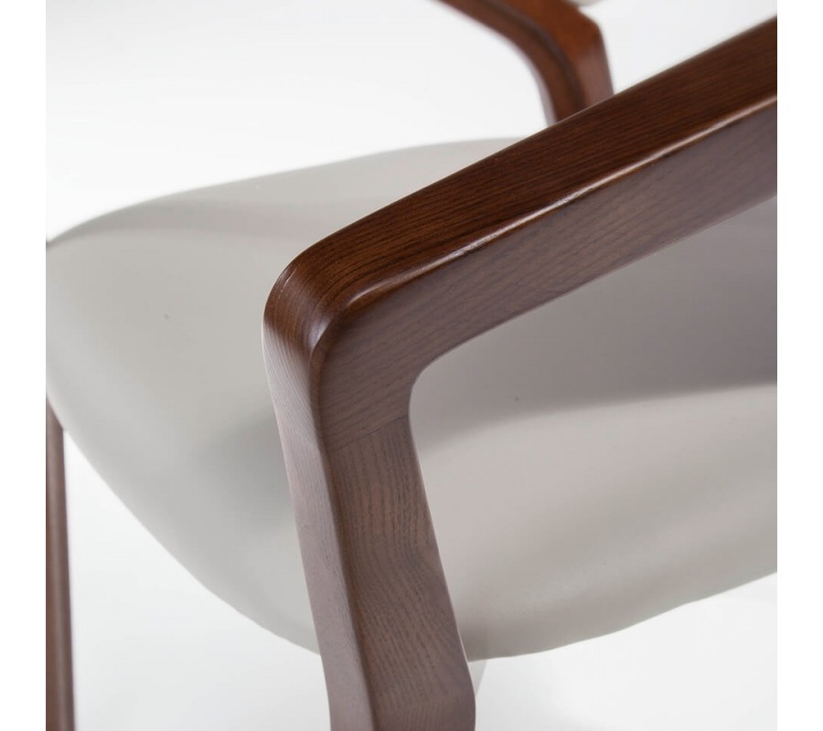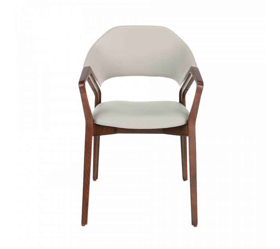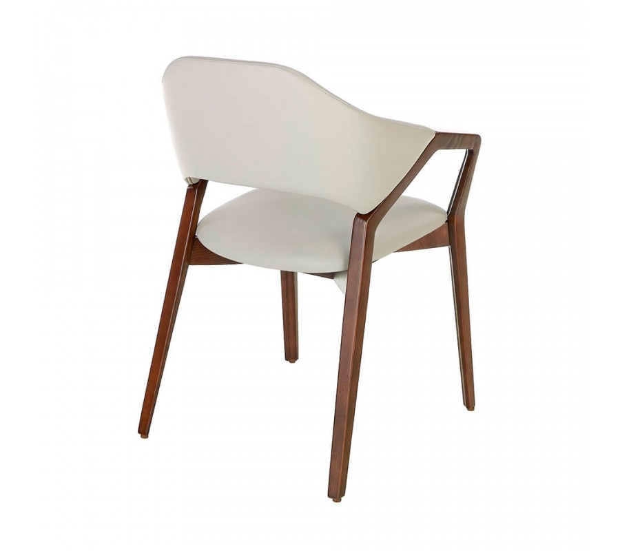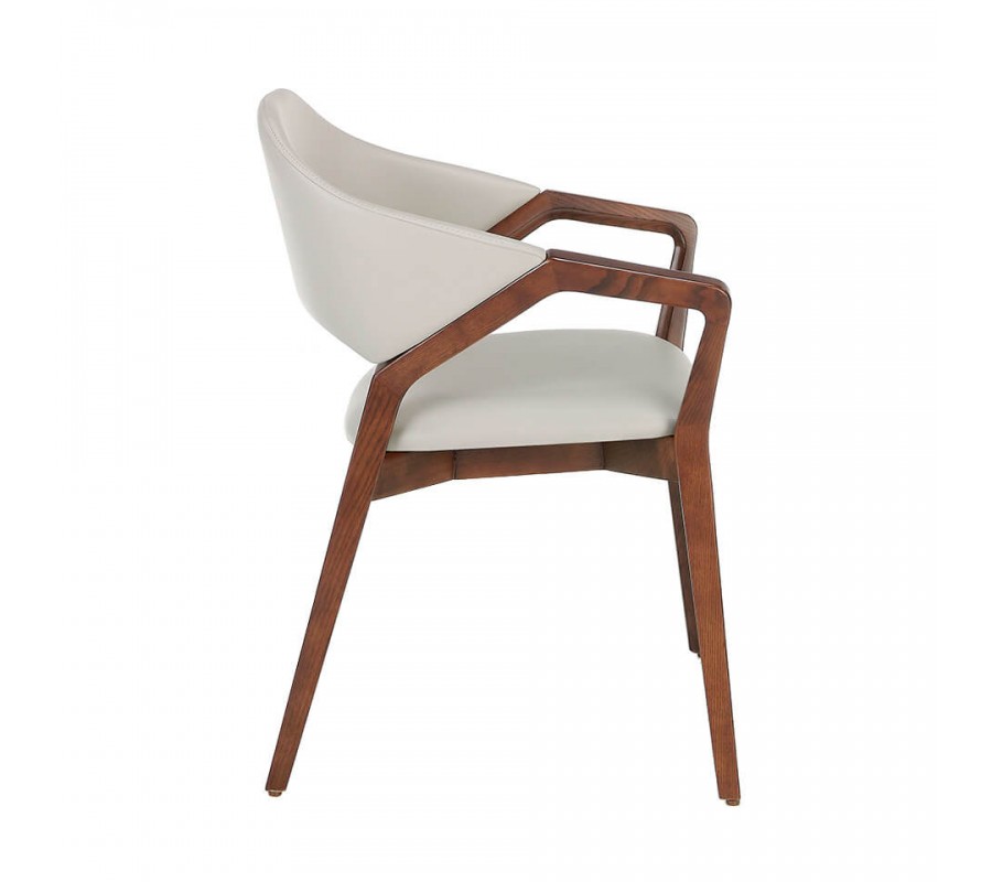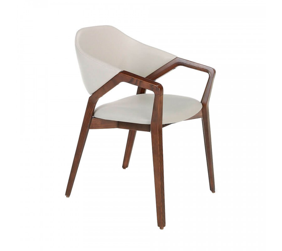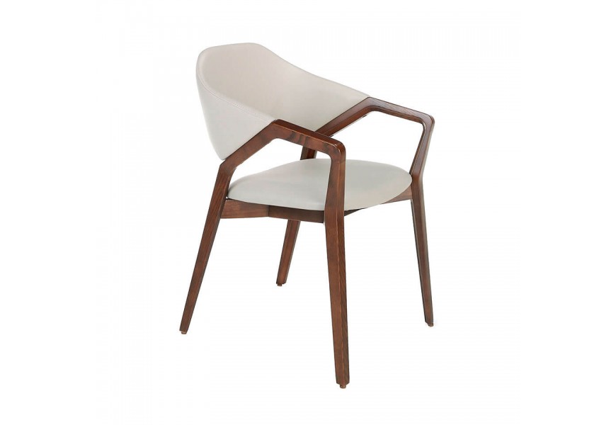 Stolička má pevný rám z masívneho dreva v bohatom orechovo hnedom odtieni. V siluete dominujú zošikmené línie, vďaka ktorým pôsobí nábytok dynamickým dojmom. Nožičky sú hranaté a plynule prechádzajú do bočných opierok atypického tvaru. Na opierky sa pripája zaoblené chrbtové operadlo, ktoré je rovnako ako aj sedadlo čalúnené. Poťah je vyrobený z kvalitnej ekokože v svetlom norkovom odtieni béžovej. Kombinácia dreva a kože pôsobí harmonickým dojmom a dodáva modernému dizajnu naturálny dotyk.