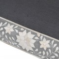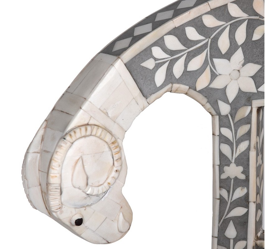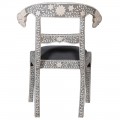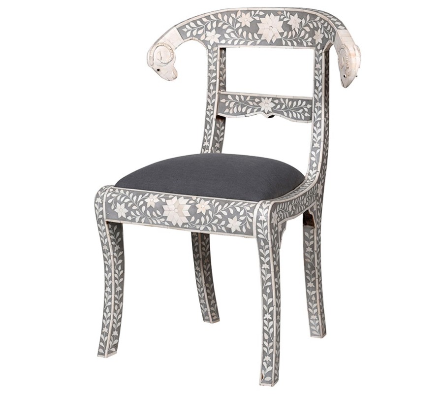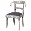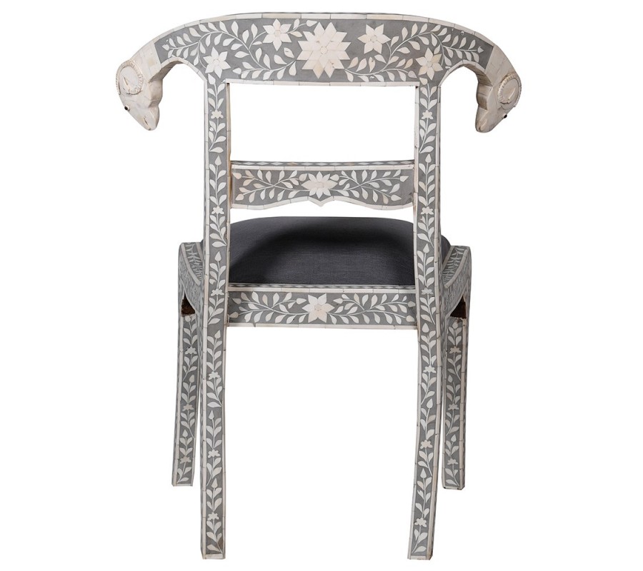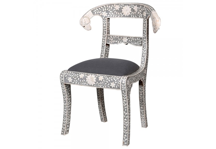 Ak hľadáte unikátny kúsok na doplnenie vintage ladenej jedálne, stoličky Garibaldi môže byť pre vás tou správnou voľbou! Jej jedinečný dizajn zaujme predovšetkým vďaka bohatému zdobeniu v podobe vyrezávaného operadla a intarzie to živice a kosti. Technikou bone inlay je vyzdobená celá drevená konštrukcia a ukladaním jednotlivých kúskov materiálu v sivej a bielej farbe vytvára nádherné florálne a a prírodné ornamenty. Jemne zaoblené operadlo po bokoch ukončuje zdobenie s motívom baranej hlavy. Unikátna konštrukcia stoličky Garibaldi je doplnená príjemnou čalúnenou sedacou časťou tmavosivej farby, vďaka čomu si môžete pri stolovaní či pri práci dopriať komfort. Tento nádherný dizajn spestrí a zútulní priestory predovšetkým vintage jedální či tématicky ladených kaviarní. Odporúčame stoličky Garibaldi kombinovať aj s rovnomenným príručným stolíkom a výraznými doplnkami v štýle vintage.