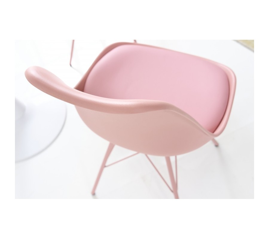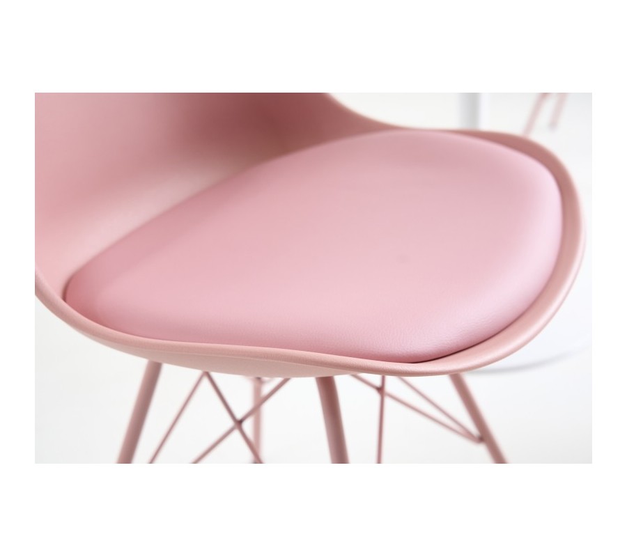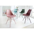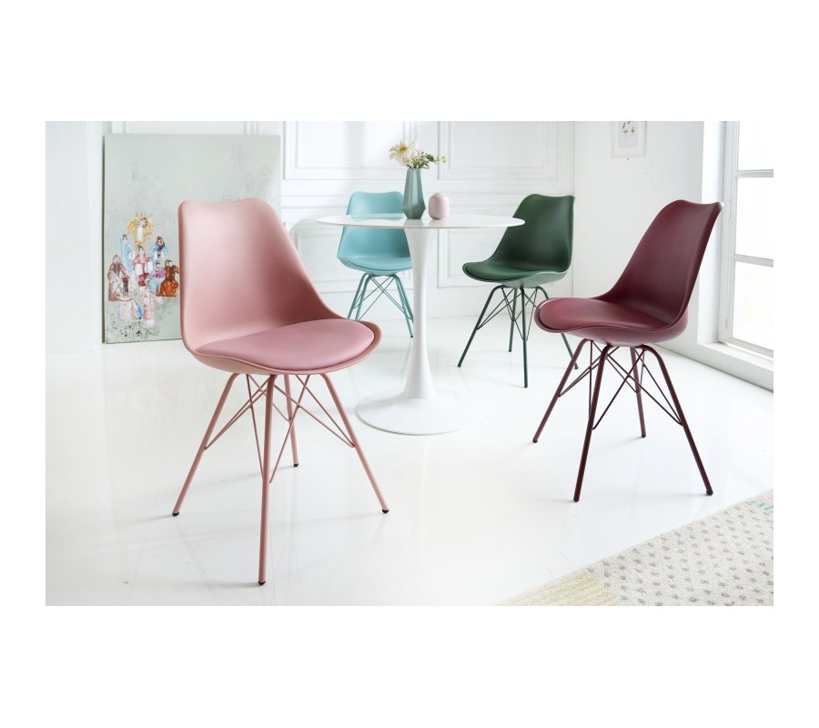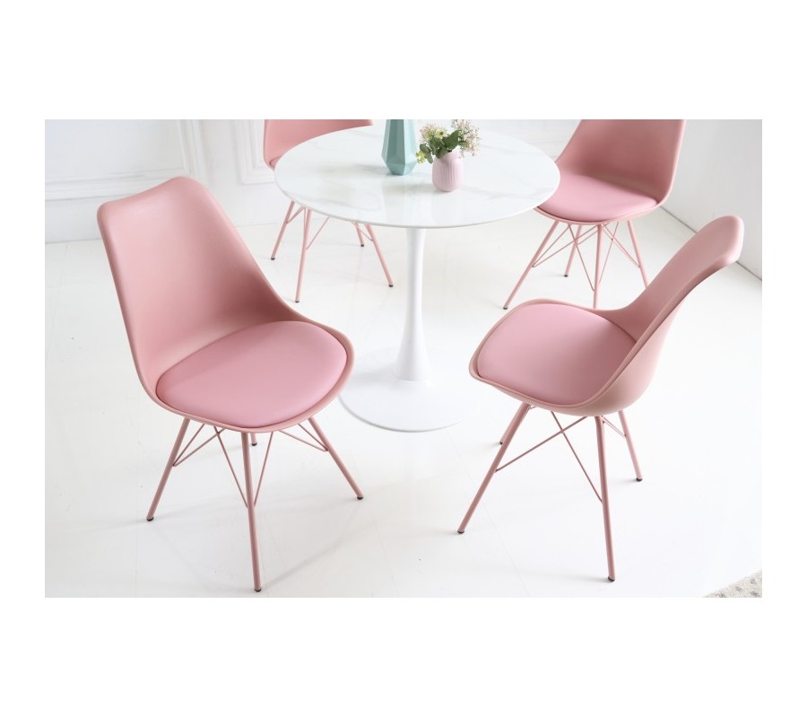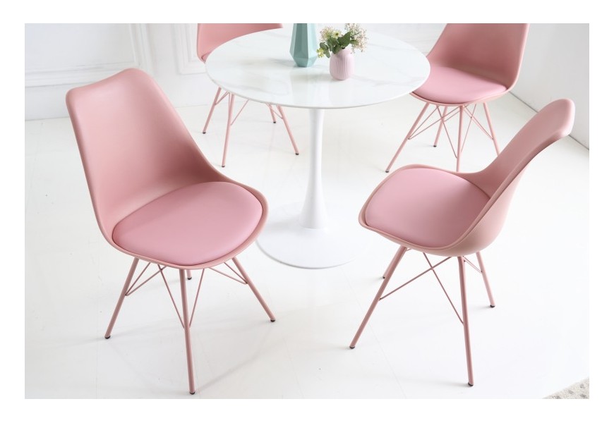 Dizajnová jedálenská stolička z kolekcie nábytku Scandinavia disponuje príjemným moderným vzhľadom v ružovej farbe. Moderná jedálenská stolička Scandinavia Vám ponúka svetlé čalúnenie z ekokože na podsedáku. Kovové nožičky a opierka z kvalitného pevného umelohmotného materiálu majú tiež rovnaký odtieň svetlej ružovej, čím vzniká celistvé, ľahko kombinovateľné farebné vyhotovenie. Minimalistický, no zato moderný vzhľad jedálenskej stoličky Scandinavia je obohatený o svoju komfortnú stránku v podobe mäkko polstrovanej sedacej časti s rozmermi 45x39cm a jemne zaoblenej chrbtovej opierke s výškou 41cm. Moderný vzhľad jedálenskej stoličky Scandinavia vynikne najmä vo svetlých jedálňach v kombinácií s bielymi stolmi s mramorovou vrchnou doskou a zaoblenou stredovou nohou.