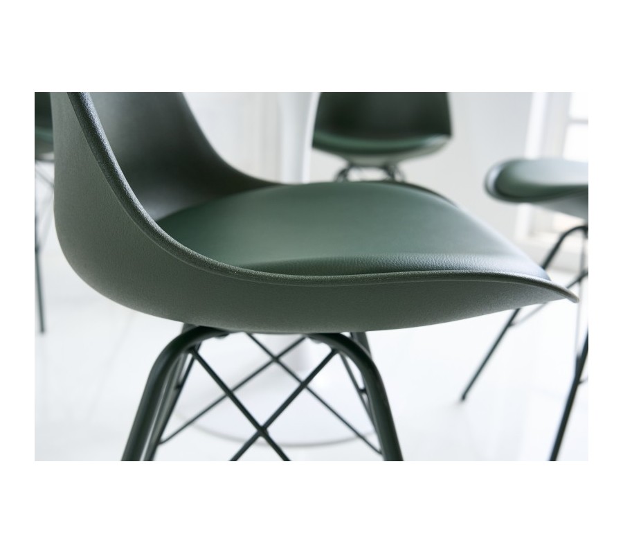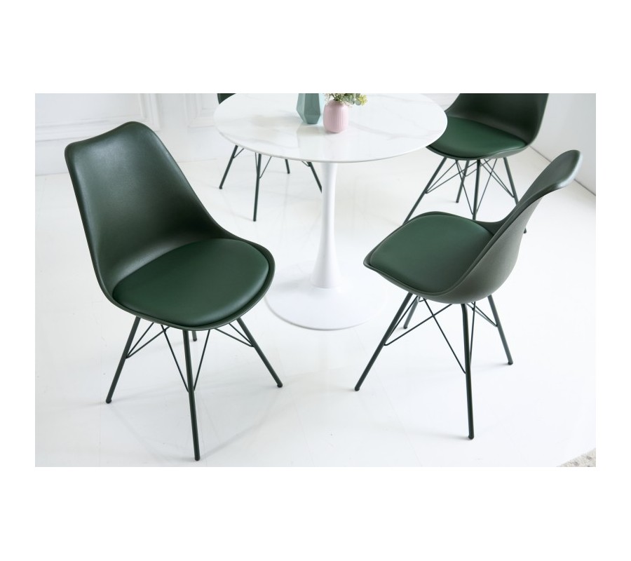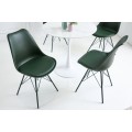 Kolekcia jedálenských stoličiek Scandinavia Vám prináša jedinečný kúsok, ktorý svojím farebným prevedením a celkovým vzhľadom nielen krásne zapadne do Vašej jedálne, ale taktiež Vám prinesie aj jemný nádych retro štýlu. Dizajnová jedálenská stolička Scandinavia sa pýši príjemným čalúnením z eko kože na podsedáku, ku ktorému je doplnená pevná opierka z kvalitnej umelej hmoty s podobnou štruktúrou. Nožičky sú vyrobené z kovu. Všetky časti majú nádherný zemitý, tmavozelený odtieň, čo vytvorí jednotný štýlový vzhľad. Pohodlie pri sedení Vám zaručí mäkké polstrovanie sedacej časti s rozmermi 50x45x39cm, a jemne zaoblená chrbtová opierka, ktorá je 41cm vysoká. Tmavo zelená farba jedálenskej stoličky Scandinavia perfektne vynikne vo svetlých moderných jedálňach v kombinácií s bielym jedálenským stolom, kde farba čalúnenia vytvorí veľmi modernú farebnú kombináciu, umocnenú dizajnovými doplnkami.