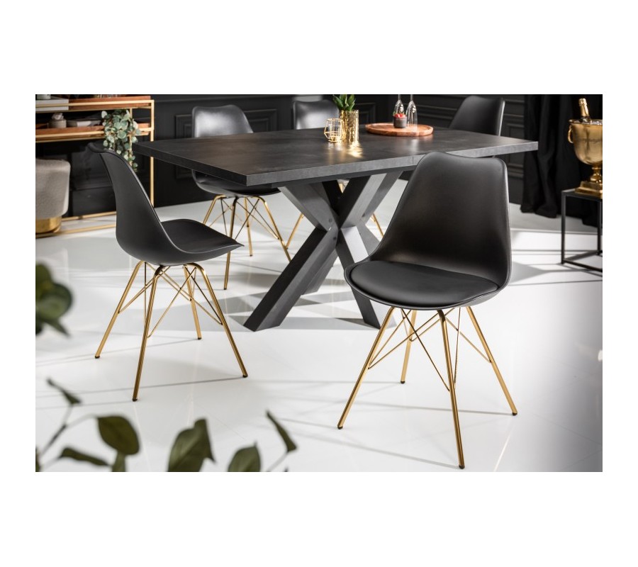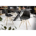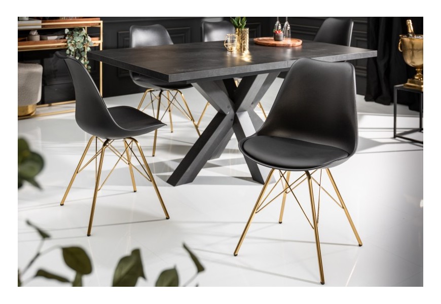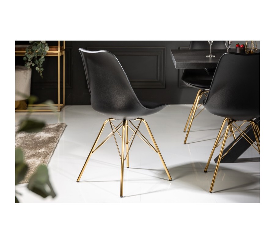 Milovníci art-deco, či glamour štýlu si vďaka svojmu dizajnu zaručene obľúbia jedálenskú stoličku z kolekcie jedálenského nábytku Scandinavia. Art-deco štýlová jedálenská stolička Scandinavia sa pýši nadčasovým čiernym vyhotovením z eko-kože, čo je doplnené dizajnovými kovovými nožičkami v zlatej farbe a pevnou platstovou opierkou s podobnou štruktúrou ako podsedák. Kombinácia čiernej a zlatej farby pôsobí veľmi luxusne a moderne, pričom čalúnenie z eko-kože iba umocní tento vzhľad. Jedálenská stolička Scandinavia disponuje 40cm vysokou chrbtovou opierkou a sedacou časťou s rozmermi 45x40, ktorá je od zeme vzdialená 48cm. Dizajnovú jedálenskú stoličku Scandinavia odporúčame kombinovať v moderných interiéroch so zlatými dekoráciami v art-deco štýle, s čiernymi príborníkmi na zlatých nožičkách, a taktiež s čiernymi kovovými alebo mramorovými jedálenskými stolmi.