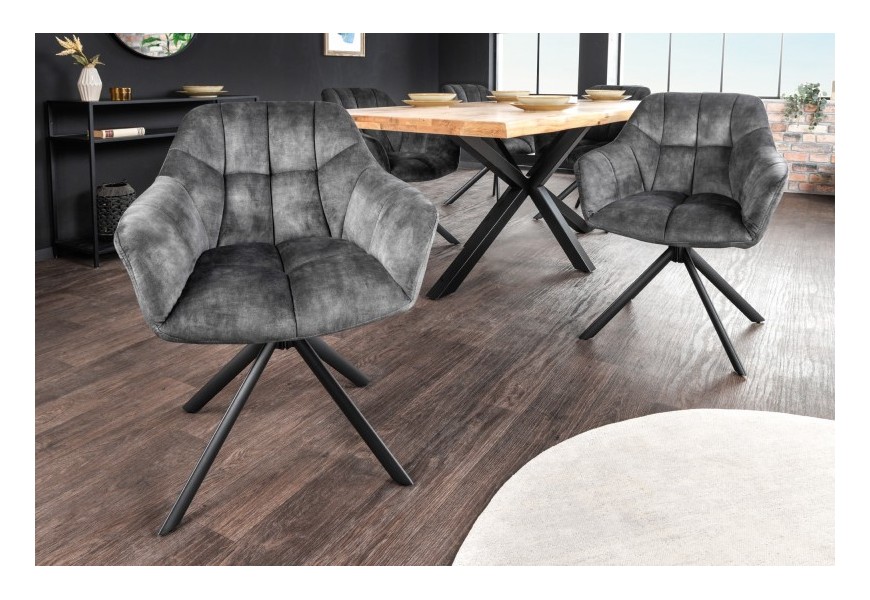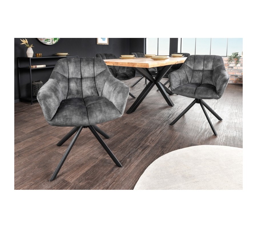 Doplňte svoju jedáleň dizajnovými stoličkami Mariposa, ktoré vás potešia na pohľad i na dotyk! Dominantou ich dizajnu je tmavosivé čalúnenie zo zamatu, ktoré pôsobí vysoko elegantným dojmom aj vďaka jemnému prešívaniu. Zamat pôsobí luxusným dojmom a zároveň vám dopraje dokonalé pohodlie, ku ktorému tiež pomáha mäkká polstrovaná sedacia časť a komfortne tvarované operadlo s podrúčkami. Čierne zošikmené nohy z kovu sa zasa postarajú o výbornú stabilitu a do vzhľadu stoličky vnášajú nádych industriálneho štýlu. veľkou výhodou stoličky Mariposa je tiež otočný mechanizmus, ktorý vám uľahčí pohyb pri práci, stolovaní či posedení s priateľmi. Stoličky Mariposa sú vhodným riešením na doplnenie jedální, kuchýň či obývačiek, no skvelo poslúžia aj pri zariaďovaní reštaurácií, zasadacích miestností či hotelových lobby barov. Pre dokonalý moderný súlad odporúčame stoličky Mariposa kombinovať s tmavým industriálne ladených stolom z kovu a dreva, kovovou komodou či príborníkom a kontrastnými doplnkami vo výrazných farbách.