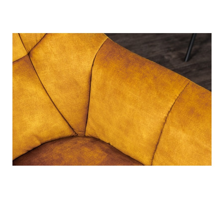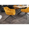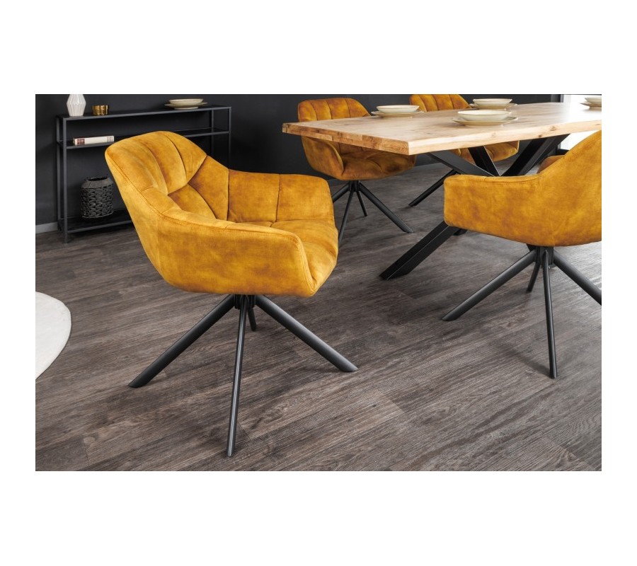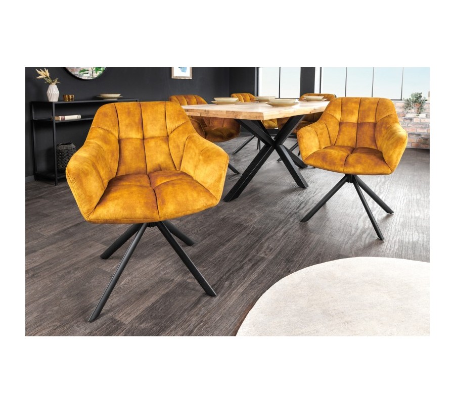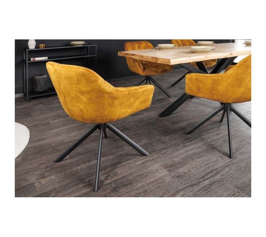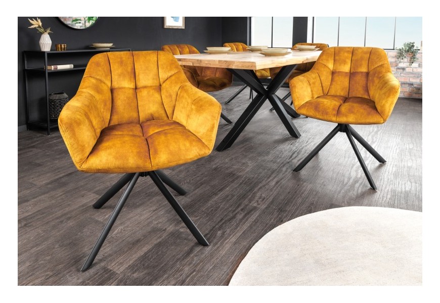 Jedálenská stolička Mariposa v modernom štýle je dizajnový kúsok nábytku, ktorý sofistikovane spája komfort s estetickým vzhľadom. Stolička je tvorená sedacou časťou a tvarovaným operadlom so žiarivým horčicovožltým čalúnením, ktoré zaujme už na prvý pohľad. Poťah zo zamatu je však okrem pútavého vzhľadu príjemný aj na dotyk a postará sa o vaše pohodlie. K tomu prispeje aj komfortné tvarovanie operadla a praktické podrúčky. Poteší vás tiež otočný mechanizmus uľahčujúci váš pohyb. Výrazný žltý pohľad je doplnený elegantným prešívaním dotvárajúcim moderný vzhľad. Kontrast do dizajnu stoličky Mariposa vnášajú mohutné zošikmené kovové nohy čiernej farby vytvárajúce jemný industriálny nádych. Dizajnové stoličky tak skvelo zapadnú do moderne i priemyselne ladených interiérov. Svoje miesto si nájdu v jedálňach či kuchyniach, ale vďaka poskytovanému komfortu sú tiež skvelým riešením do zasadacích miestností či pracovných priestorov. Svojím farebným prevedením vyniknú stoličky Mariposa v kombinácii s čiernym masívnym alebo kovovým stolom a industriálnym kovovým nábytkom.